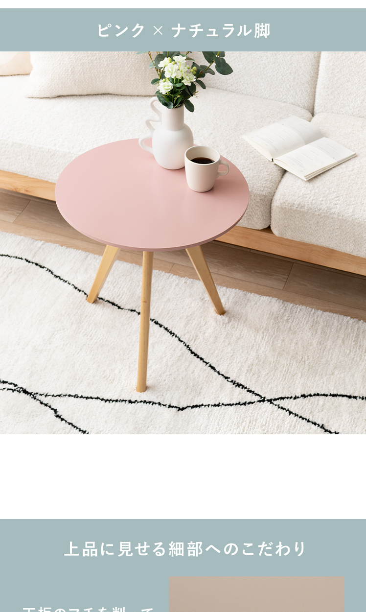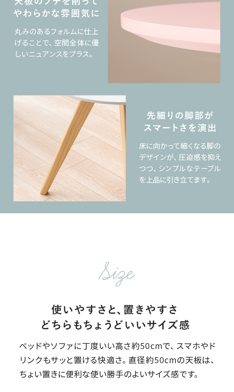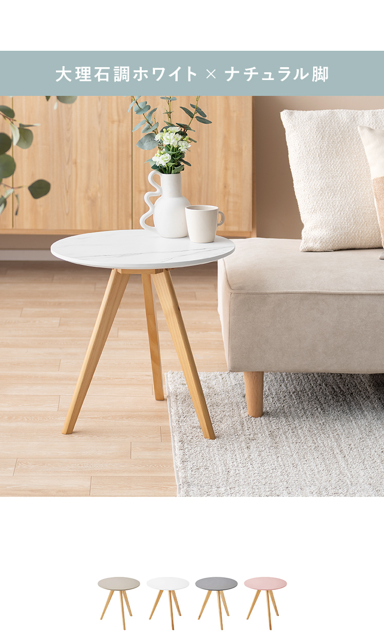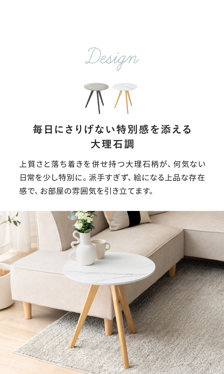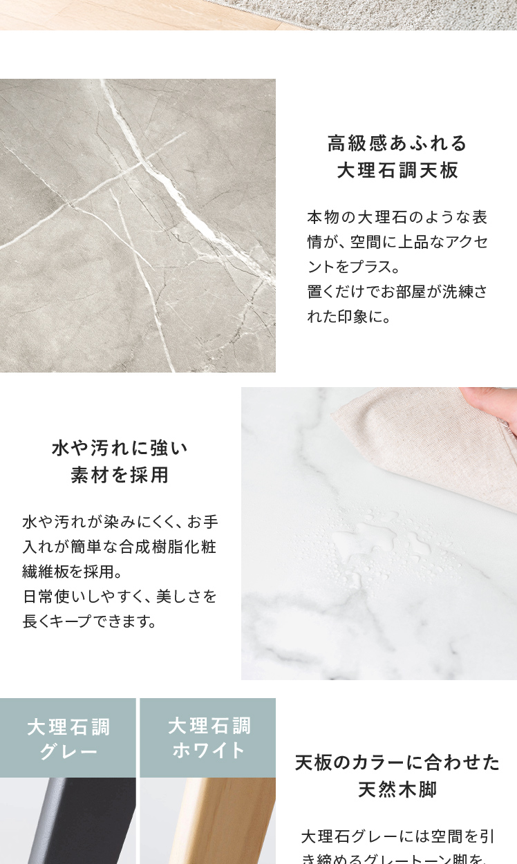 | 材質 | 〔大理石調グレー/大理石調ホワイト/くすみホワイト〕天板/合成樹脂化粧繊維板、脚部/天然木パイン材(ラッカー塗装仕上げ) 〔くすみグレー/くすみベージュ/くすみピンク〕天板/繊維板、脚部/天然木パイン材(ラッカー塗装仕上げ) |