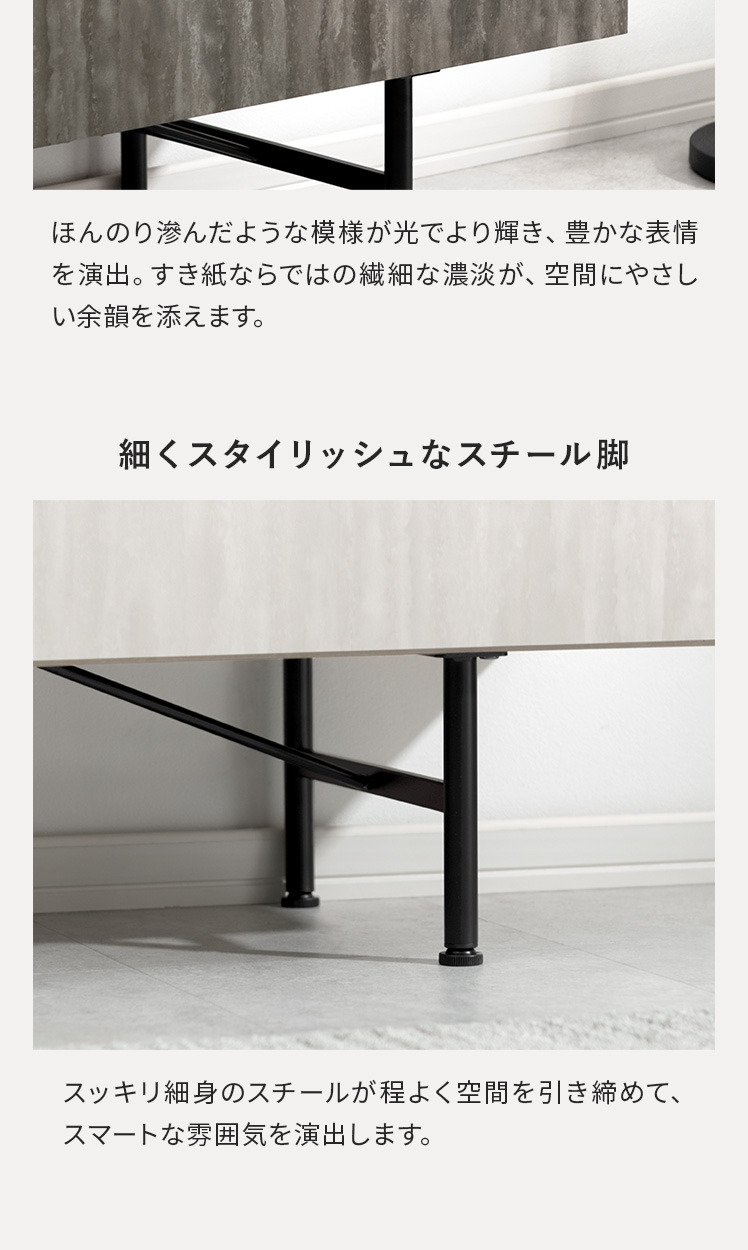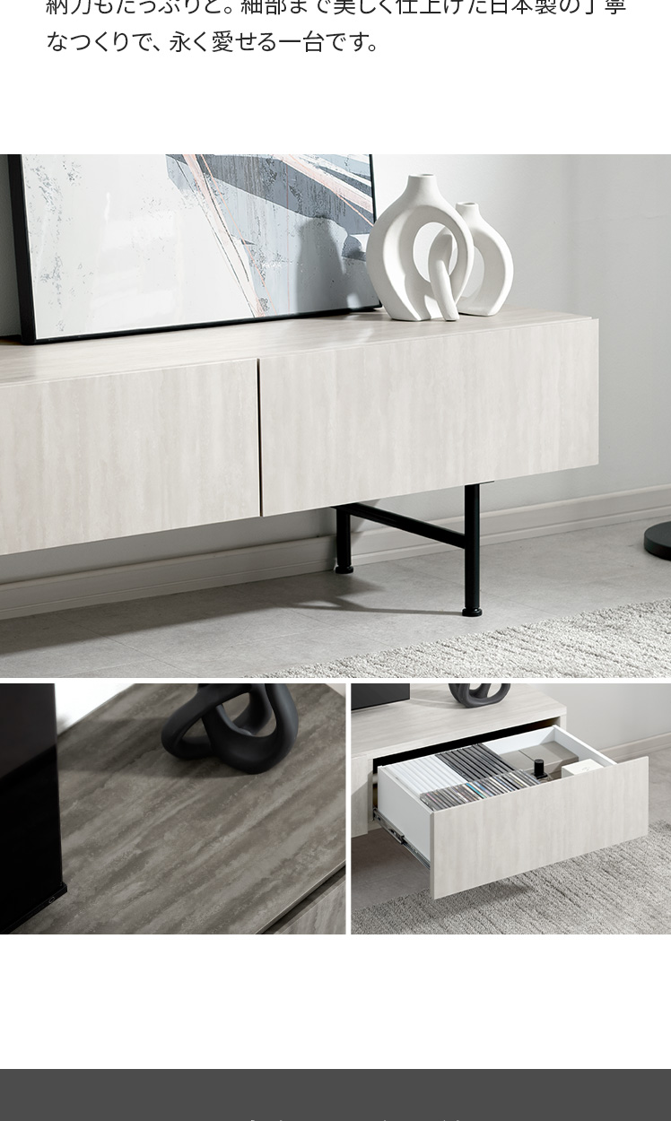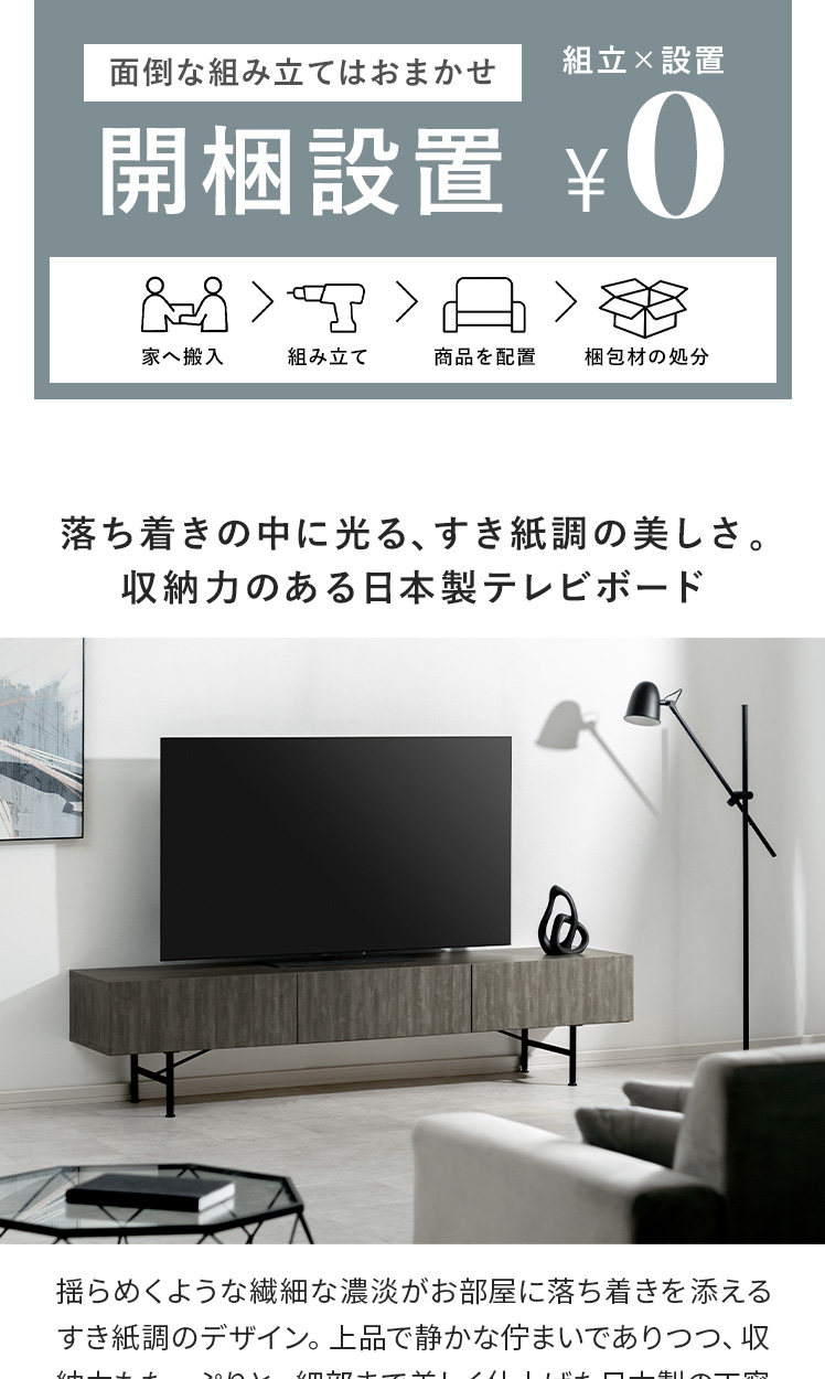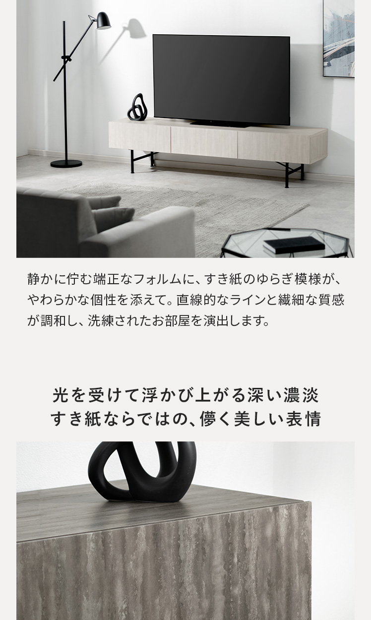 テレビボード SERO〔セロ〕180cm幅/揺らめくような繊細な濃淡がお部屋に落ち着きを添えるすき紙調のデザイン。上品で静かな佇まいでありつつ、収納力もたっぷりと。細部まで美しく仕上げた日本製の丁寧なつくりで、永く愛せる一台です。