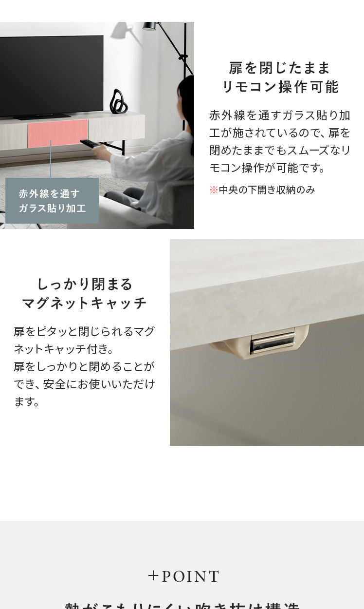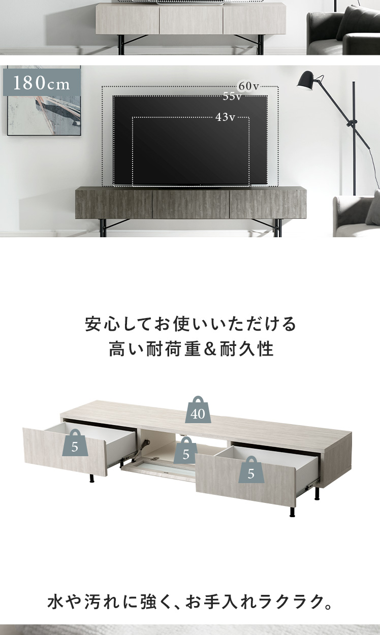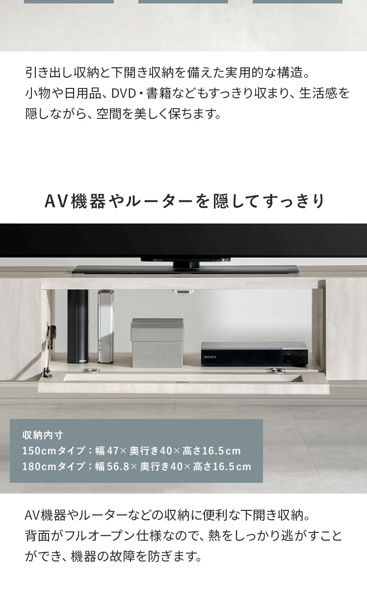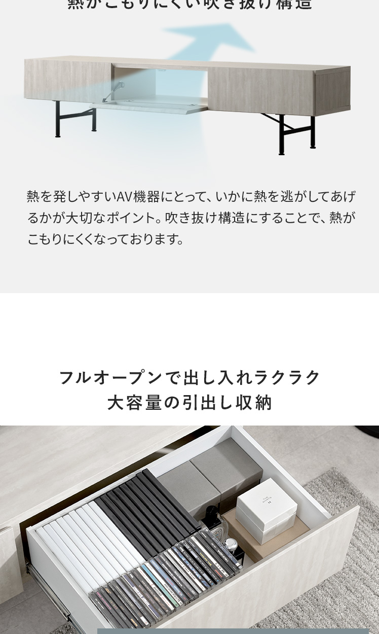 | 備考 | 組立式(組立て時間約20分) ※若干の個体差により、表記サイズと多少の差異が生じる場合がございます。 ※中央収納のリモコン操作について、機器の受光部が低い位置にある場合、扉を閉じた状態では赤外線が届きにくいことがあります。その際は、受光部が扉から離れるように設置してください。 |