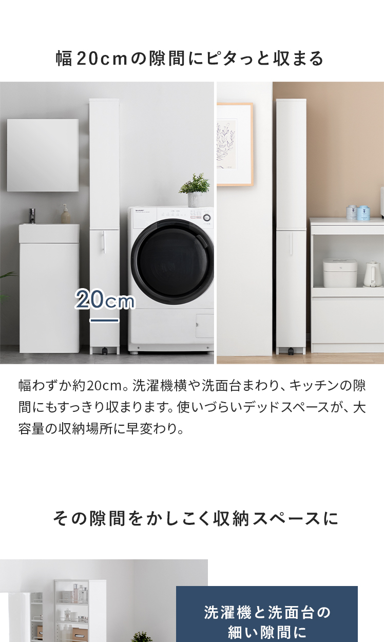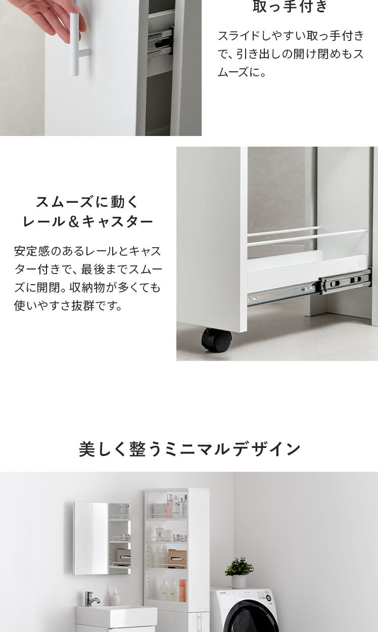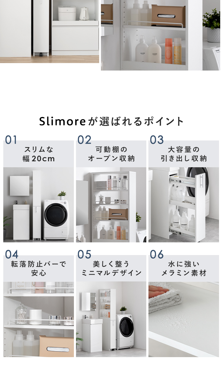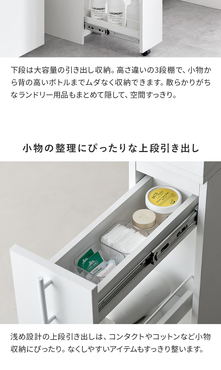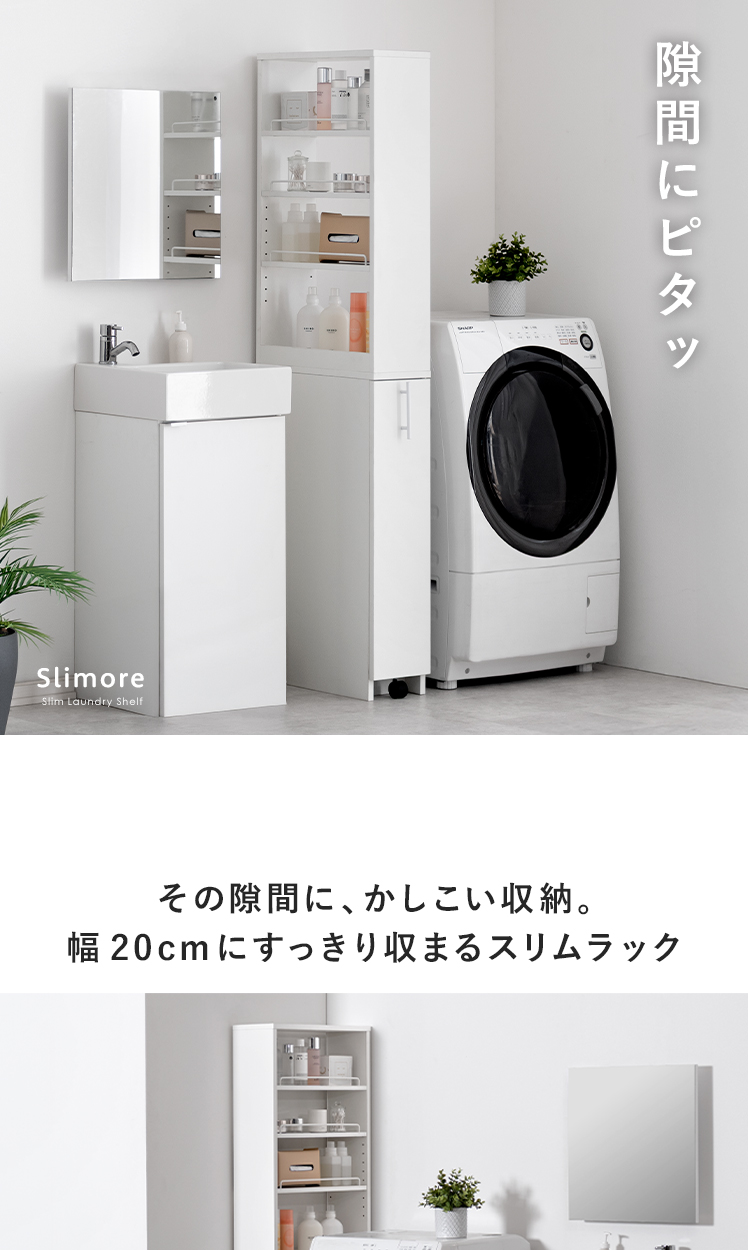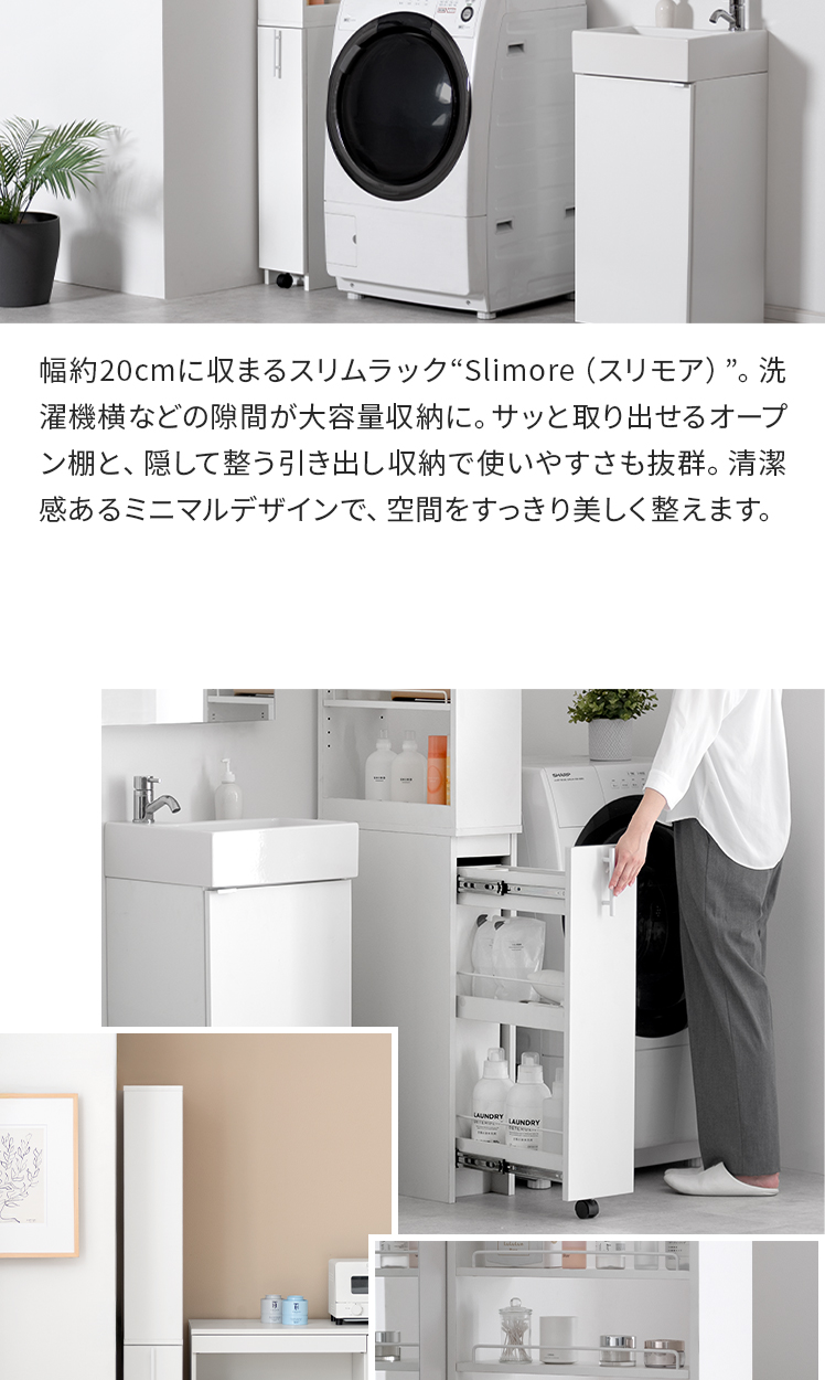 スリムランドリーラック Slimore〔スリモア〕/幅約20cmに収まるスリムラック“Slimore(スリモア)”。洗濯機横などの隙間が大容量収納に。サッと取り出せるオープン棚と、隠して整う引き出し収納で使いやすさも抜群。清潔感あるミニマルデザインで、空間をすっきり美しく整えます。