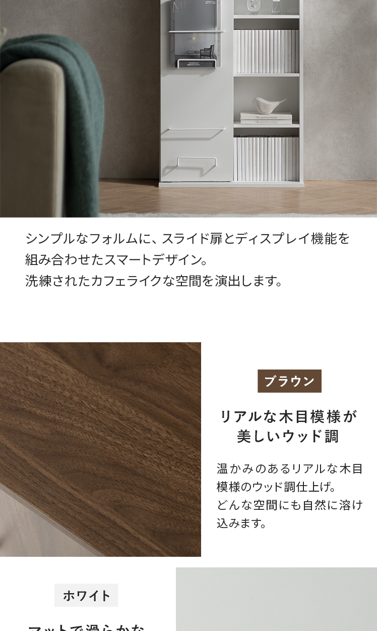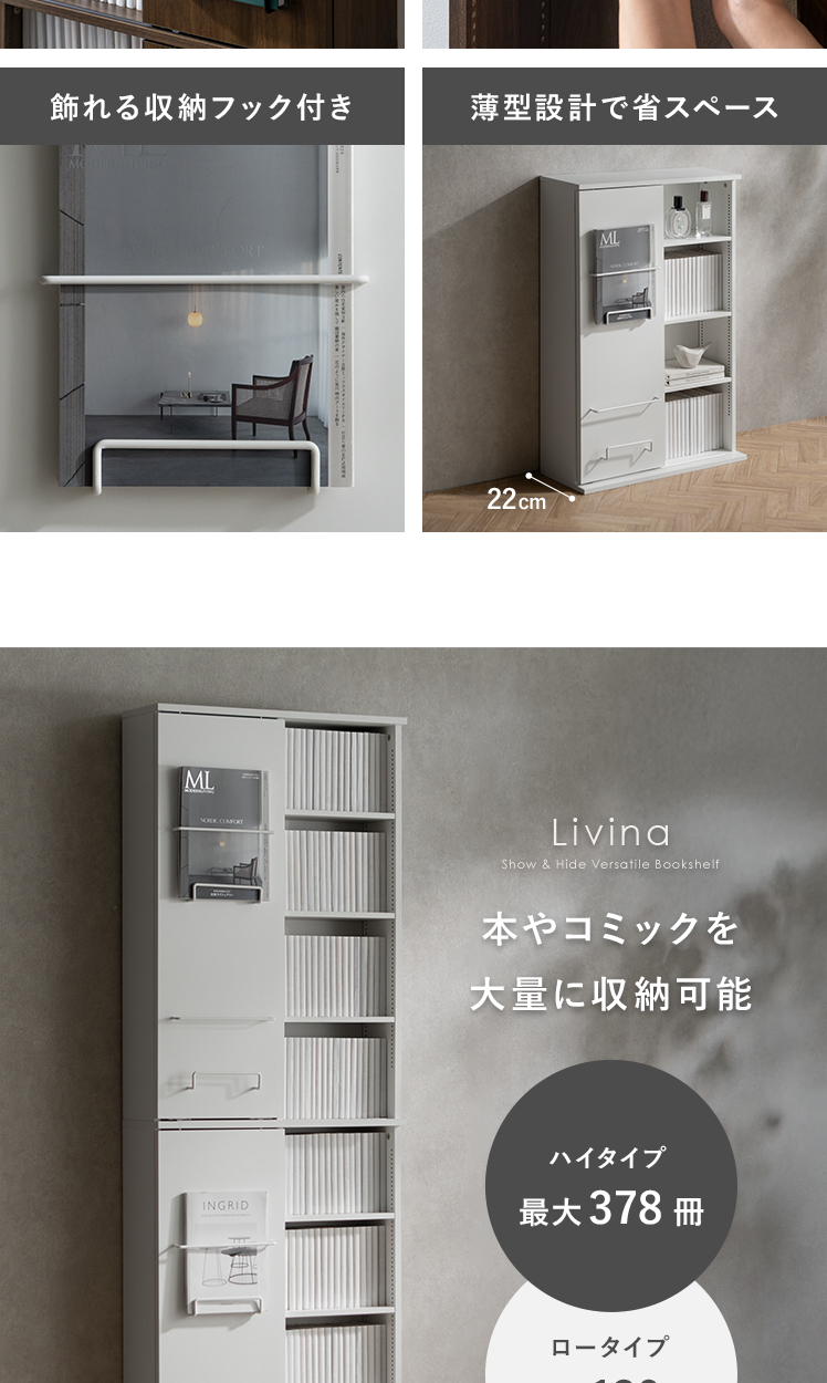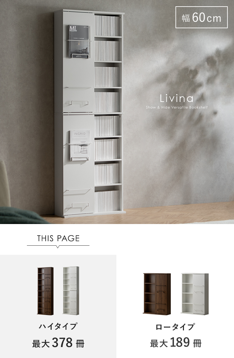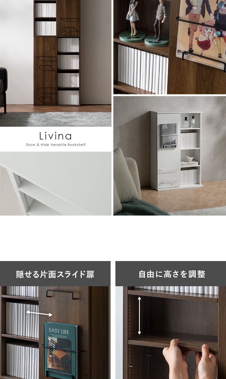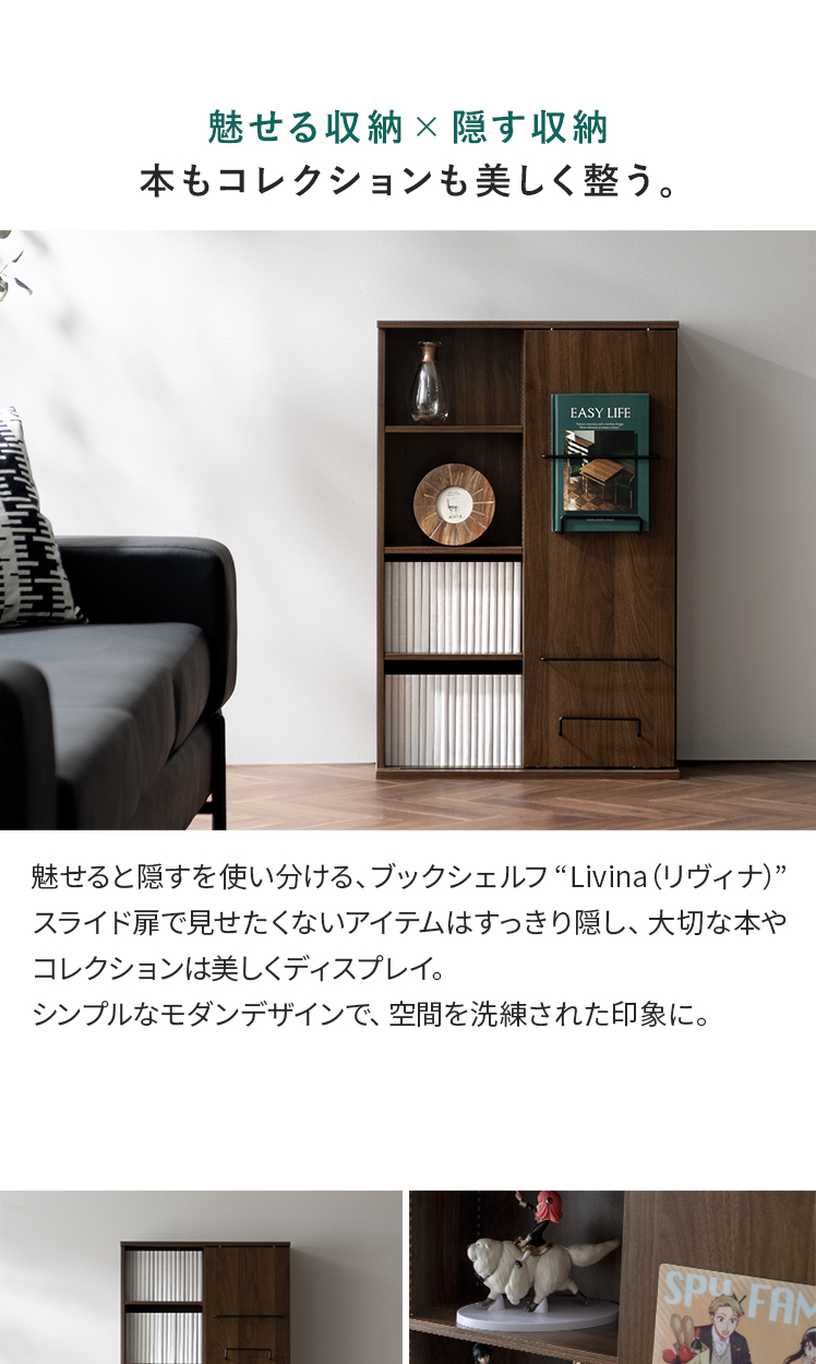 ブックシェルフ Livina〔リヴィナ〕ハイタイプ/魅せると隠すを使い分ける、ブックシェルフ “Livina(リヴィナ)”スライド扉で見せたくないアイテムはすっきり隠し、大切な本やコレクションは美しくディスプレイ。シンプルなモダンデザインで、空間を洗練された印象に。