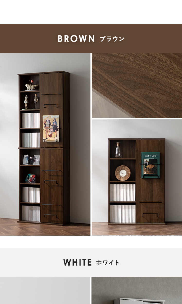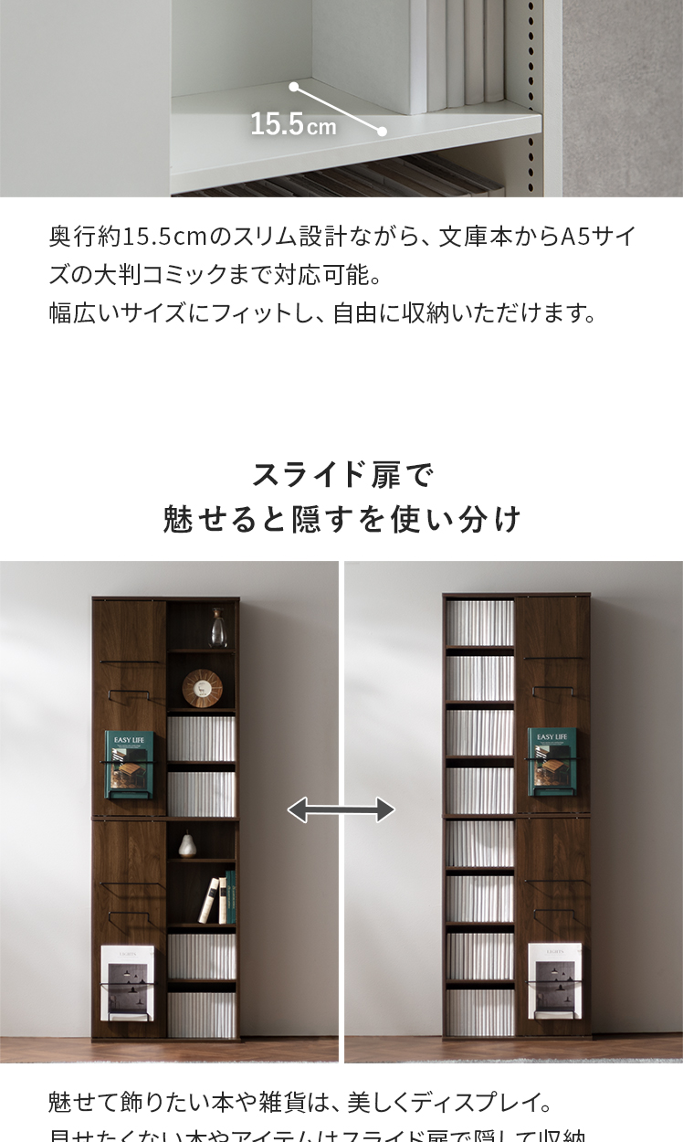 本棚 ハイタイプ 大容量収納 スライド扉 隠せる ディスプレイ 推し活 コレクション スリム おしゃれ ラック 大容量 収納棚 棚 薄型 コンパクト コミックラック ブックシェルフ 8段 書棚 リビング 収納 インテリア シンプル 北欧 モダン 省スペース ブラウン ホワイト【5%OFFクーポン対象|公式なら毎日お得】