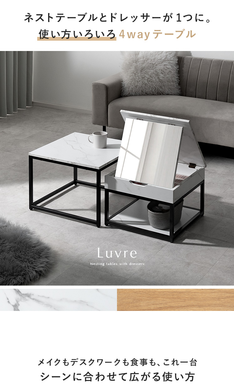 ドレッサーネストテーブル Luvre〔ルーブル〕/毎朝のメイク時はドレッサーとして。使わない時はスッキリ重ねて省スペース。来客時には並べて広々と使用したり、2台をそれぞれ独立させて使うことも。暮らしに寄り添うドレッサーテーブルです。
