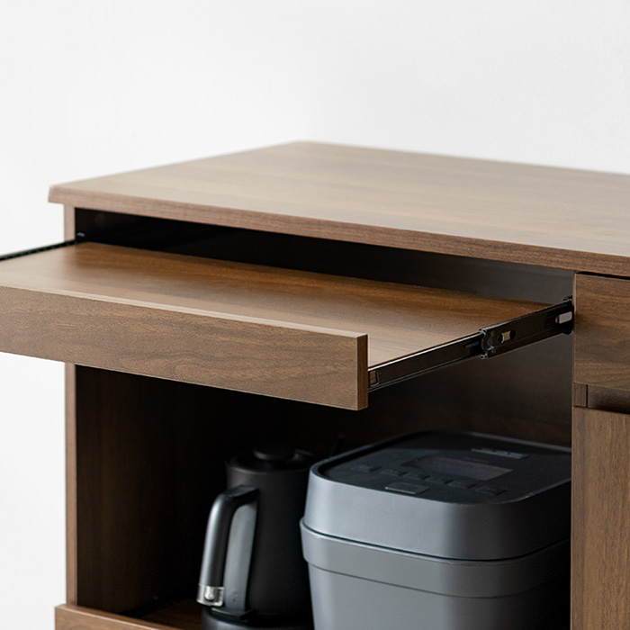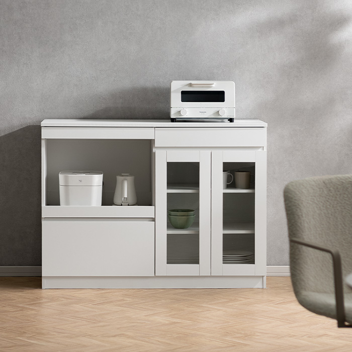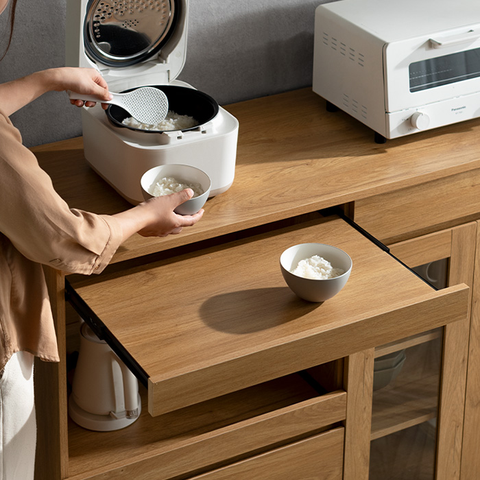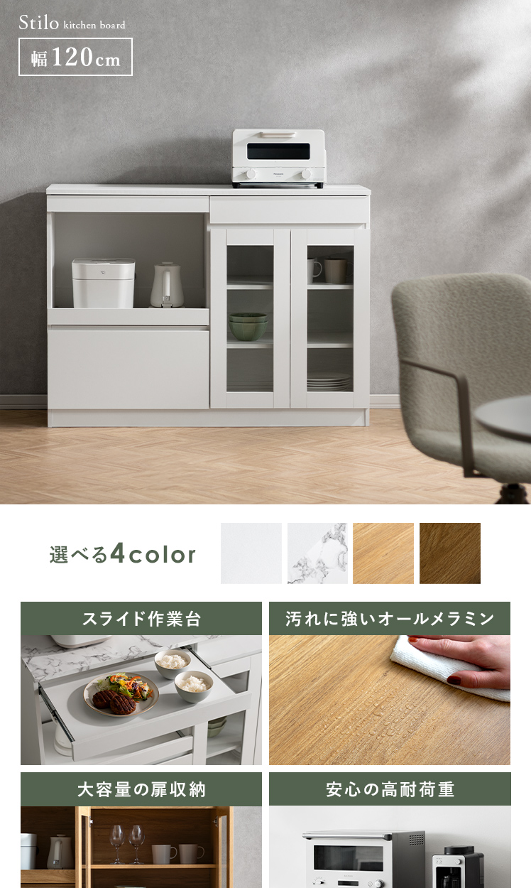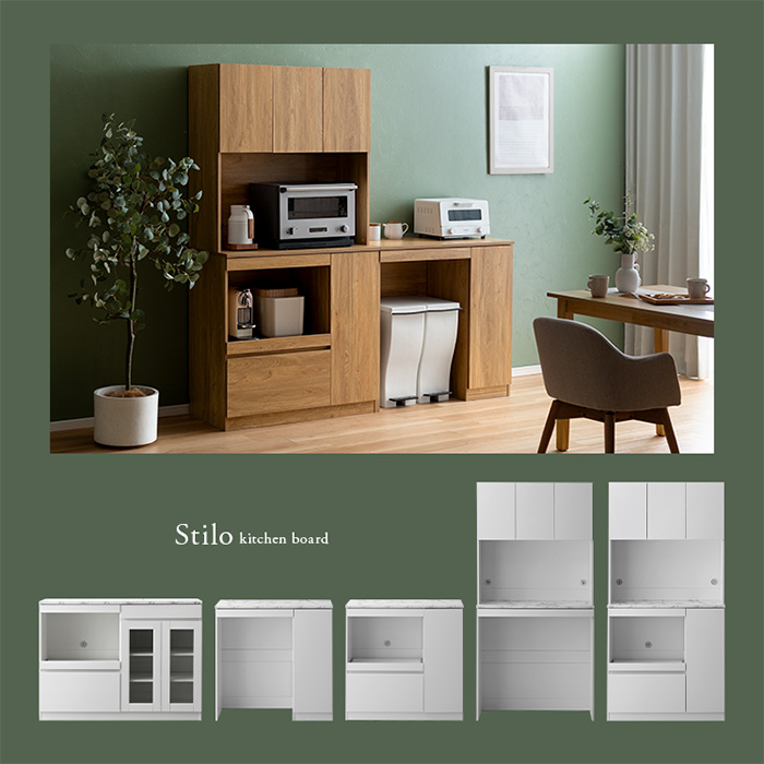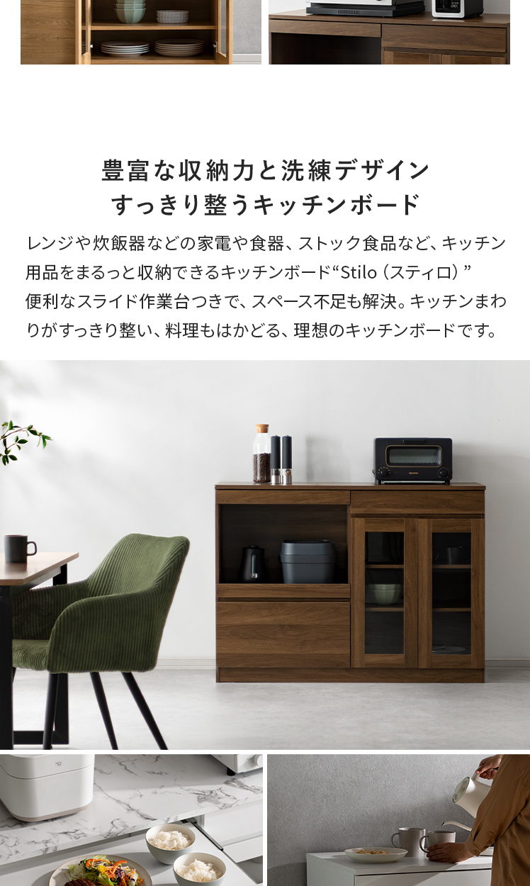 キッチンローボード Stilo〔スティロ〕/レンジや炊飯器などの家電や食器、ストック食品など、キッチン用品をまるっと収納できるキッチンボード“Stilo(スティロ)”便利なスライド作業台つきで、スペース不足も解決。キッチンまわりがすっきり整い、料理もはかどる、理想のキッチンボードです。