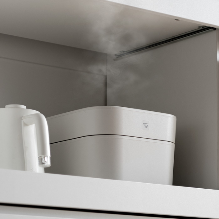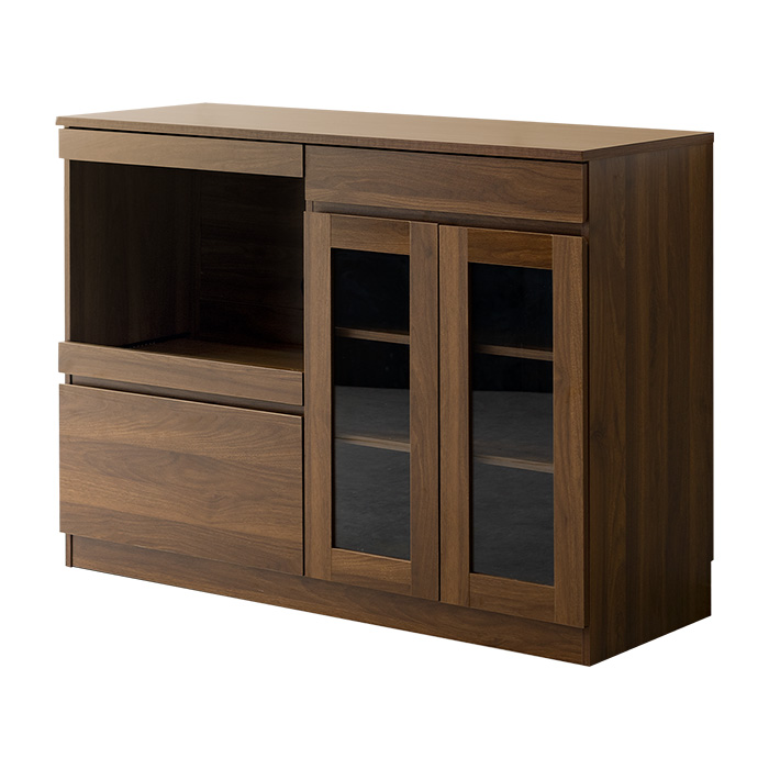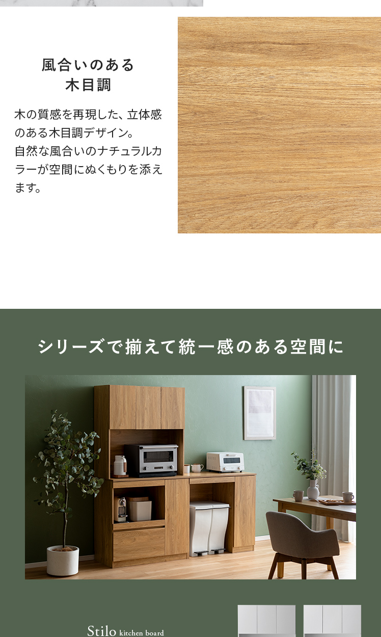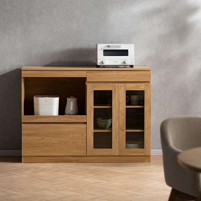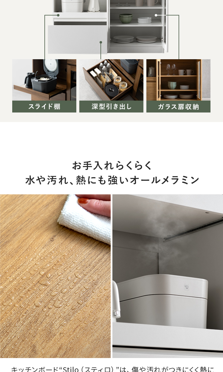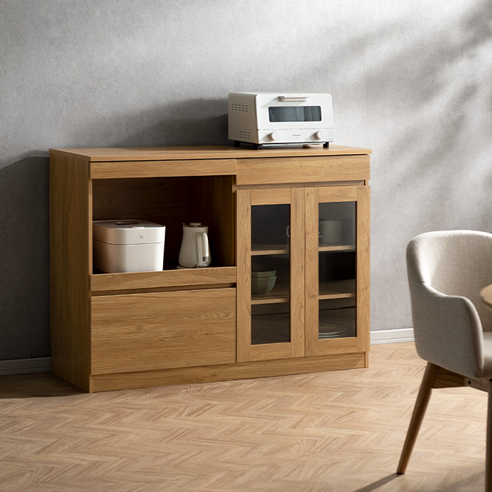 キッチンローボード Stilo〔スティロ〕/レンジや炊飯器などの家電や食器、ストック食品など、キッチン用品をまるっと収納できるキッチンボード“Stilo(スティロ)”便利なスライド作業台つきで、スペース不足も解決。キッチンまわりがすっきり整い、料理もはかどる、理想のキッチンボードです。