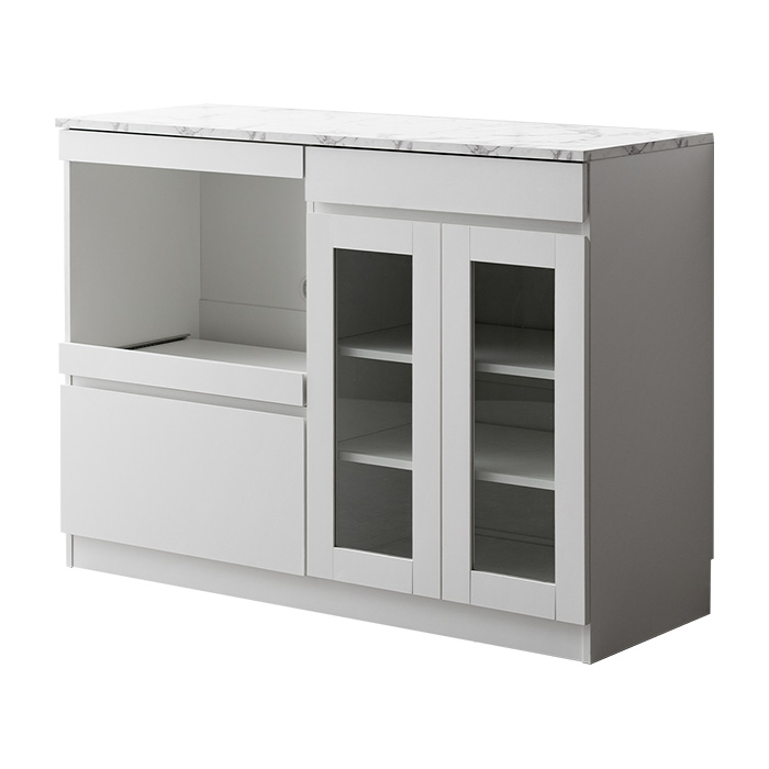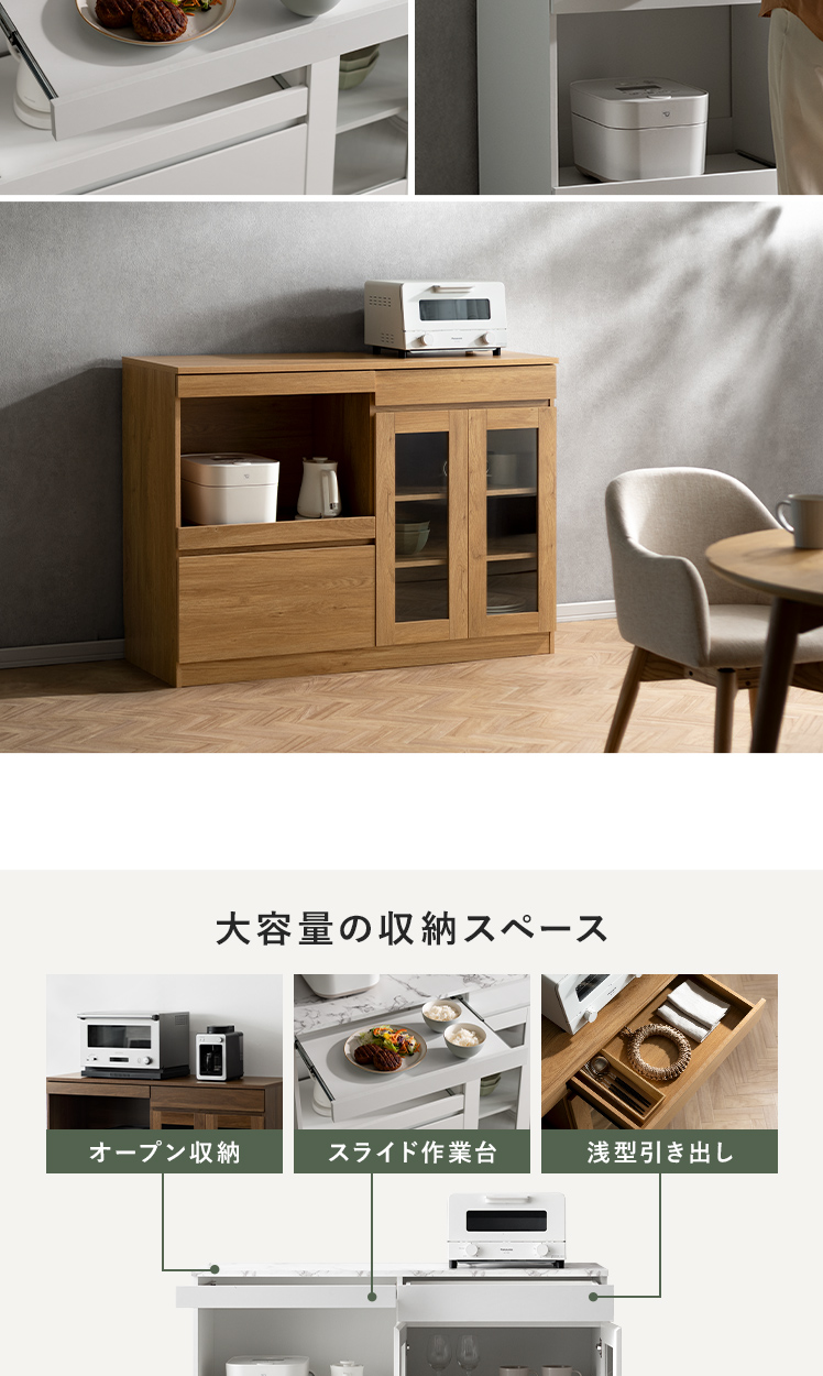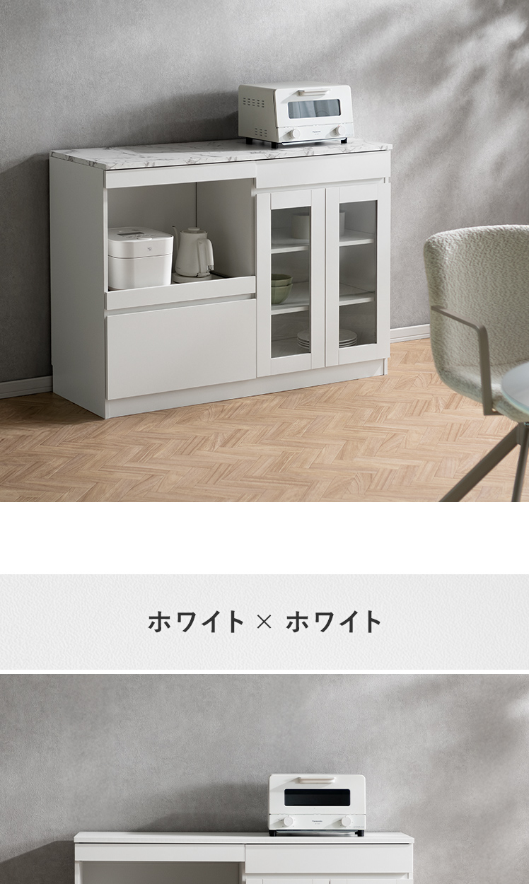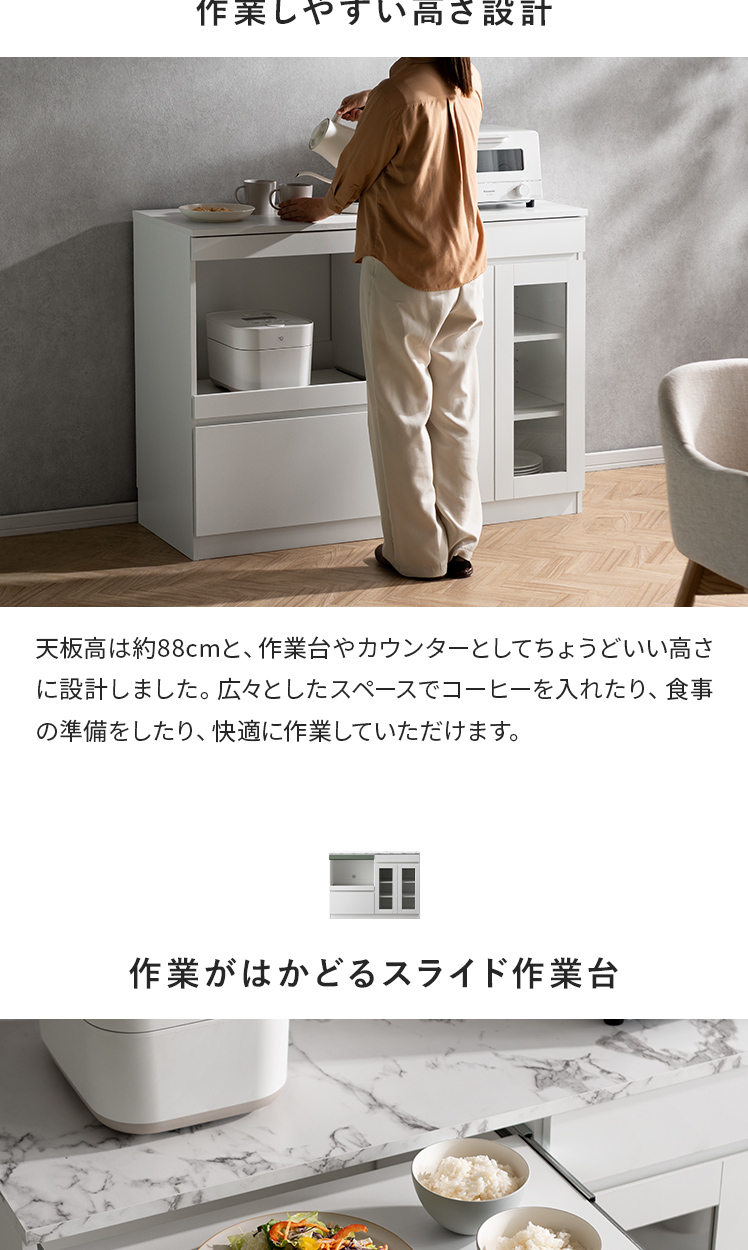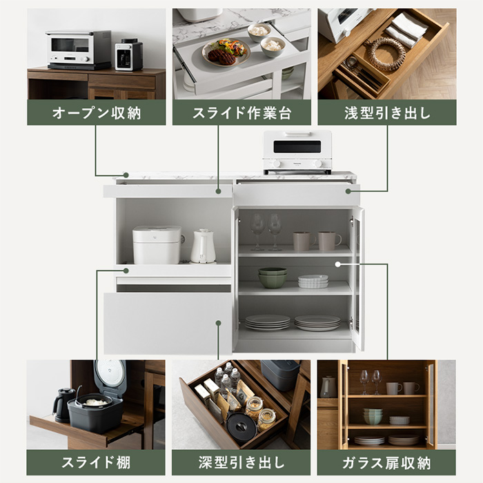 食器棚 ロータイプ キッチンカウンター キッチンラック キッチン収納 カップボード レンジ台 キッチンボード スライド棚 ガラス扉 オープン収納 コード穴付き コーヒースペース おしゃれ シンプル 北欧 フルオープンレール 可動棚 高さ調整 フラット扉 大理石調 木目調 巾木除け メラミン 大容量 高耐荷重 作業台付き ホワイト ブラウン ナチュラル【公式限定|いつでも3%OFFクーポン対象】