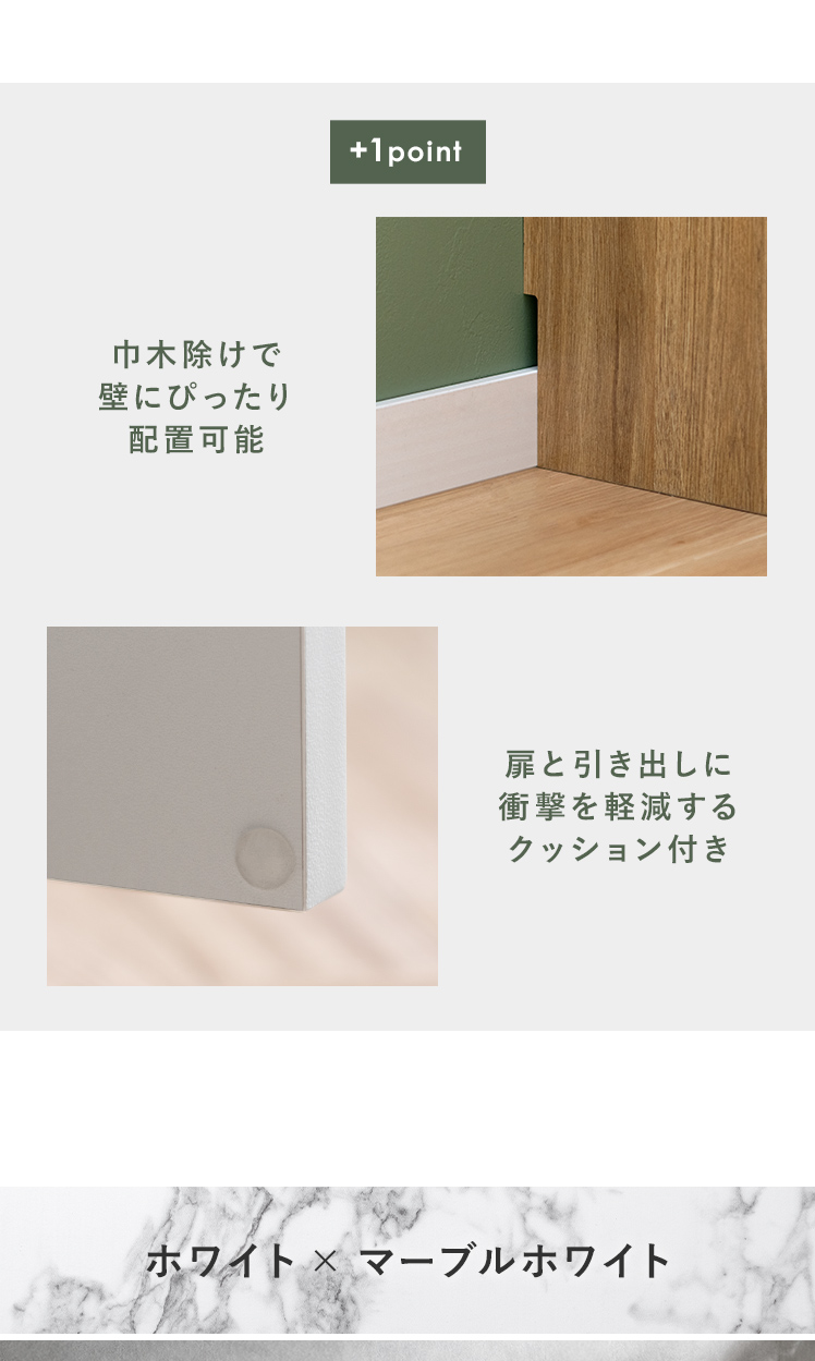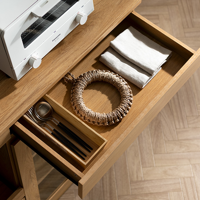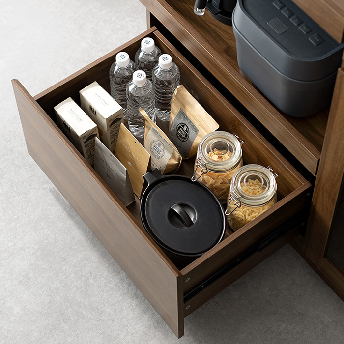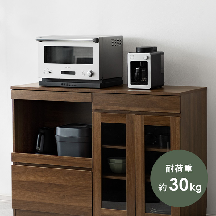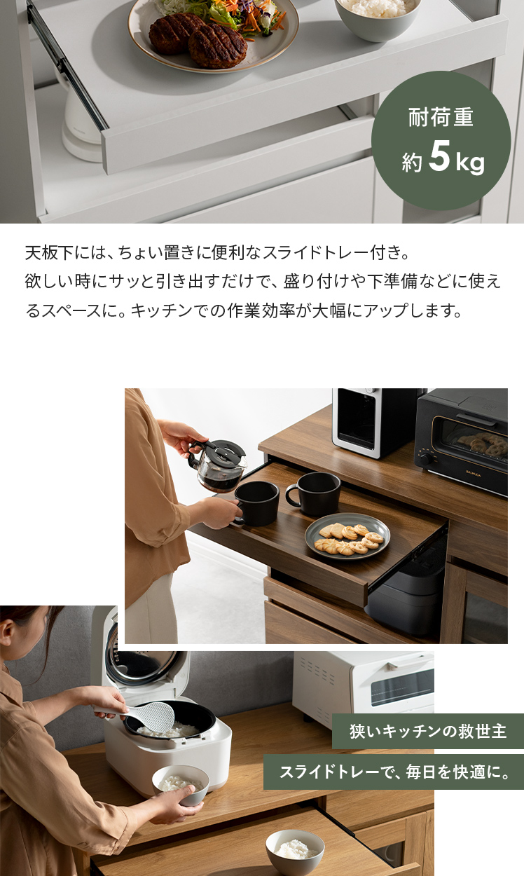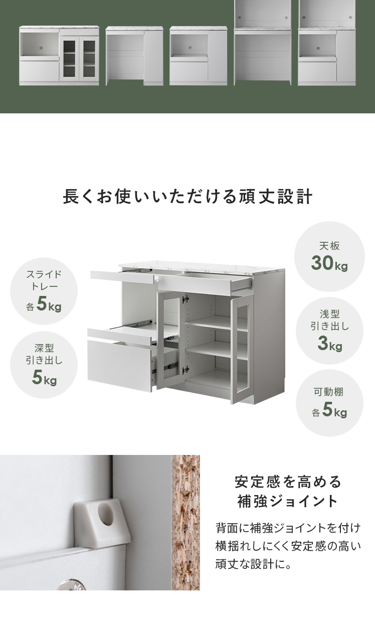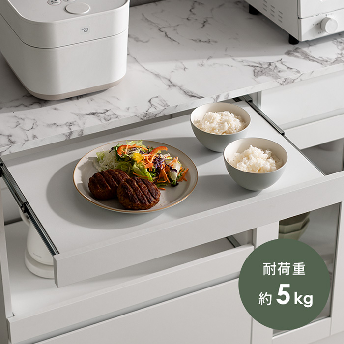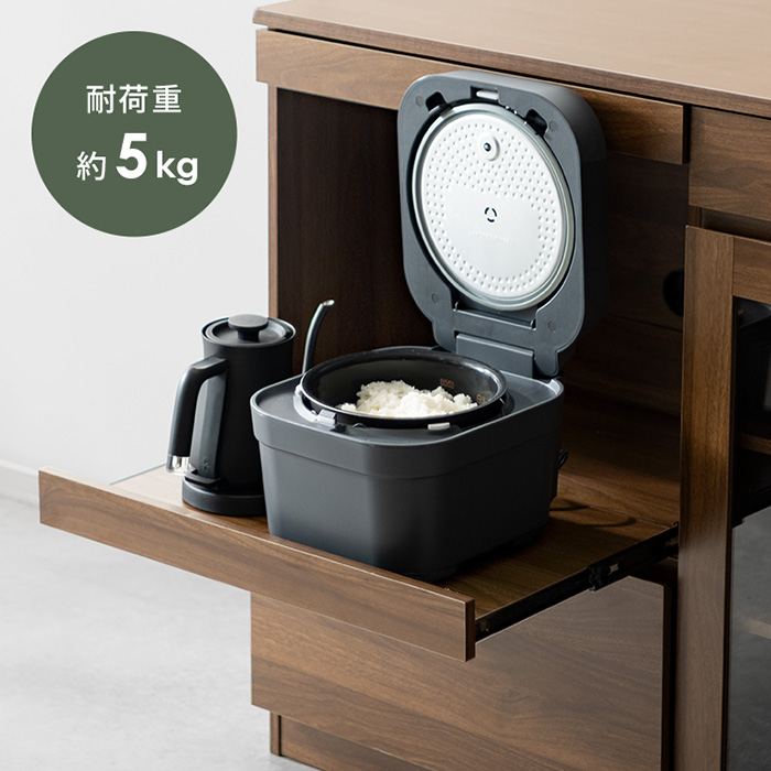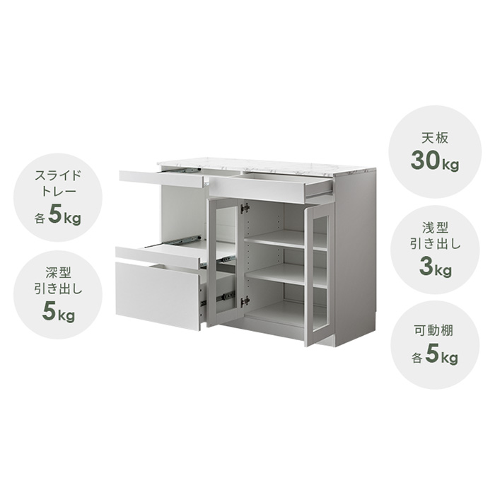 | 耐荷重 | 天板/約30kg、スライドトレー/各約5kg、浅型引き出し/約3kg、深型引出し/約5kg、可動棚/約5kg |
