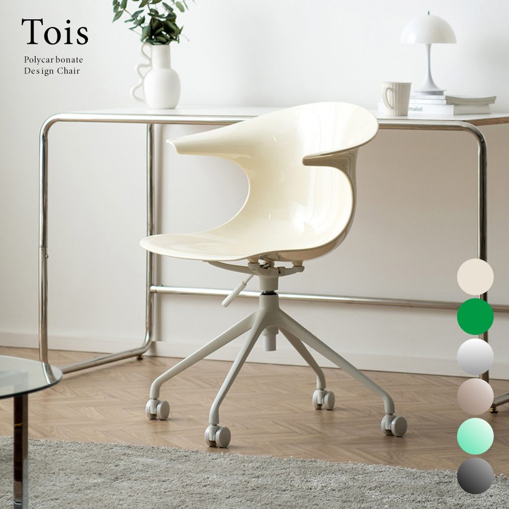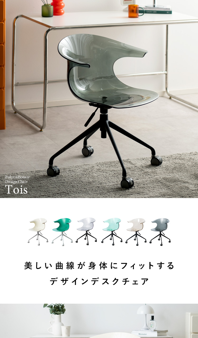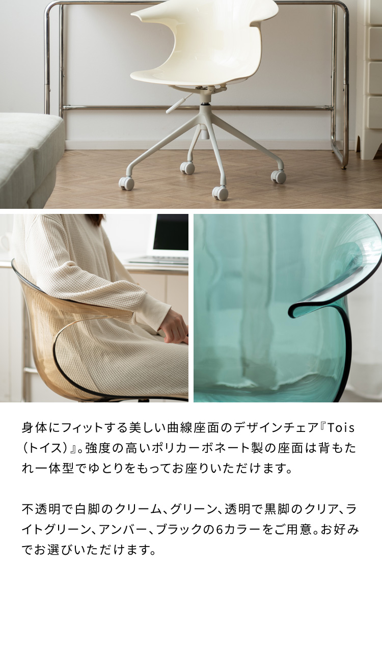 デスクチェア Tois〔トイス〕/身体にフィットする美しい曲線座面のデザインチェア『Tois(トイス)』。強度の高いポリカーボネート製の座面は背もたれ一体型でゆとりをもってお座りいただけます。不透明で白脚のクリーム、グリーン、透明で黒脚のクリア、ライトグリーン、アンバー、ブラックの6カラーをご用意。お好みでお選びいただけます。