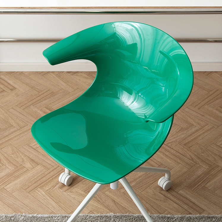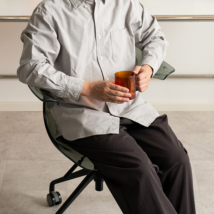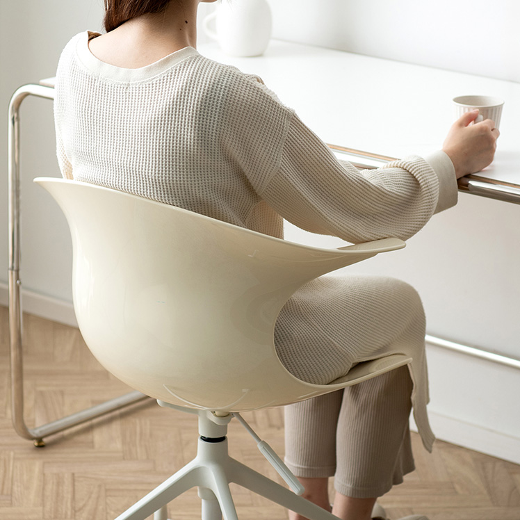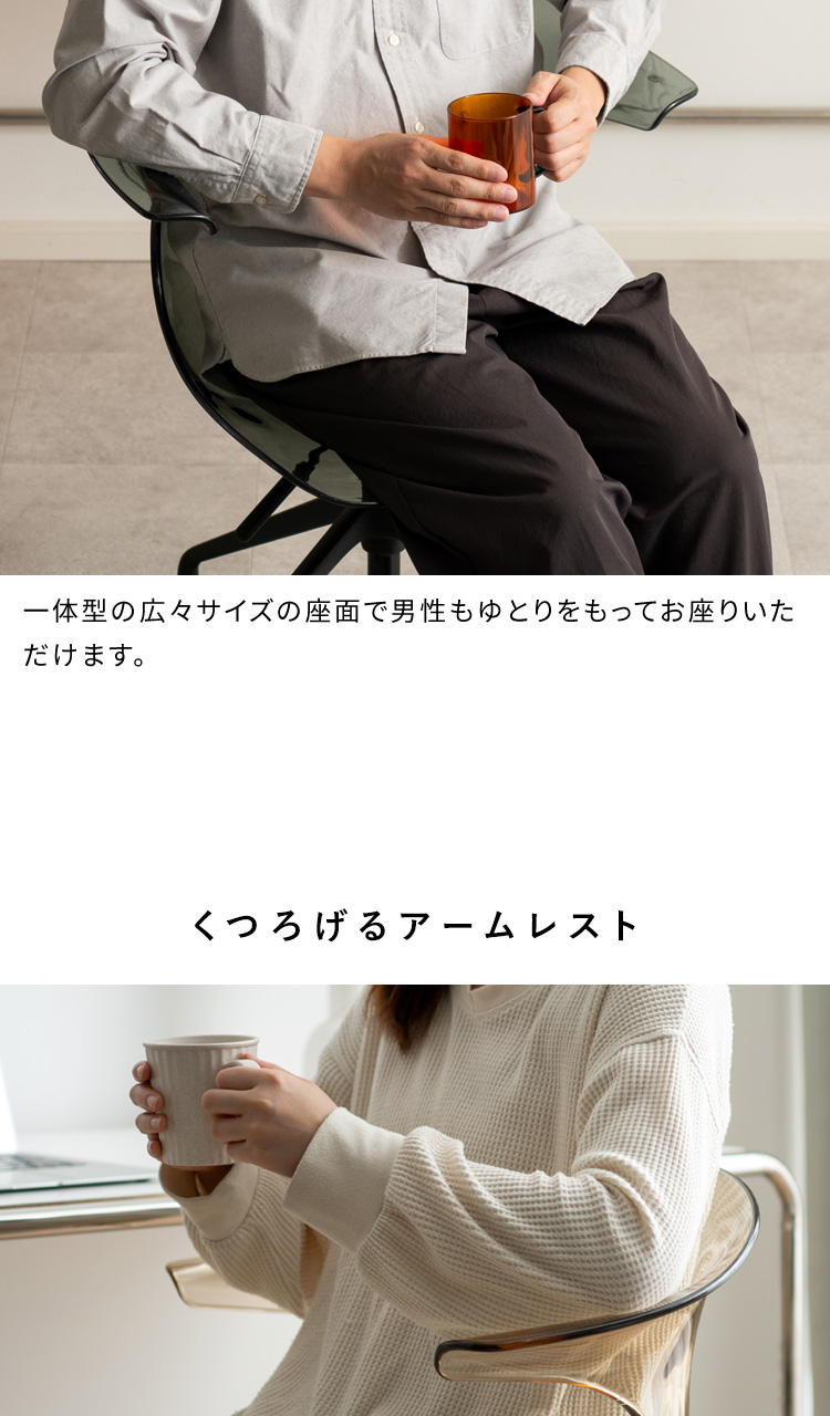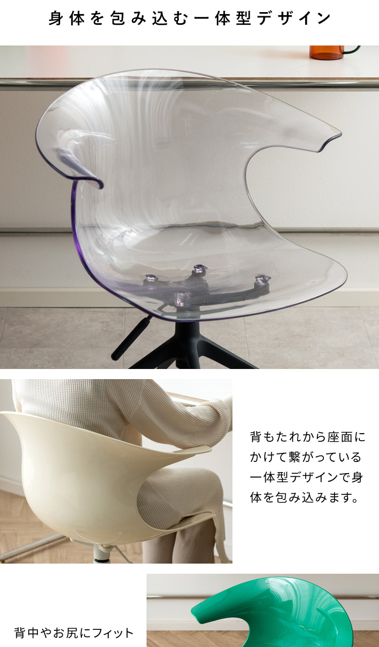 デスクチェア Tois〔トイス〕/身体にフィットする美しい曲線座面のデザインチェア『Tois(トイス)』。強度の高いポリカーボネート製の座面は背もたれ一体型でゆとりをもってお座りいただけます。不透明で白脚のクリーム、グリーン、透明で黒脚のクリア、ライトグリーン、アンバー、ブラックの6カラーをご用意。お好みでお選びいただけます。