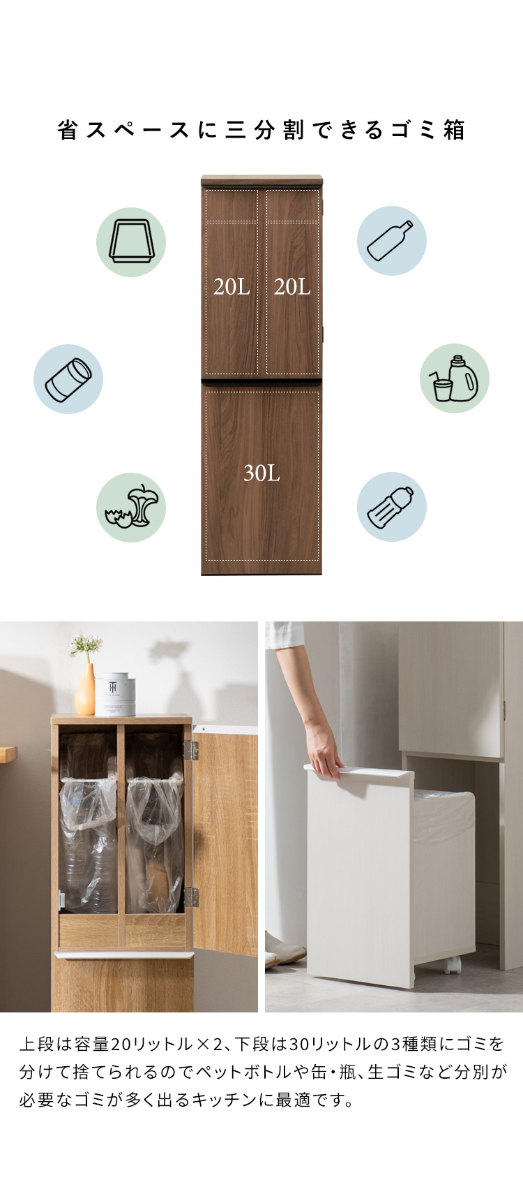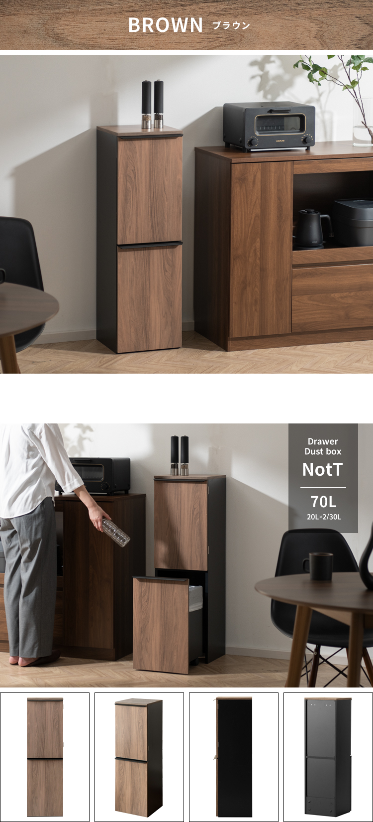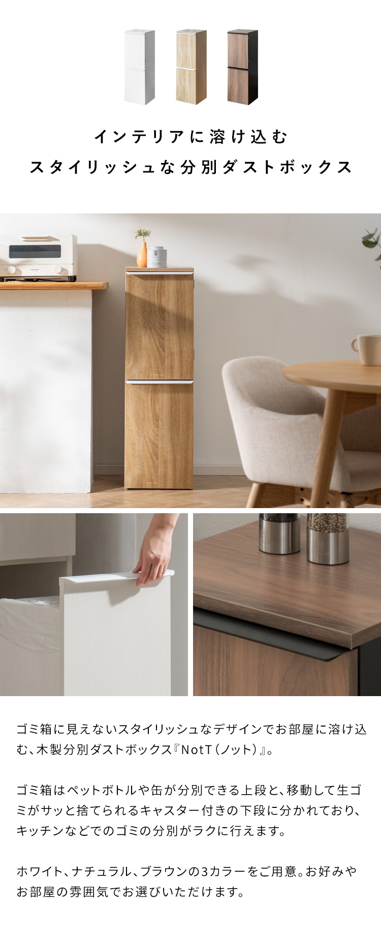 分別ダストボックス NotT〔ノット〕/ゴミ箱に見えないスタイリッシュなデザインでお部屋に溶け込む、木製分別ダストボックス『NotT(ノット)』。ゴミ箱はペットボトルや缶が分別できる上段と、移動して生ゴミがサッと捨てられるキャスター付きの下段に分かれており、キッチンなどでのゴミの分別がラクに行えます。ホワイト、ナチュラル、ブラウンの3カラーをご用意。お好みやお部屋の雰囲気でお選びいただけます。