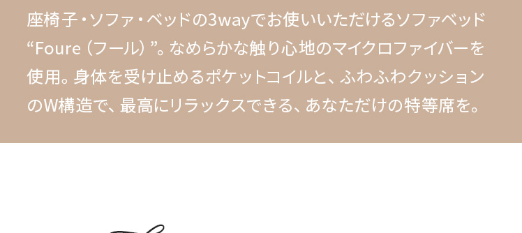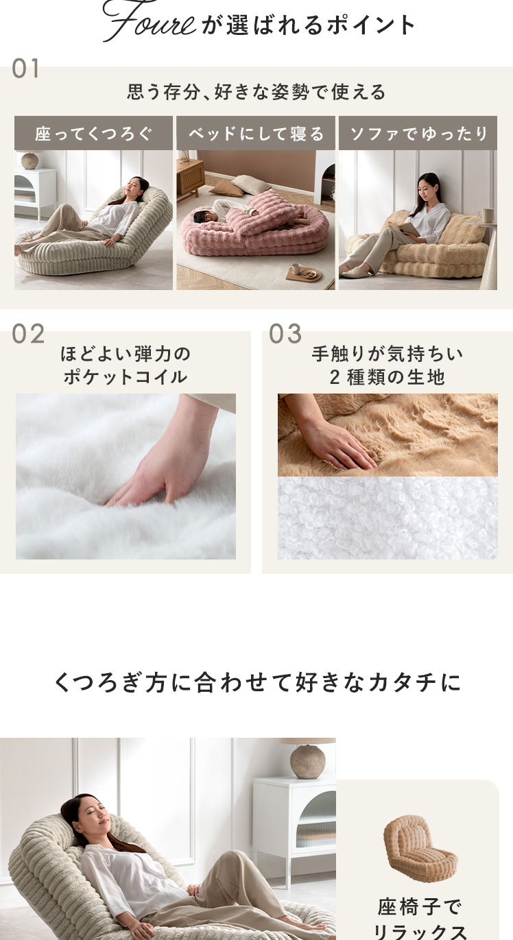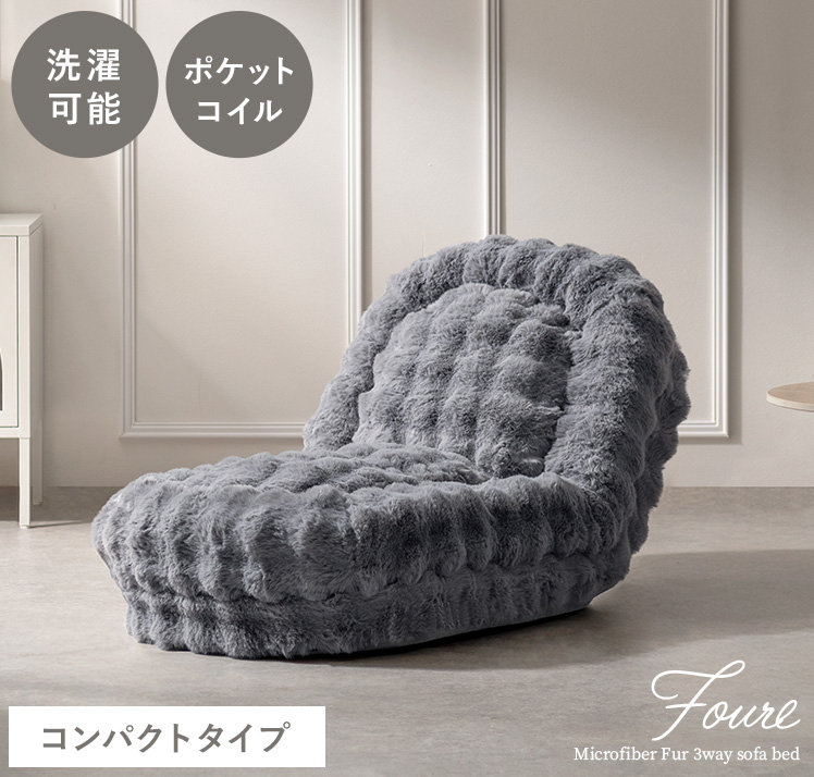 ふわとろソファベッドFoure〔フール〕コンパクトサイズ/座椅子・ソファ・ベッドの3wayでお使いいただけるソファベッド“Foure(フール)”。なめらかな触り心地のマイクロファイバーを使用。身体を受け止めるポケットコイルと、ふわふわクッションのW構造で、最高にリラックスできる、あなただけの特等席を。
