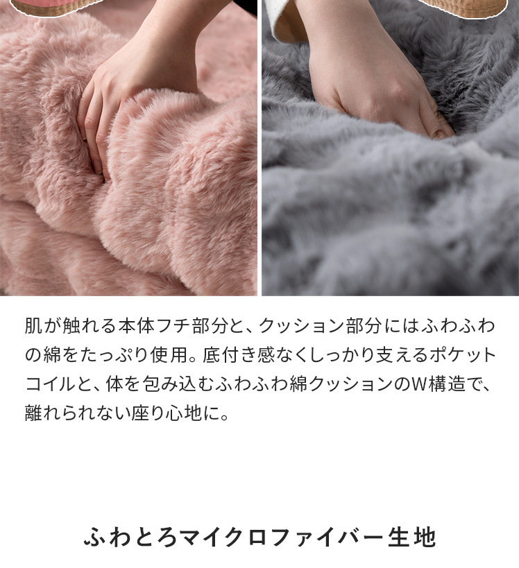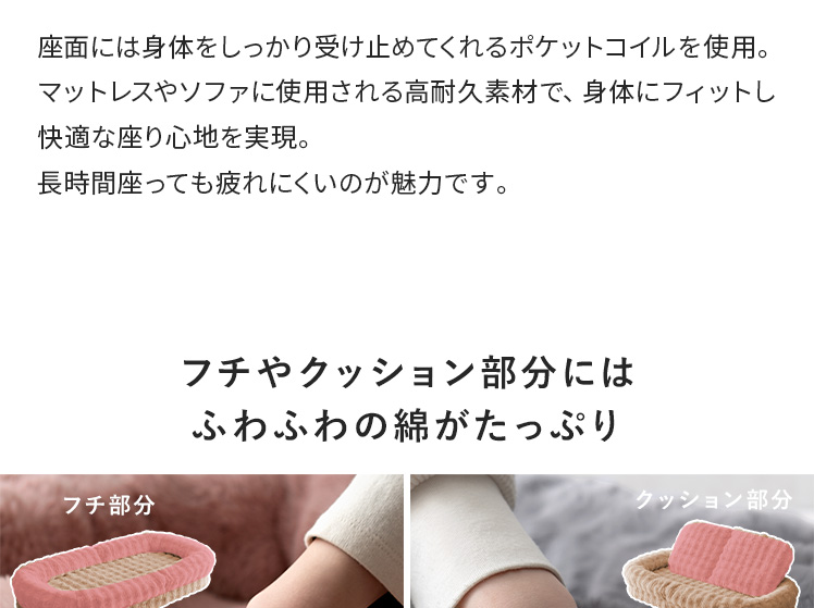 | 備考 | 完成品 本体カバー上部・クッションカバーの取り外し可能、クッション2個付き クッションカバーは手洗い洗濯可能 ※若干の個体差により、表記サイズと多少の差異が生じる場合がございます。 |