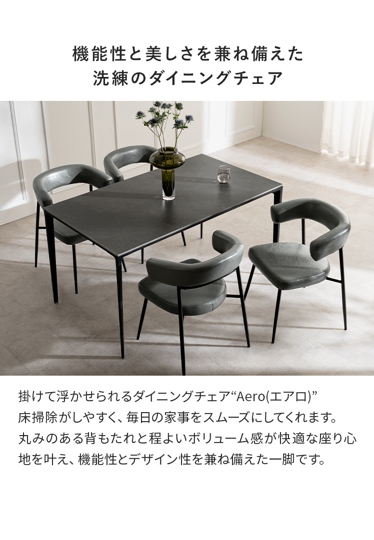 浮かせるダイニングチェアAERO〔エアロ〕 2脚セット/掛けて浮かせられるチェアと、気品あるセラミックテーブルのダイニングセット“Aero(エアロ)”。チェアを引っ掛けるだけで床掃除がしやすく、傷や熱に強い天板で美しさと使いやすさを両立。洗練された空間を演出します。