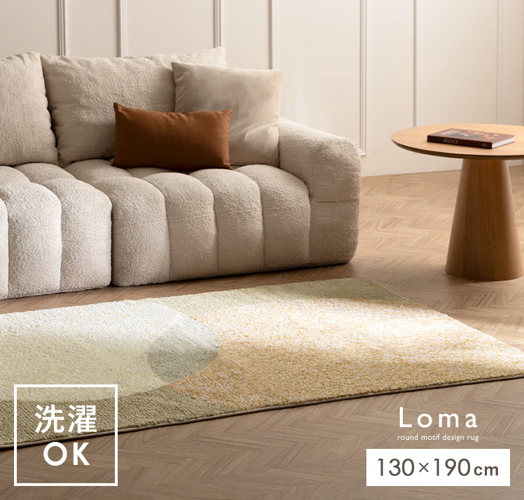 Loma〔ロマ〕デザインラグ 130×190cm/静かな存在感でインテリアに馴染みながら、さりげなく空間を彩るデザインラグ“Loma(ロマ)”高密度のパイルが、優しい踏み心地と上質感を演出。ご自宅で丸洗いできるので、気負わず心地よく使えます。