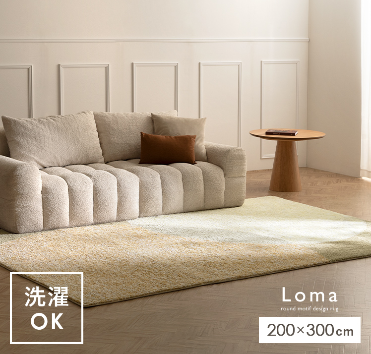 Loma〔ロマ〕デザインラグ 200×300cm/静かな存在感でインテリアに馴染みながら、さりげなく空間を彩るデザインラグ“Loma(ロマ)”高密度のパイルが、優しい踏み心地と上質感を演出。ご自宅で丸洗いできるので、気負わず心地よく使えます。