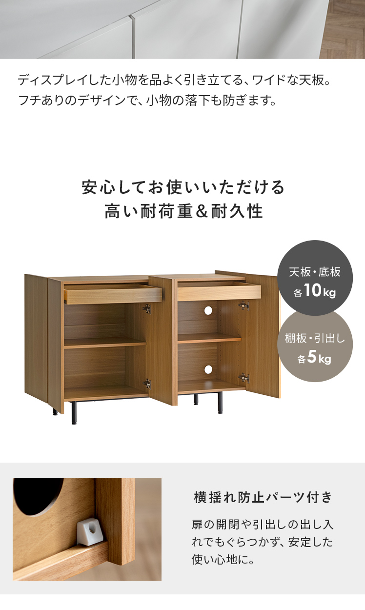 | 耐荷重 | 天板・底板/約10kg、可動棚(1枚あたり)/約5kg、引出し/約5kg |