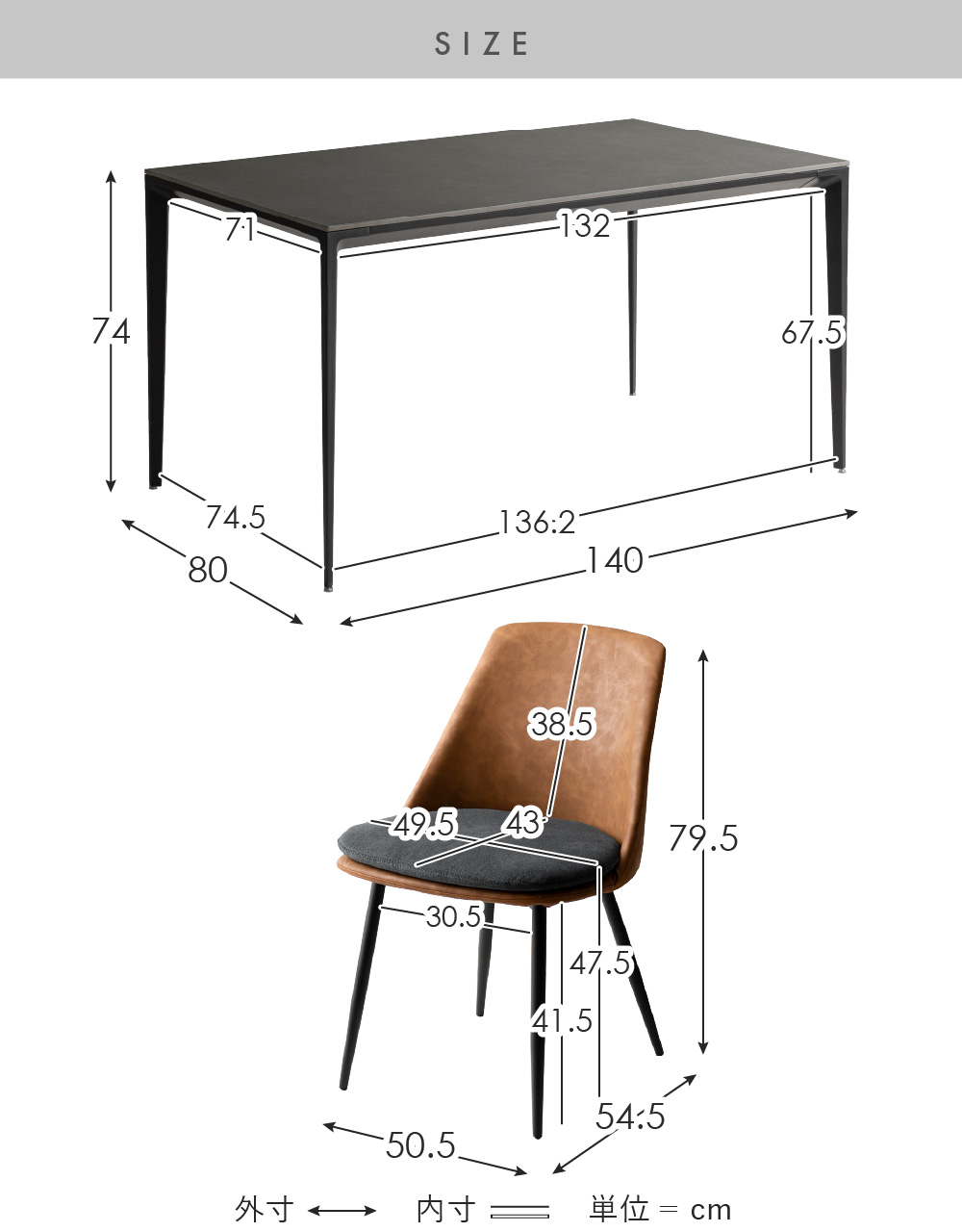 サイズ | テーブル/約幅140×奥行き80×高さ74cm チェア/約幅50.5×奥行き54.5×高さ79.5cm |