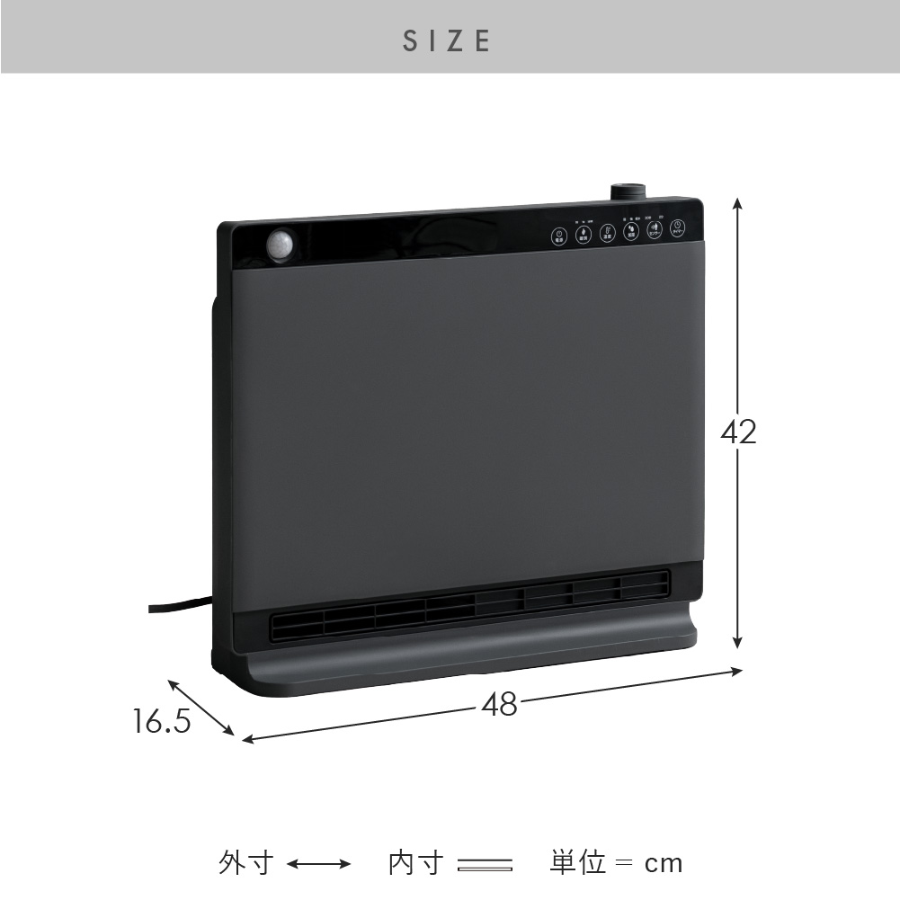 | 電気代目安 | 1時間あたり約37.2円(暖房強/1100w+加湿強/90w連続運転時) |