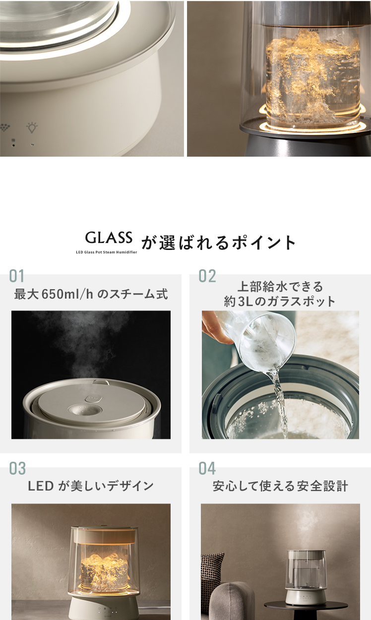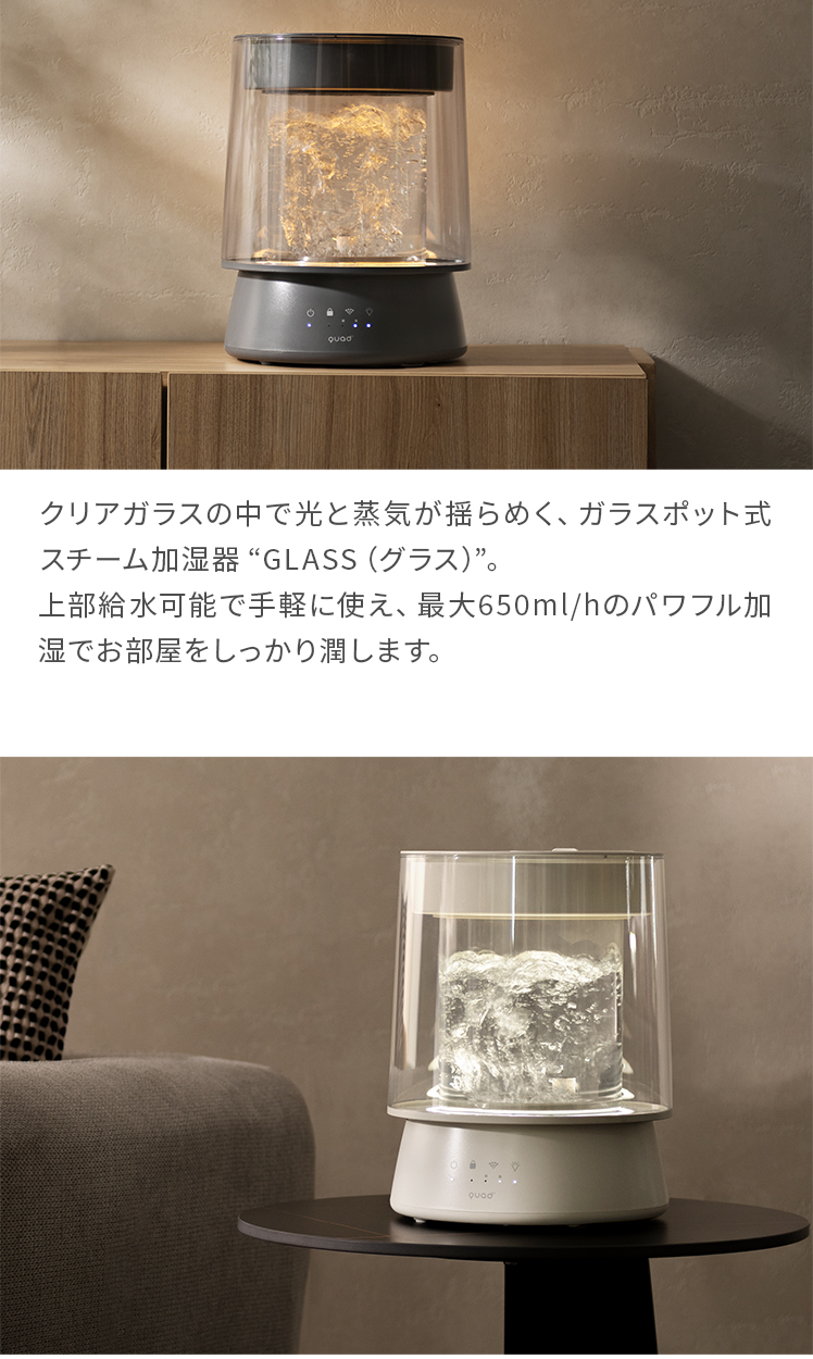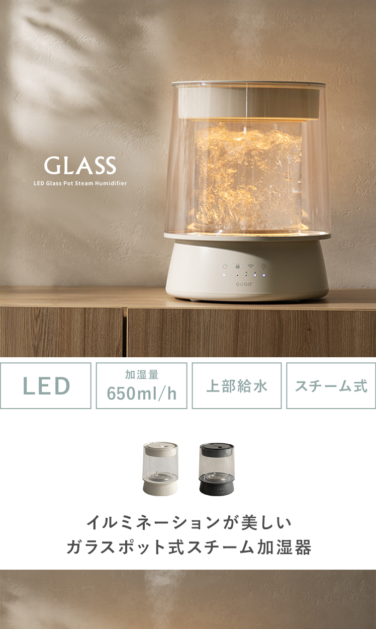 LED付き ガラススチーム加湿器 GLASS〔グラス〕/クリアガラスの中で光と蒸気が揺らめく、ガラスポット式スチーム加湿器“GLASS(グラス)”。上部給水可能で手軽に使え、最大650ml/hのパワフル加湿でお部屋をしっかり潤します。