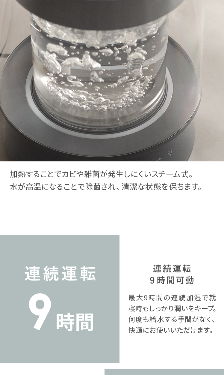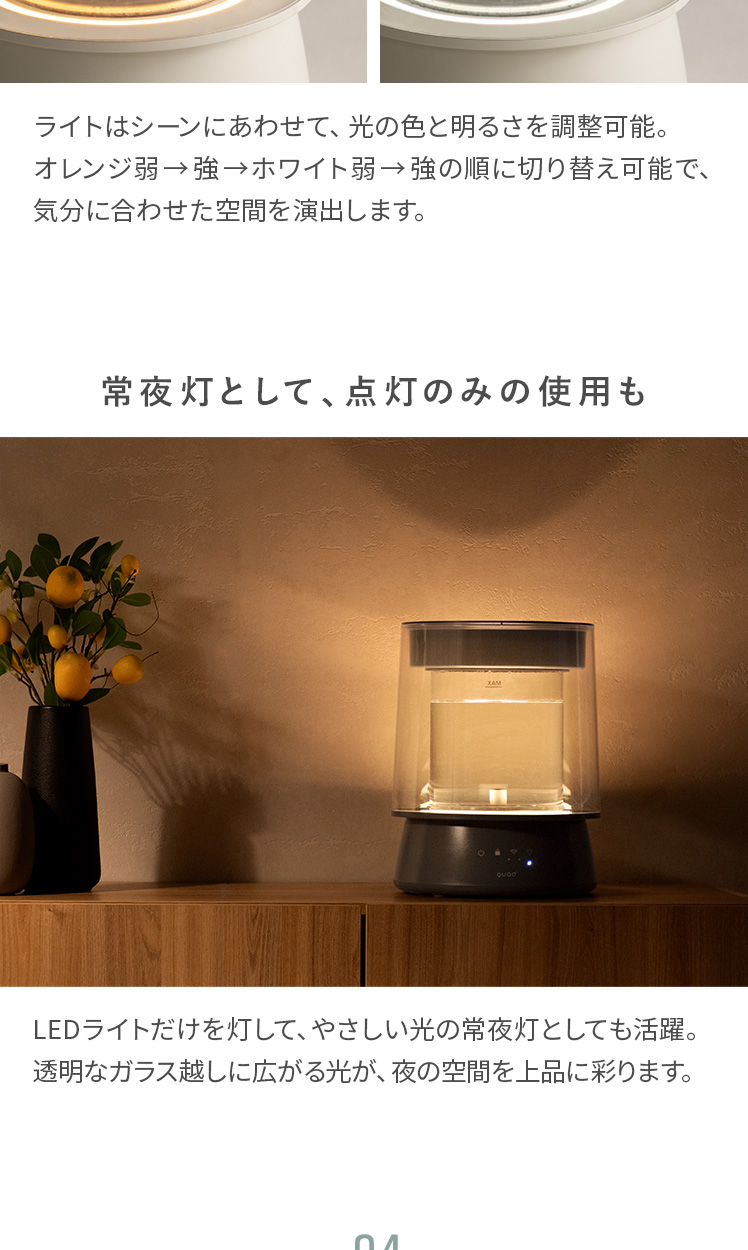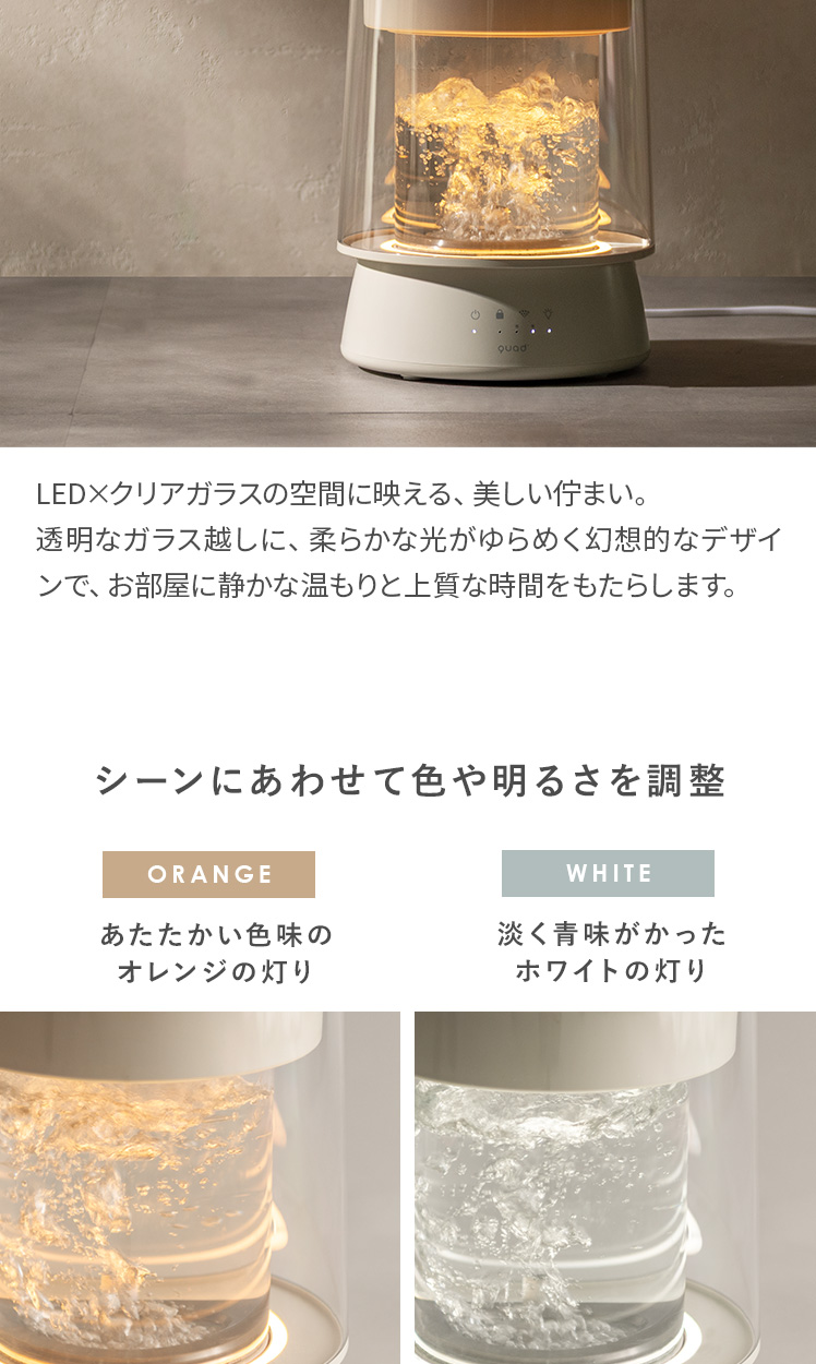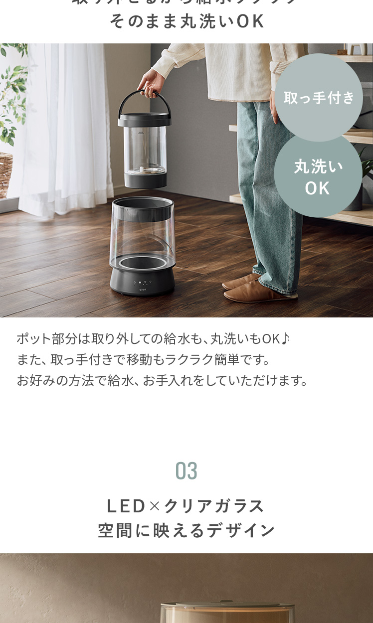 LED付き ガラススチーム加湿器 GLASS〔グラス〕/クリアガラスの中で光と蒸気が揺らめく、ガラスポット式スチーム加湿器“GLASS(グラス)”。上部給水可能で手軽に使え、最大650ml/hのパワフル加湿でお部屋をしっかり潤します。