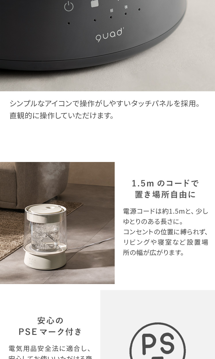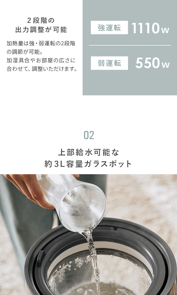 | 加湿量 | 強/650ml/h、弱250ml/h |