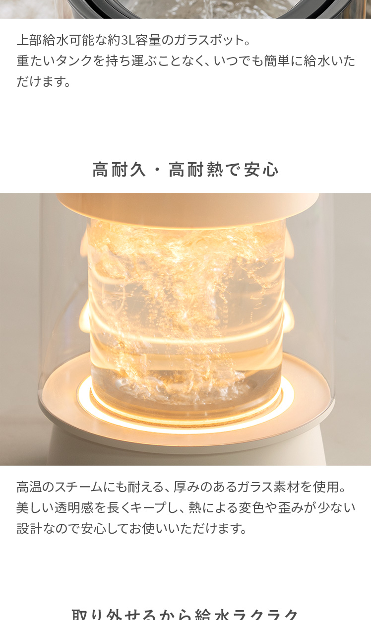 加熱式 上部給水 9時間可動 丸洗い 取っ手付き クリアガラス ガラスポット PSE 水位センサー サーモスタット おしゃれ アイボリー グレー【5%OFFクーポン対象|公式なら毎日お得】