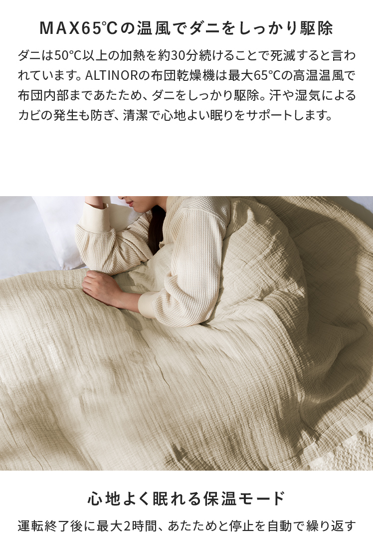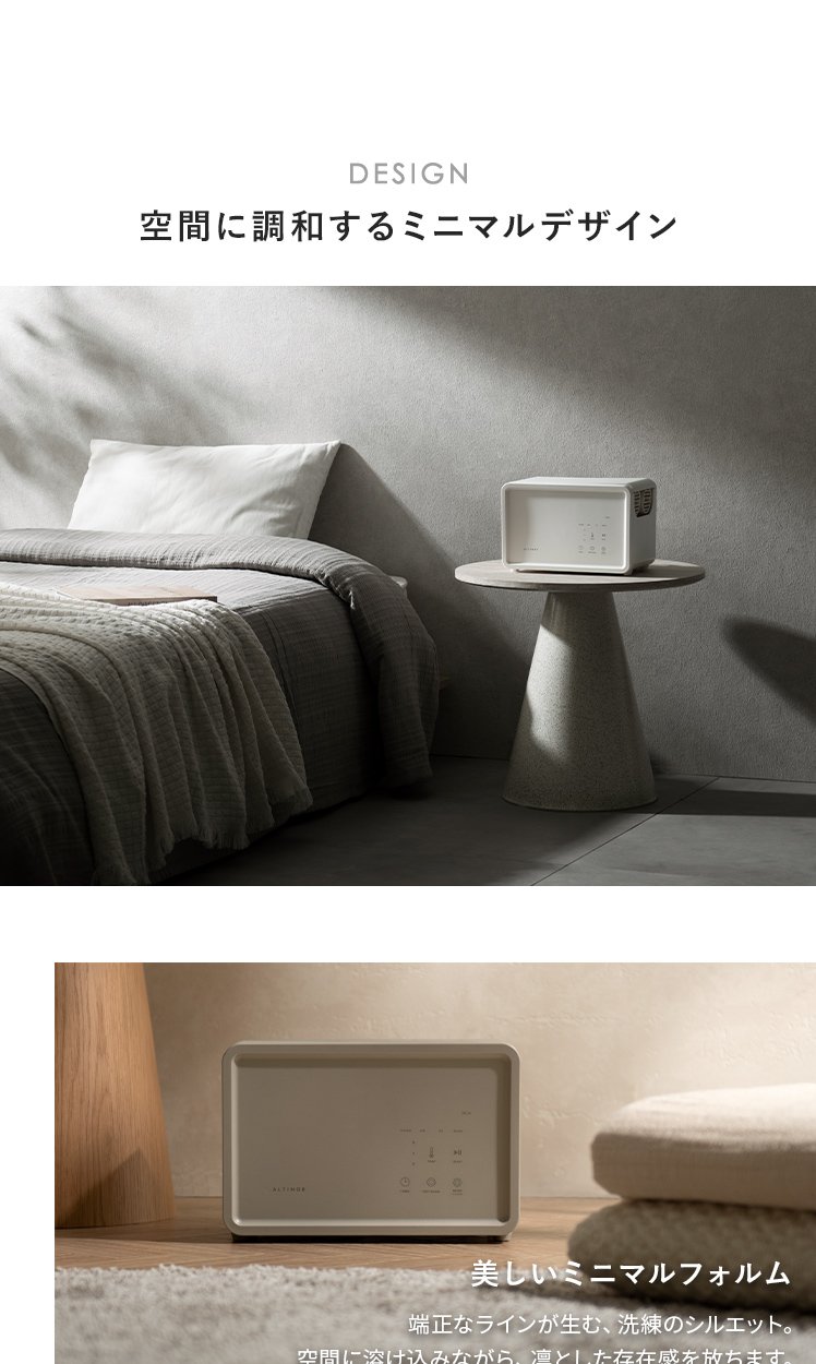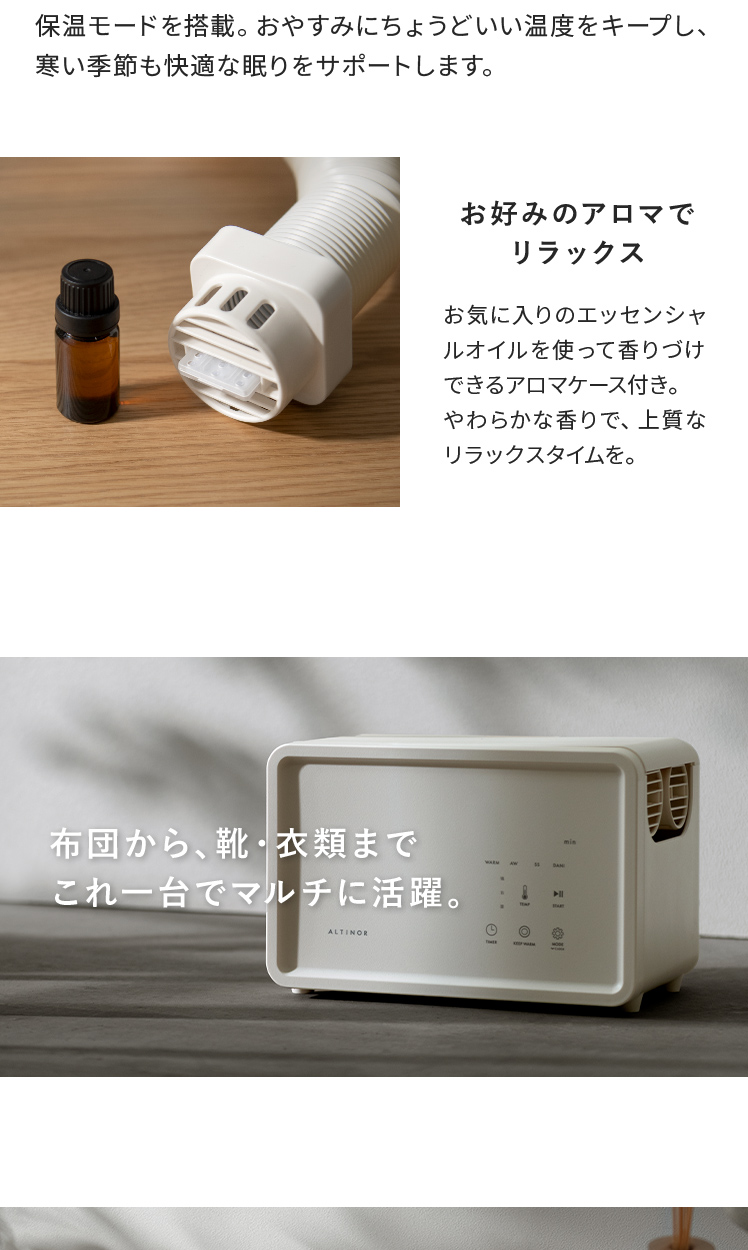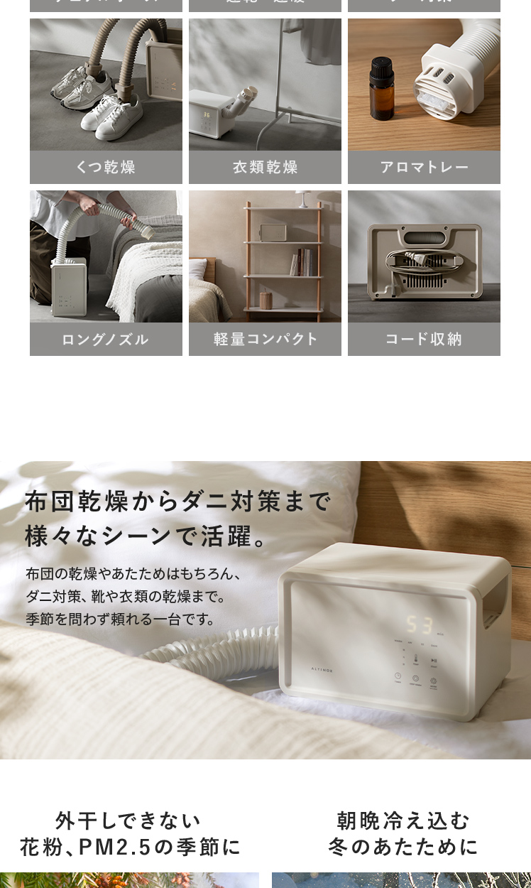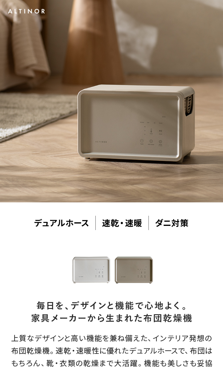 ALTINOR〔アルティノル〕 布団乾燥機/上質なデザインと高い機能を兼ね備えた、インテリア発想の布団乾燥機。速乾・速暖性に優れたデュアルホースで、布団はもちろん、靴・衣類の乾燥まで大活躍。機能も美しさも妥協せず仕上げた一台で、季節を問わず快適な暮らしを。