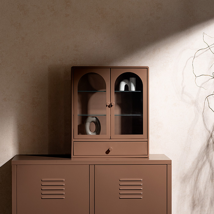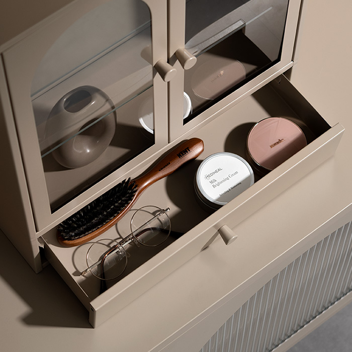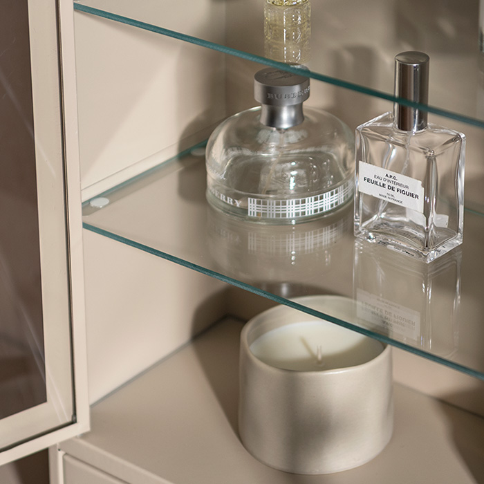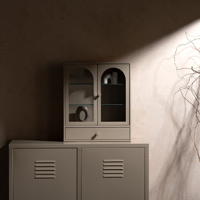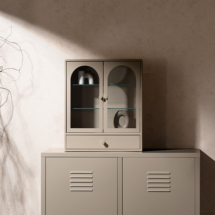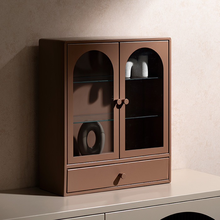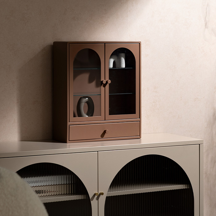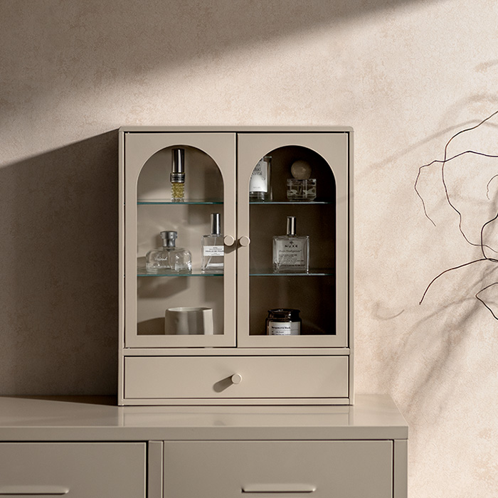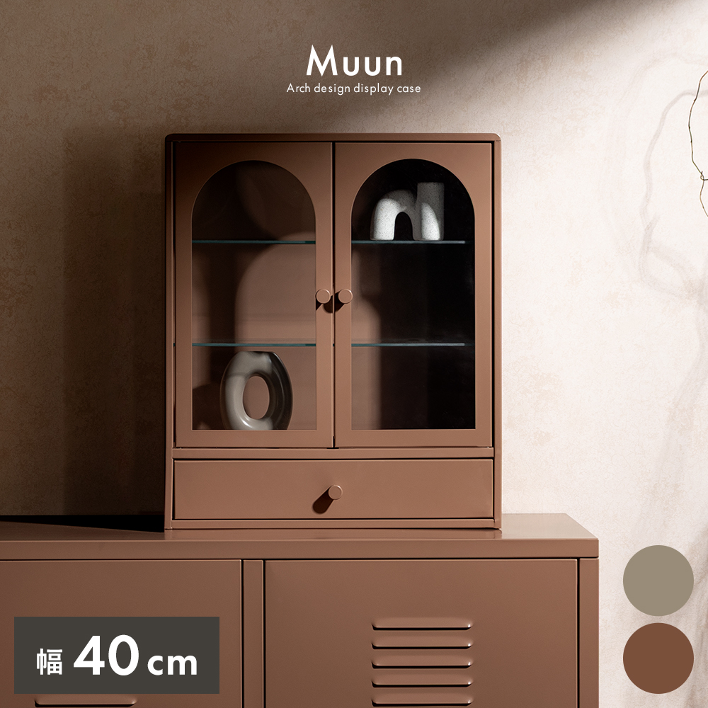 ディスプレイケース Muun〔ムーン〕/クラシカルなアーチとモダンな直線を融合させた、タイムレスな美しさ。見せる収納を楽しむディスプレイケース『Muun(ムーン)』。引き出し付きで、雑多な小物も隠してスマートに収納可能。光を透過するガラス扉が飾る物を引き立て、軽やかな抜け感を演出します。