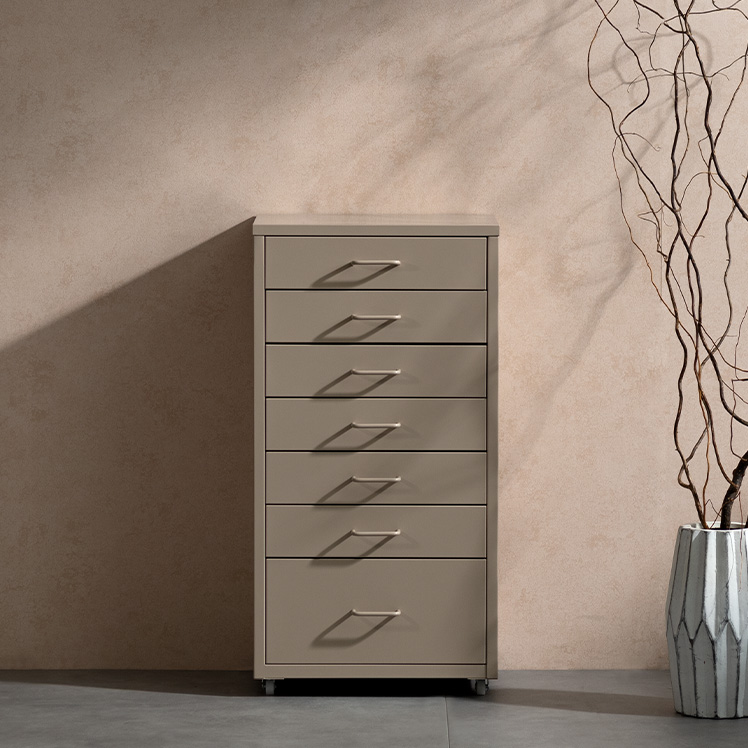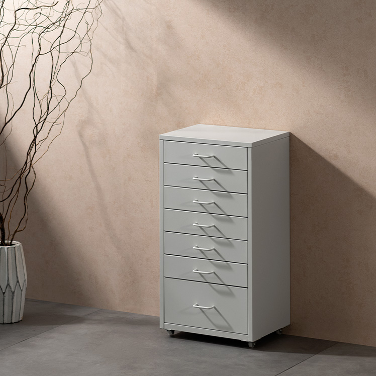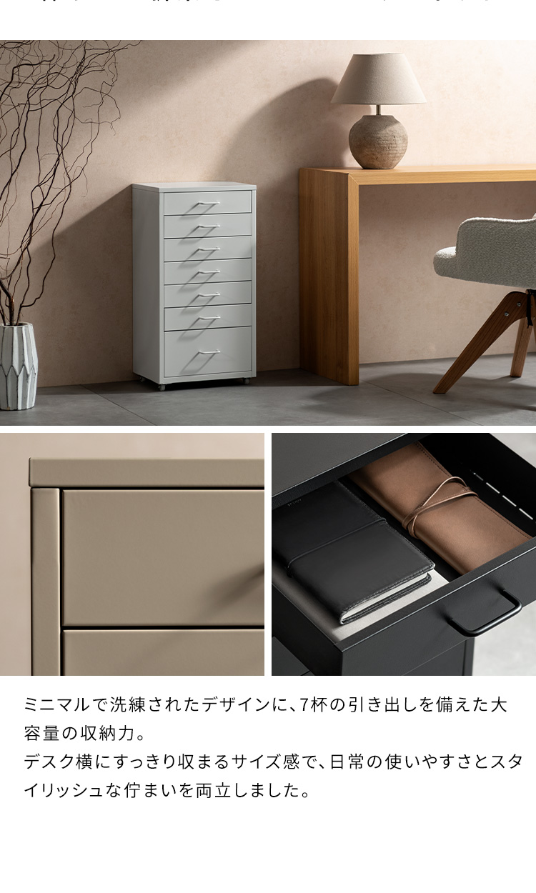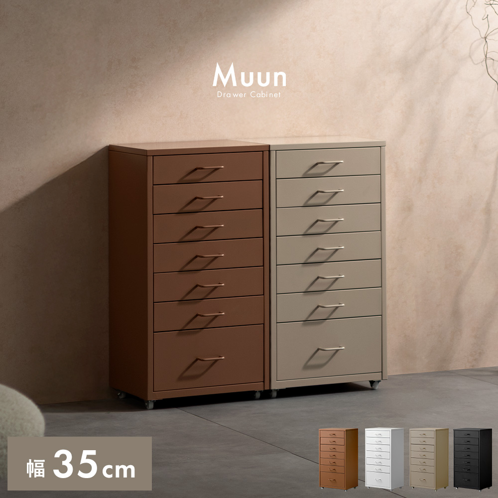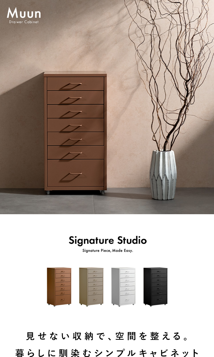 ドロワーキャビネット Muun〔ムーン〕ハイタイプ/ミニマルで洗練されたデザインに、7杯の引き出しを備えた大容量の収納力。デスク横にすっきり収まるサイズ感で、日常の使いやすさとスタイリッシュな佇まいを両立しました。