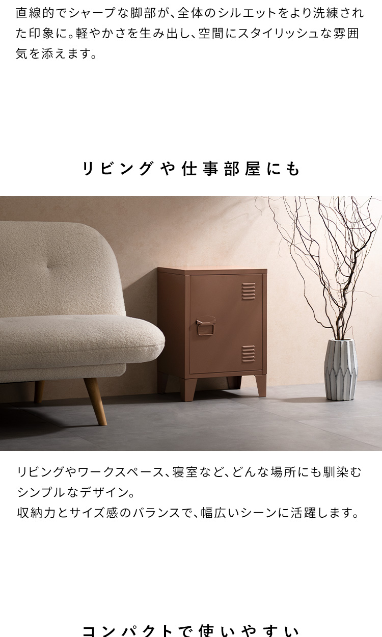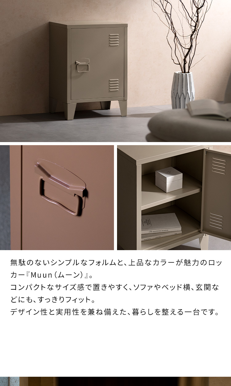 ロッカー Muun〔ムーン〕コンパクトタイプ/無駄のないシンプルなフォルムと、上品なカラーが魅力のロッカー『Muun(ムーン)』。コンパクトなサイズ感で置きやすく、ソファやベッド横、玄関などにも、すっきりフィット。デザイン性と実用性を兼ね備えた、暮らしを整える一台です。