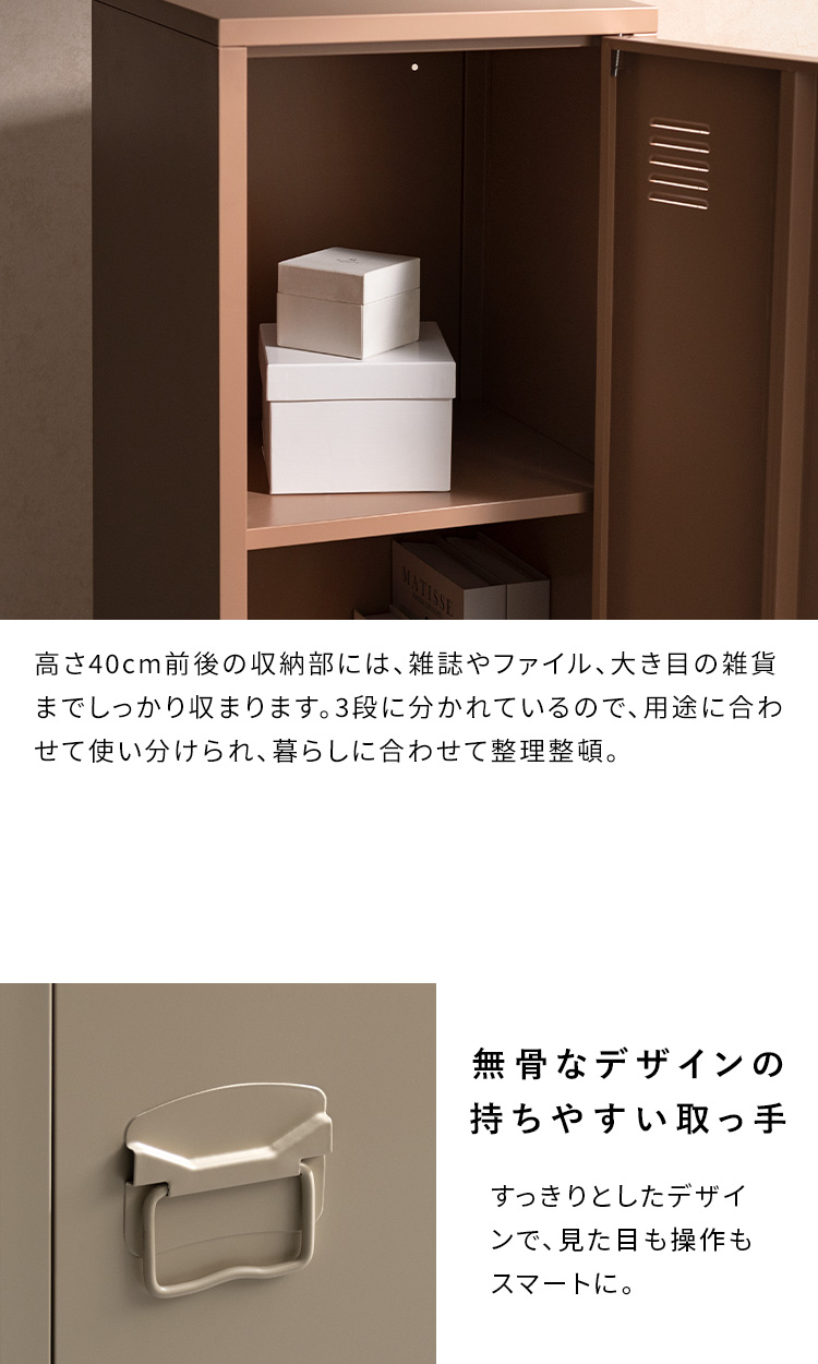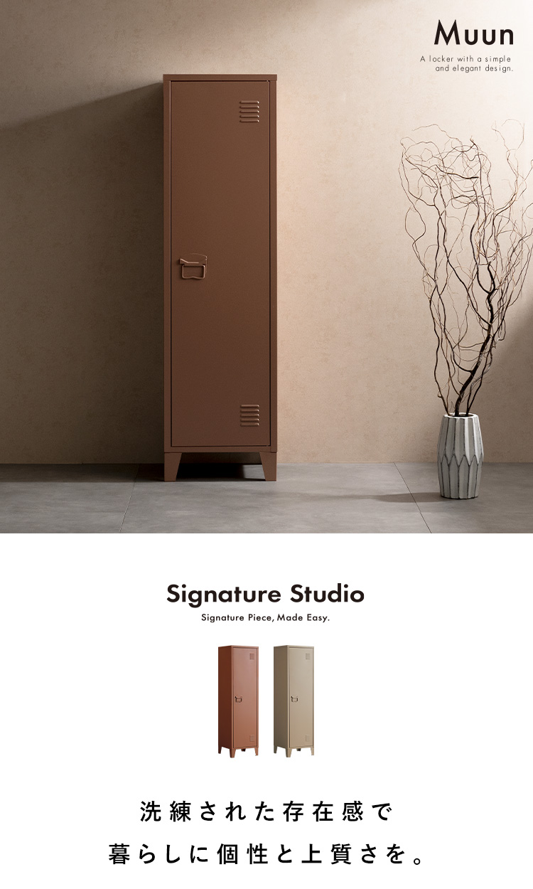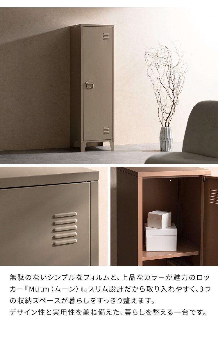 ロッカー Muun〔ムーン〕ハイタイプ/無駄のないシンプルなフォルムと、上品なカラーが魅力のロッカー『Muun(ムーン)』。スリム設計だから取り入れやすく、3つの収納スペースが暮らしをすっきり整えます。デザイン性と実用性を兼ね備えた、暮らしを整える一台です。