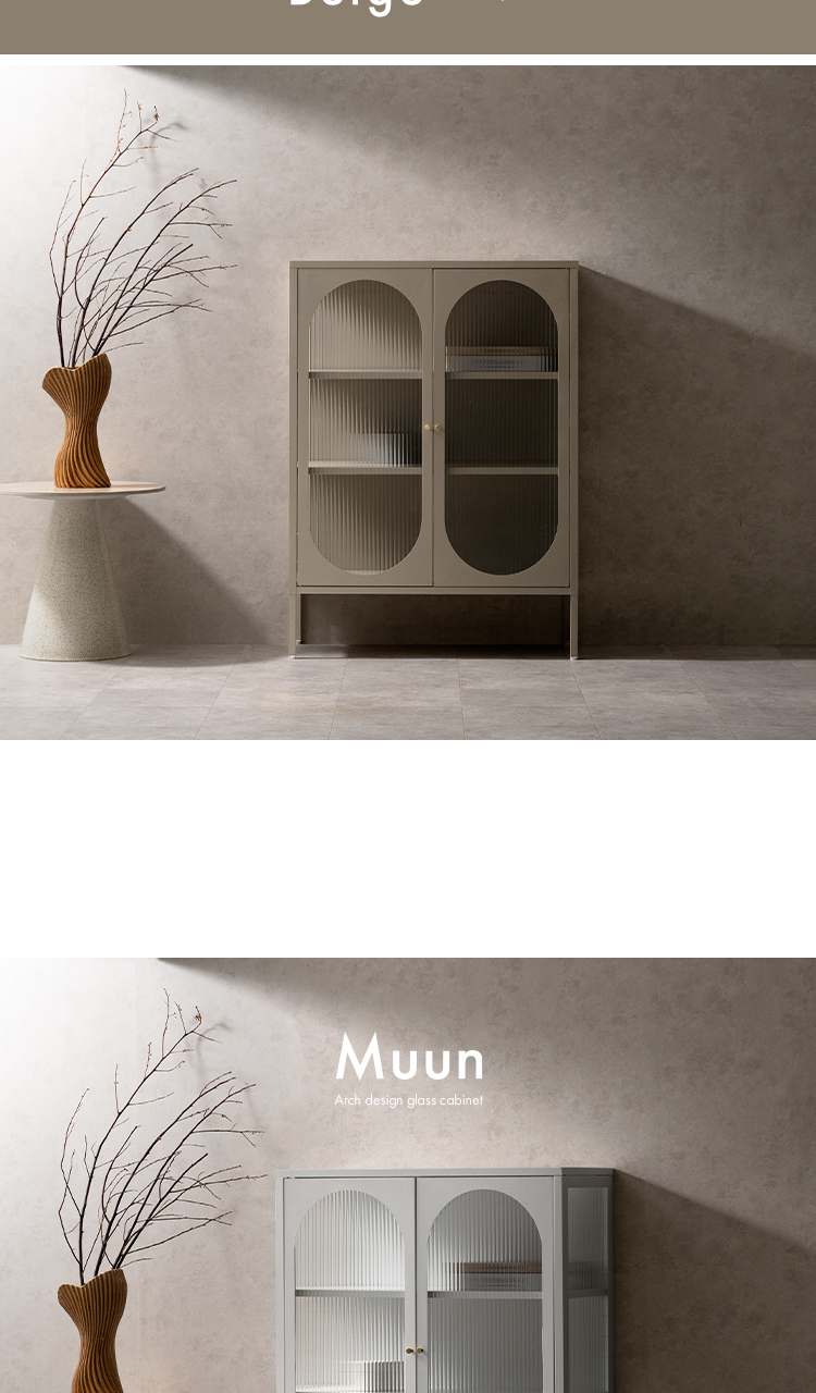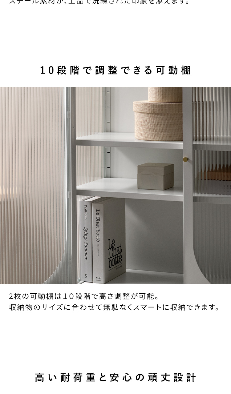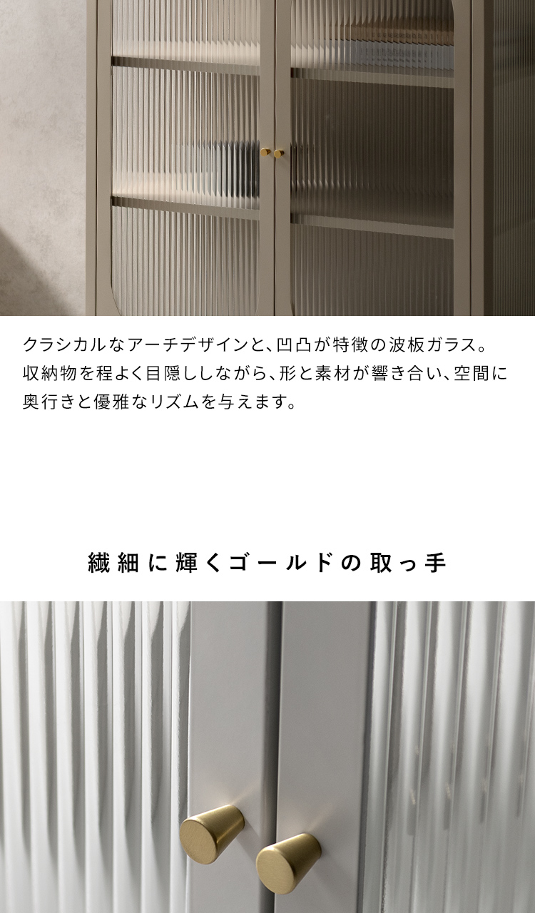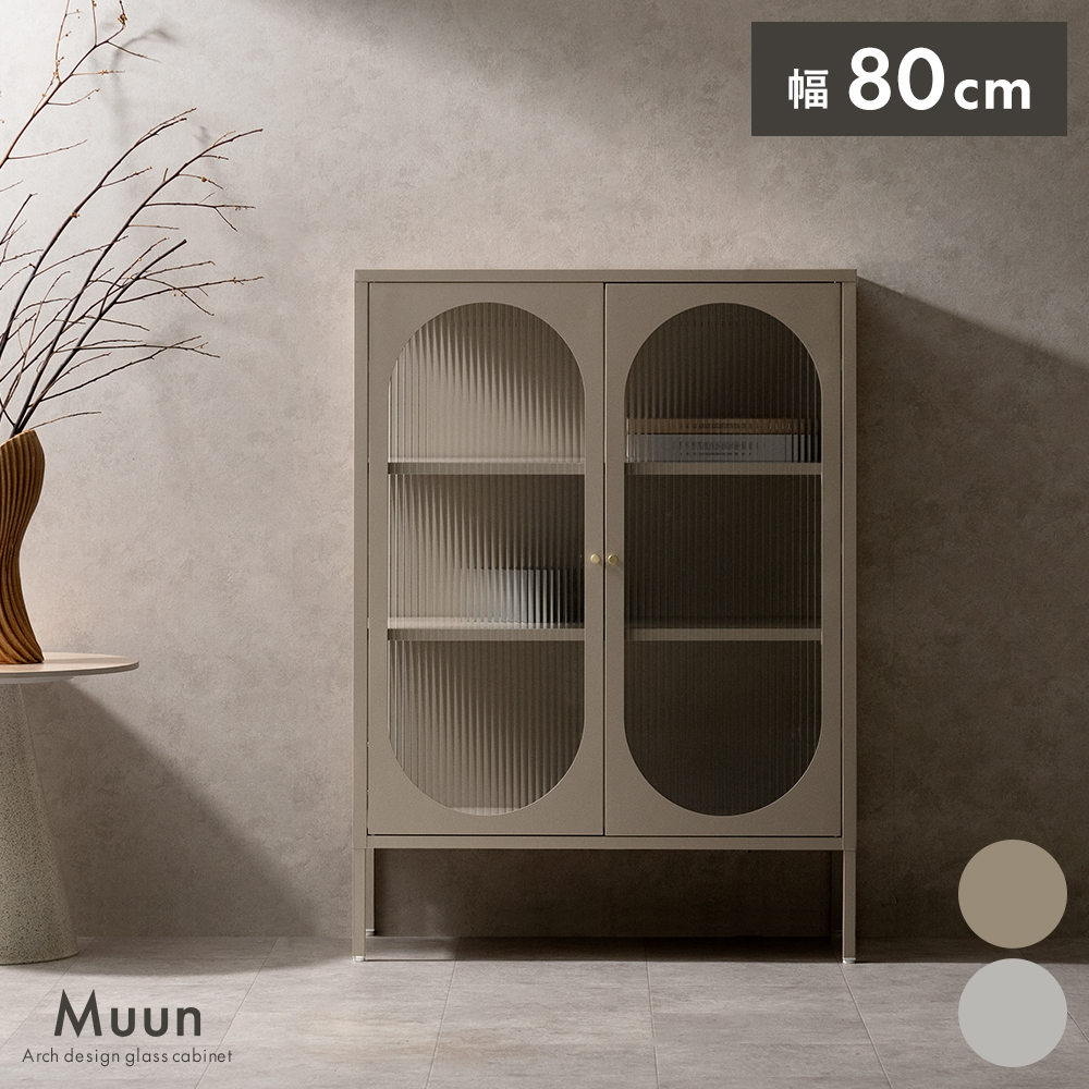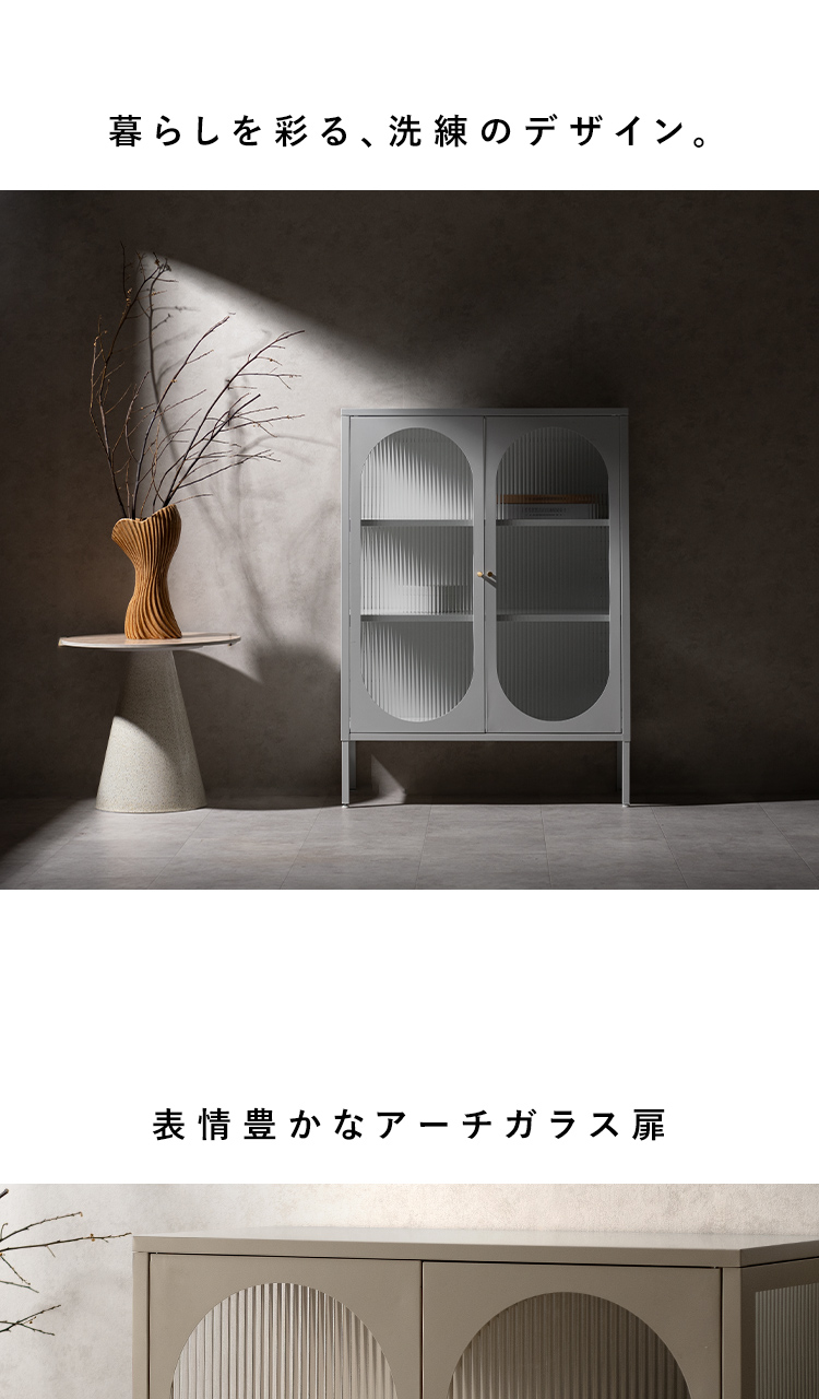 キャビネット Muun〔ムーン〕/クラシカルなアーチとモダンな直線を融合させた、タイムレスな美しさ。見せる収納を楽しむガラスキャビネット『Muun(ムーン)』。3段階で調整できる可動棚で、収納物に合わせた収納が可能。光を透過するガラス扉が飾る物を引き立て、軽やかな抜け感を演出します。