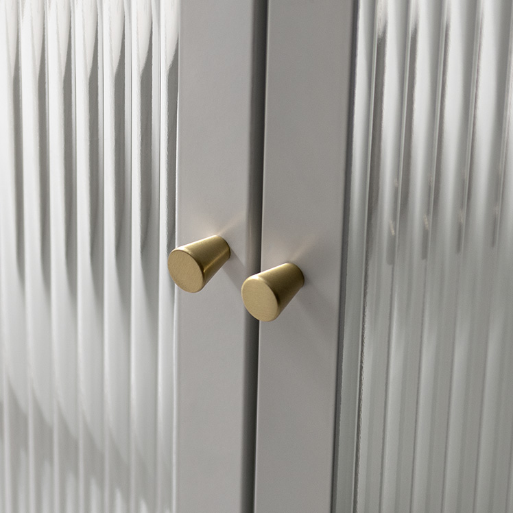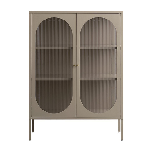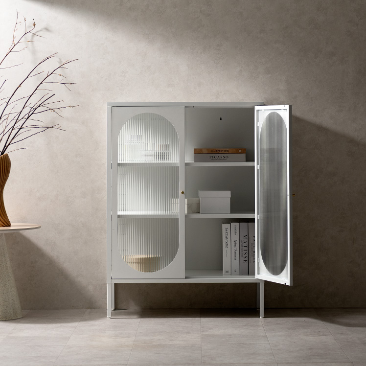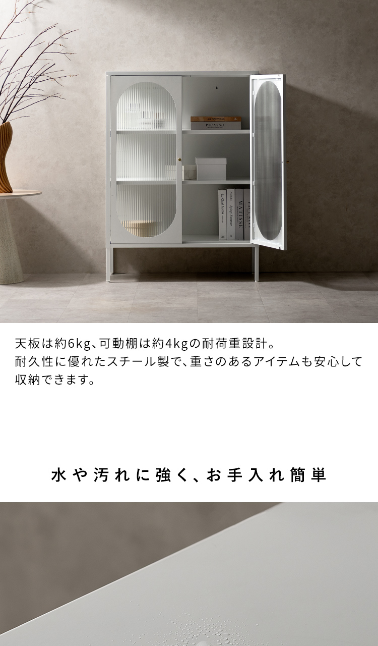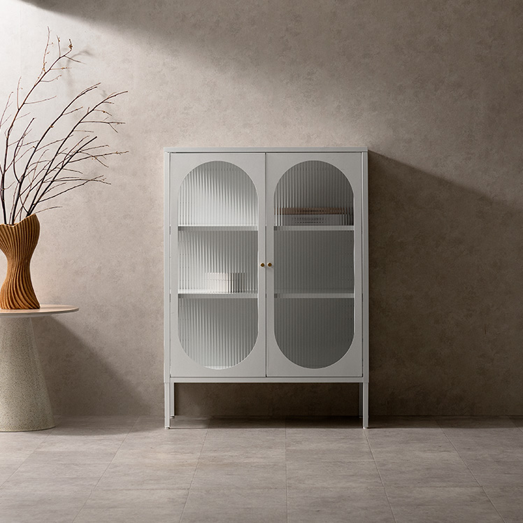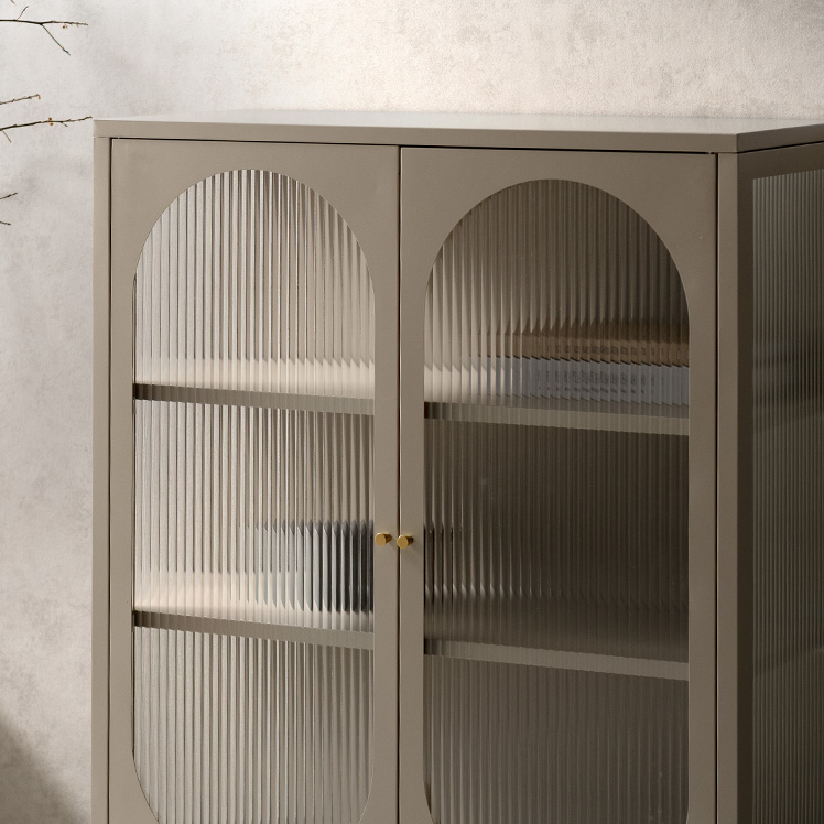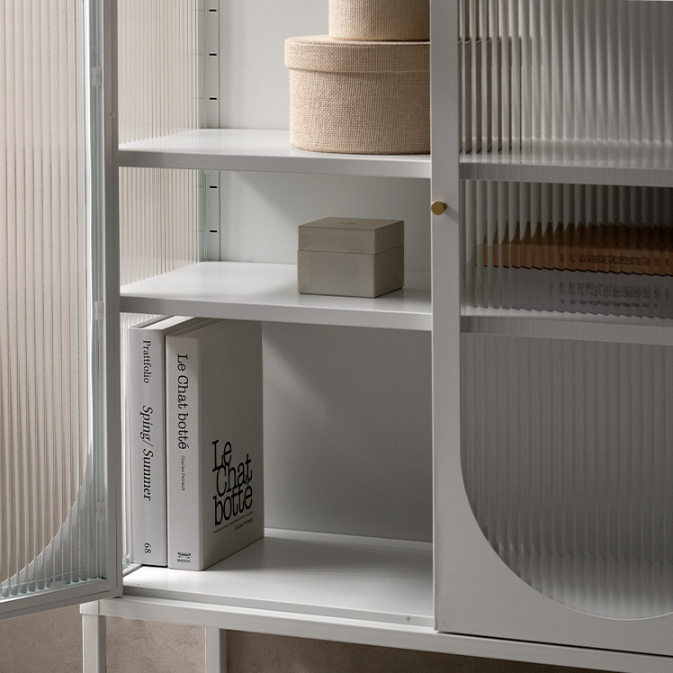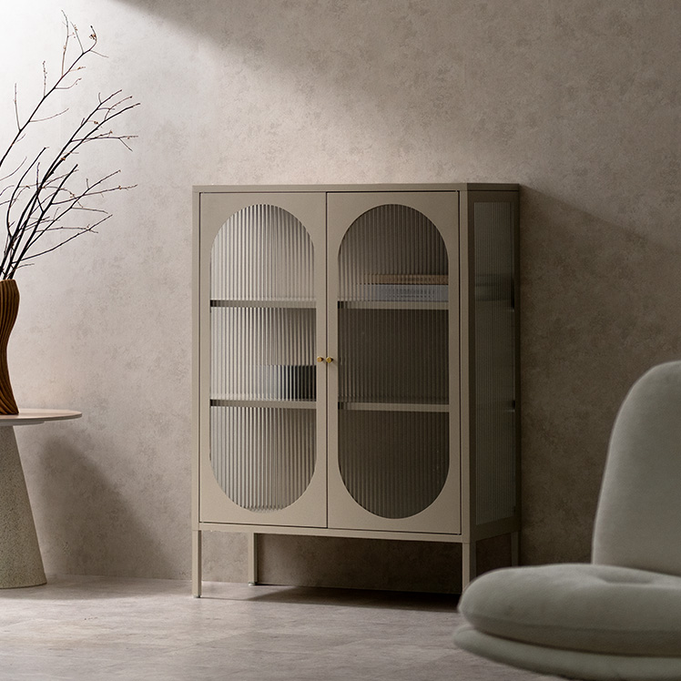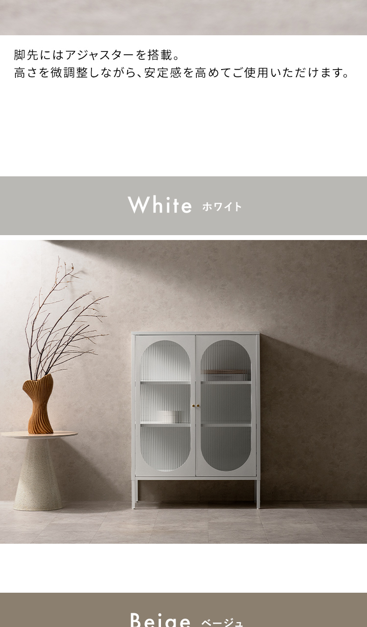 キャビネット Muun〔ムーン〕/クラシカルなアーチとモダンな直線を融合させた、タイムレスな美しさ。見せる収納を楽しむガラスキャビネット『Muun(ムーン)』。3段階で調整できる可動棚で、収納物に合わせた収納が可能。光を透過するガラス扉が飾る物を引き立て、軽やかな抜け感を演出します。