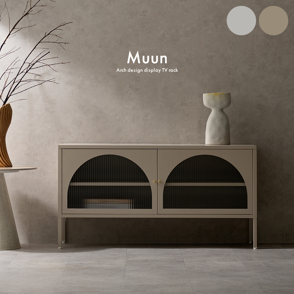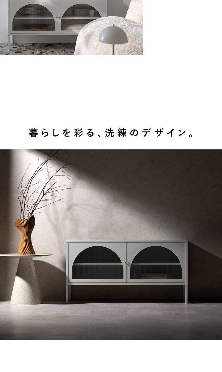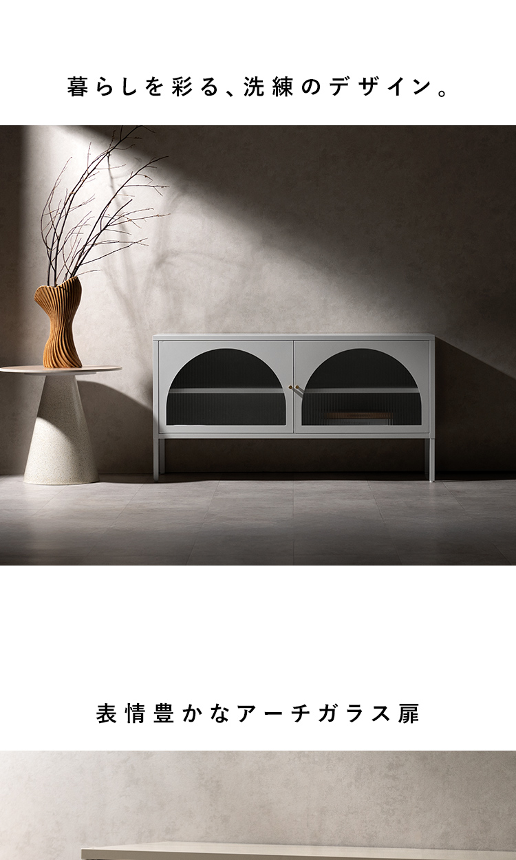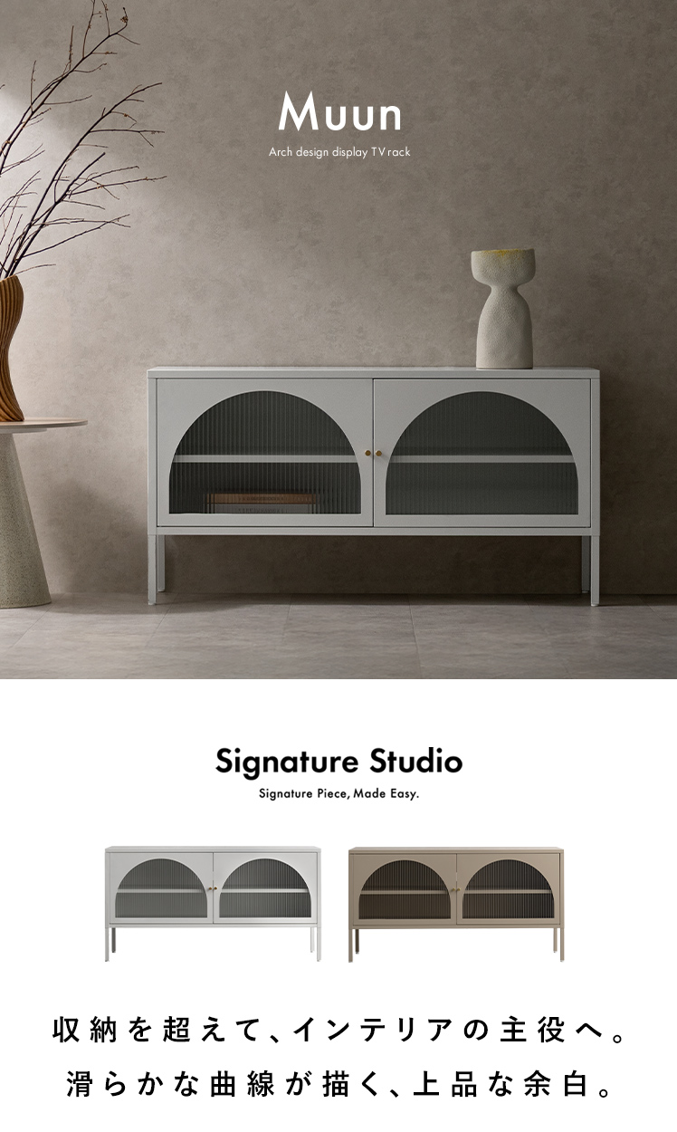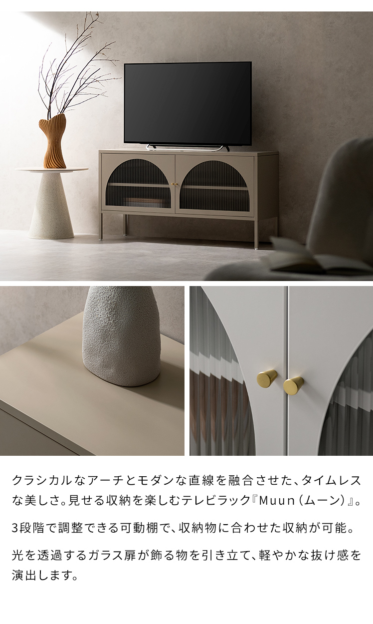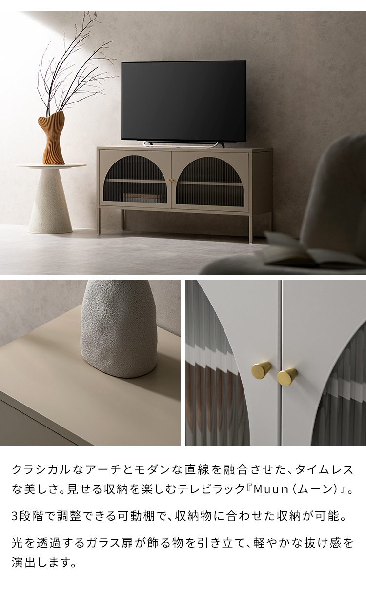 テレビボード Muun〔ムーン〕/クラシカルなアーチとモダンな直線を融合させた、タイムレスな美しさ。見せる収納を楽しむテレビラック『Muun(ムーン)』。3段階で調整できる可動棚で、収納物に合わせた収納が可能。光を透過するガラス扉が飾る物を引き立て、軽やかな抜け感を演出します。