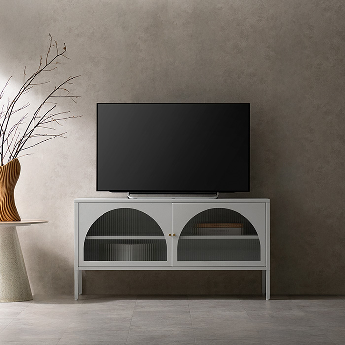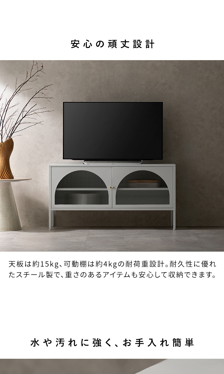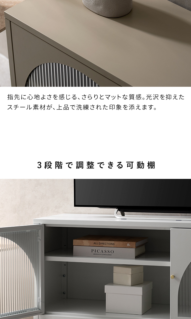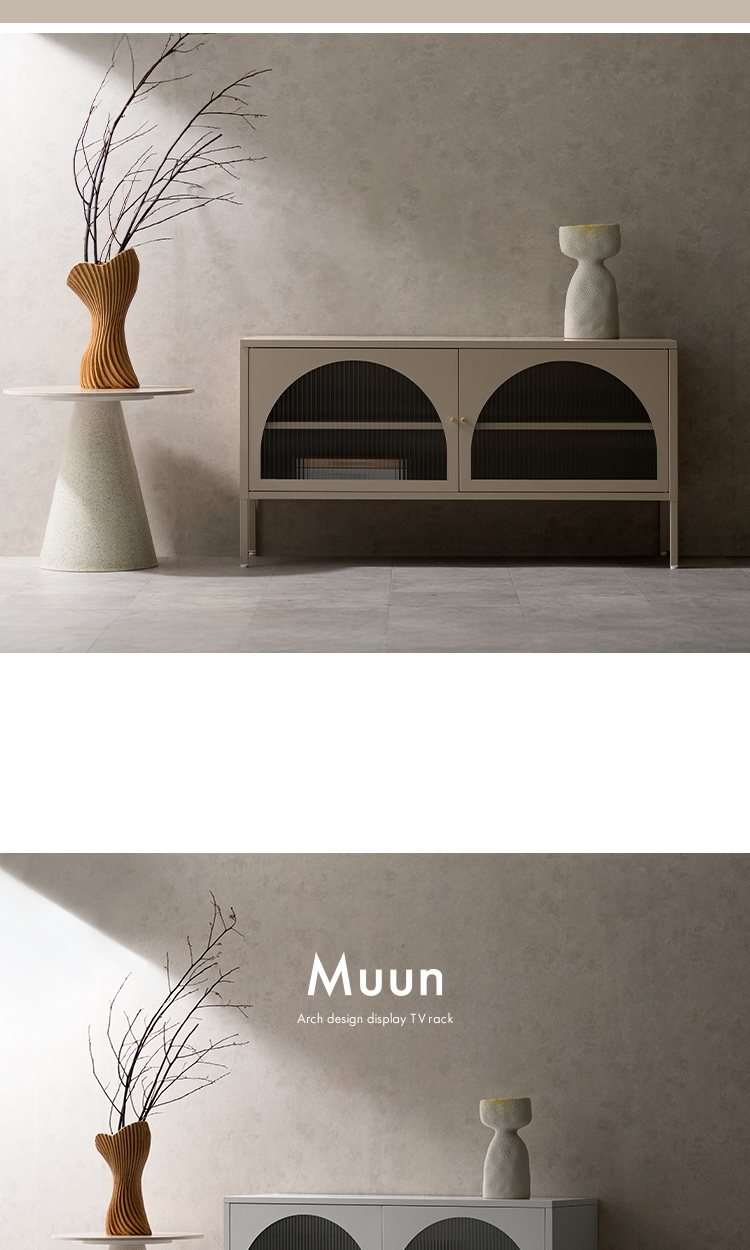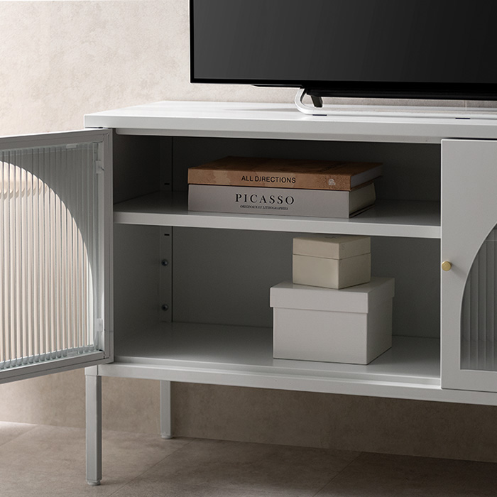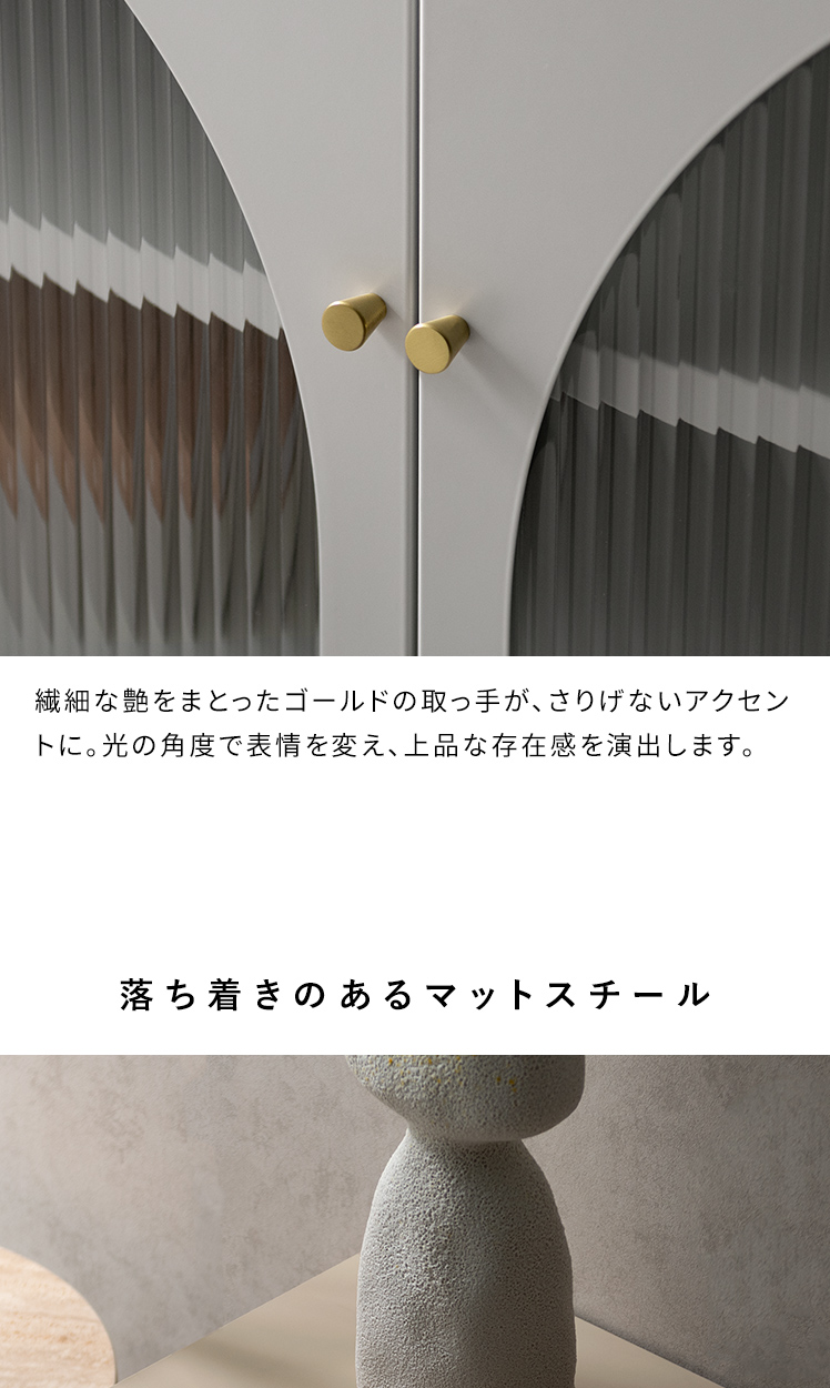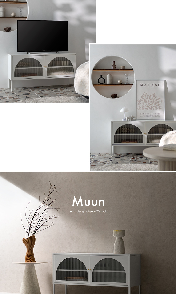 テレビボード Muun〔ムーン〕/クラシカルなアーチとモダンな直線を融合させた、タイムレスな美しさ。見せる収納を楽しむテレビラック『Muun(ムーン)』。3段階で調整できる可動棚で、収納物に合わせた収納が可能。光を透過するガラス扉が飾る物を引き立て、軽やかな抜け感を演出します。