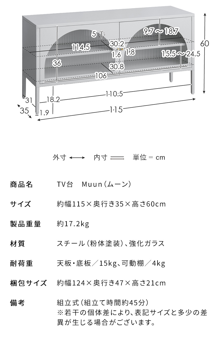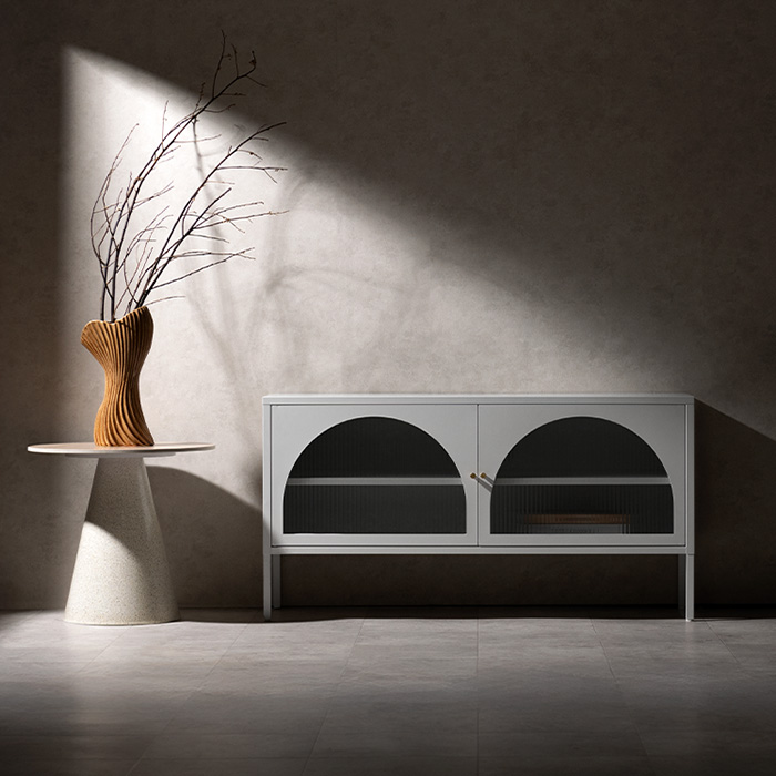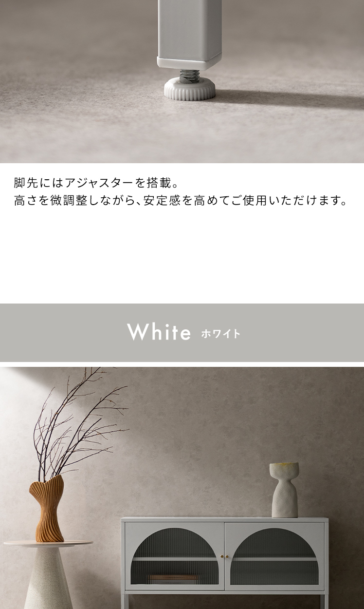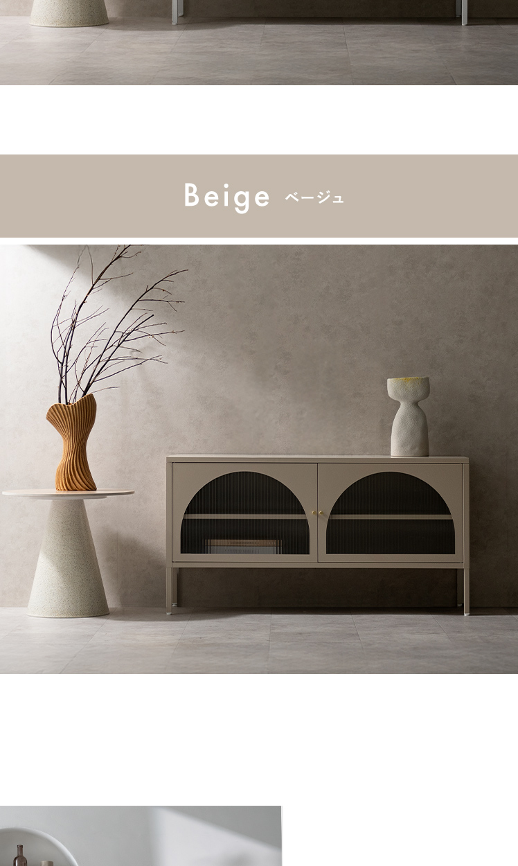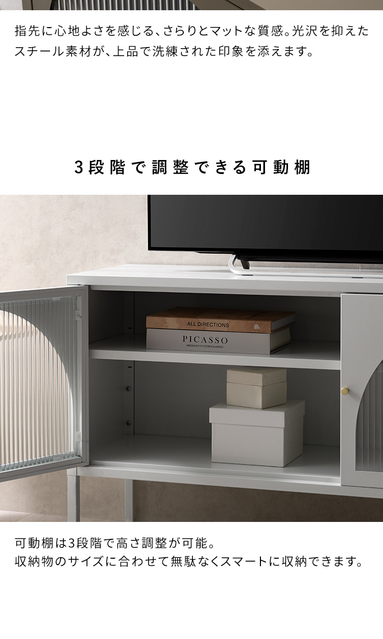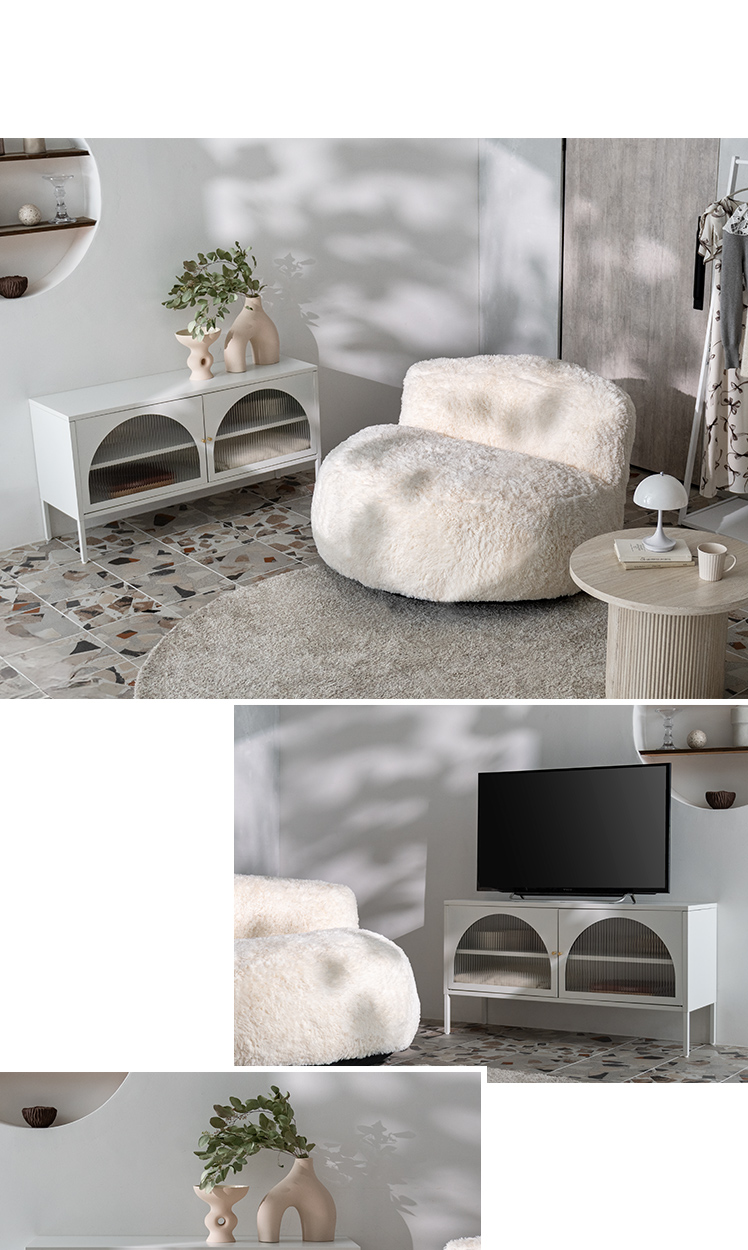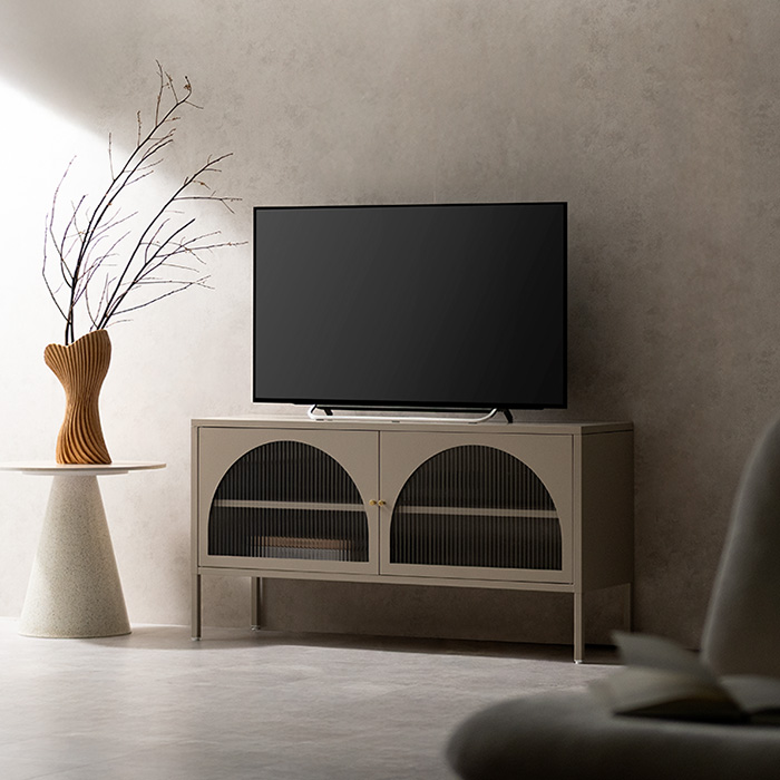 テレビボード Muun〔ムーン〕/クラシカルなアーチとモダンな直線を融合させた、タイムレスな美しさ。見せる収納を楽しむテレビラック『Muun(ムーン)』。3段階で調整できる可動棚で、収納物に合わせた収納が可能。光を透過するガラス扉が飾る物を引き立て、軽やかな抜け感を演出します。