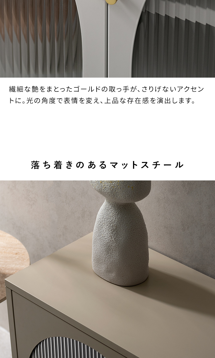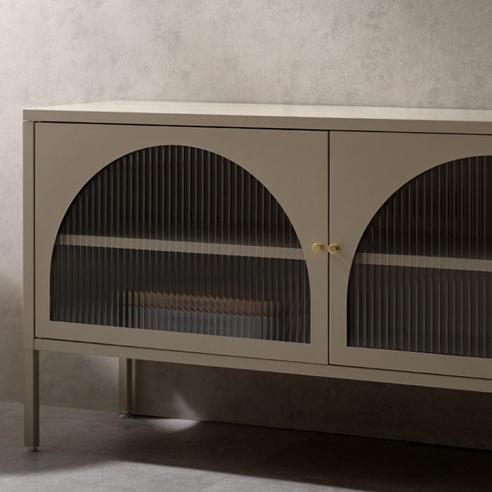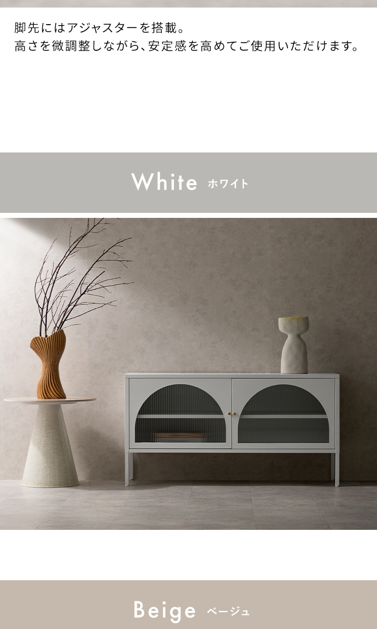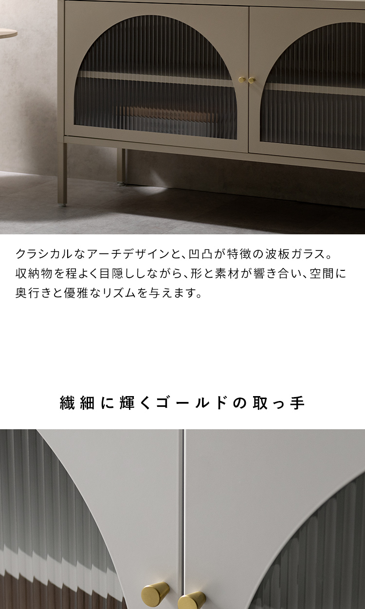ローボード キャビネット テレビ台 ナチュラル クラシカル モダン アーチ ガラス扉 ガラス棚 スチール 収納 オフィス 事務所 店舗 おしゃれ くすみカラー ベージュ ホワイト