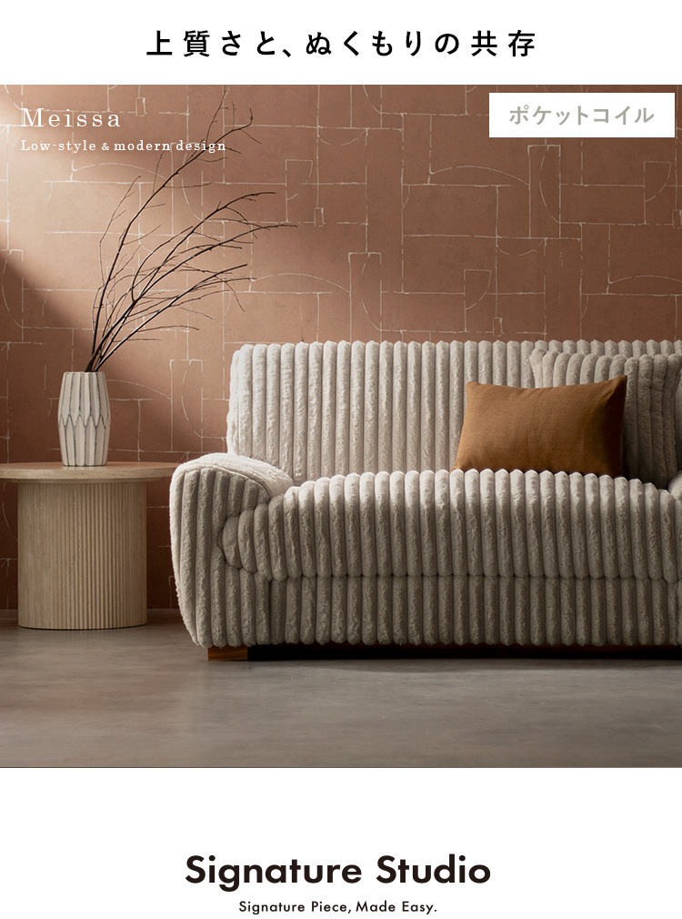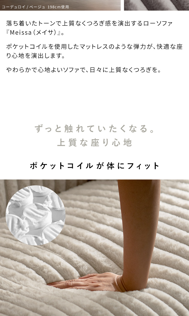 2Pソファ Meissa〔メイサ〕/落ち着いたトーンで上質なくつろぎ感を演出するローソファ『Meissa(メイサ)』。ポケットコイルを使用したマットレスのような弾力が、快適な座り心地を演出します。やわらかで心地よいソファで、日々に上質なくつろぎを。
