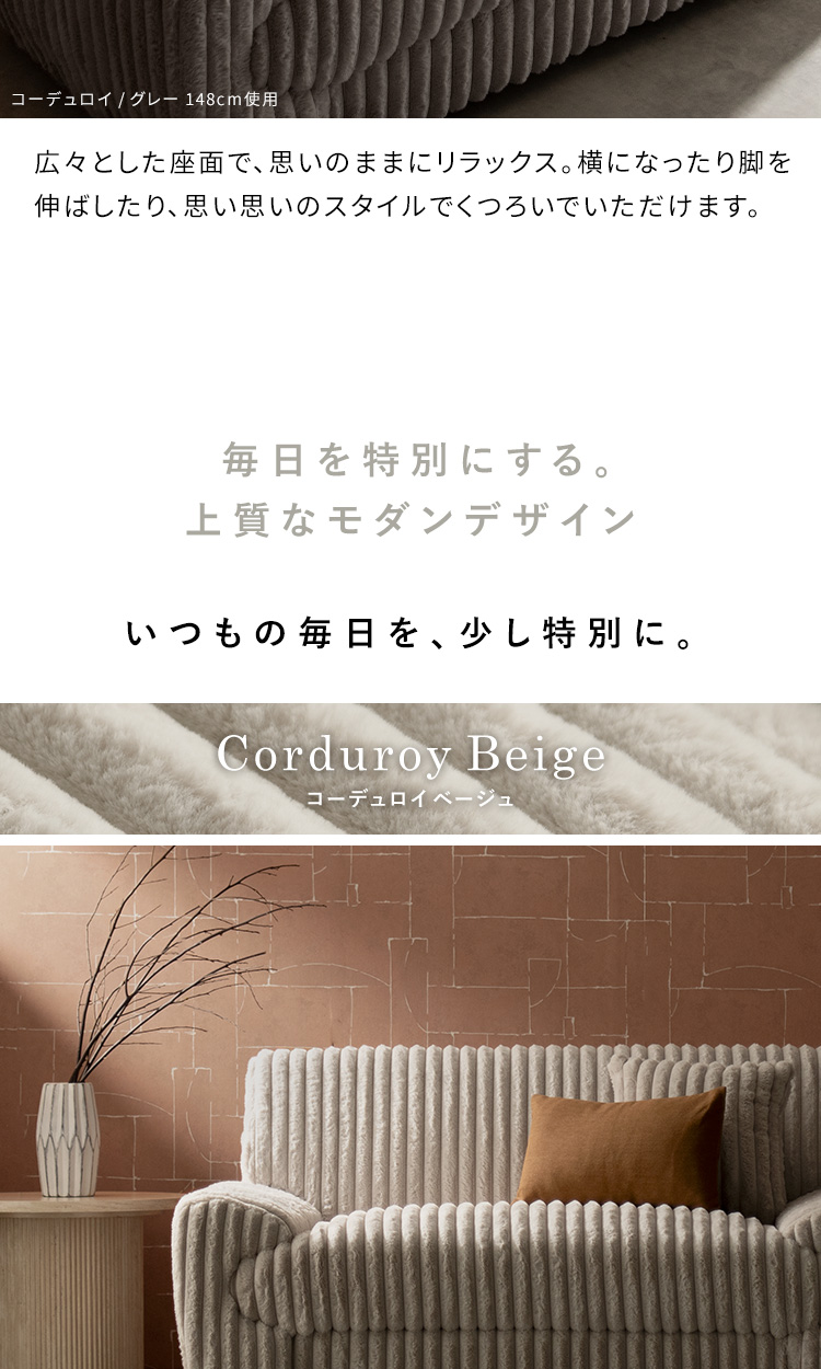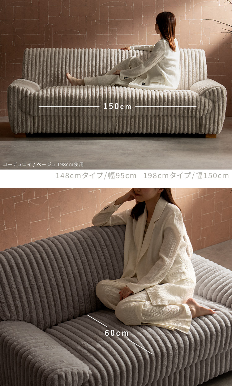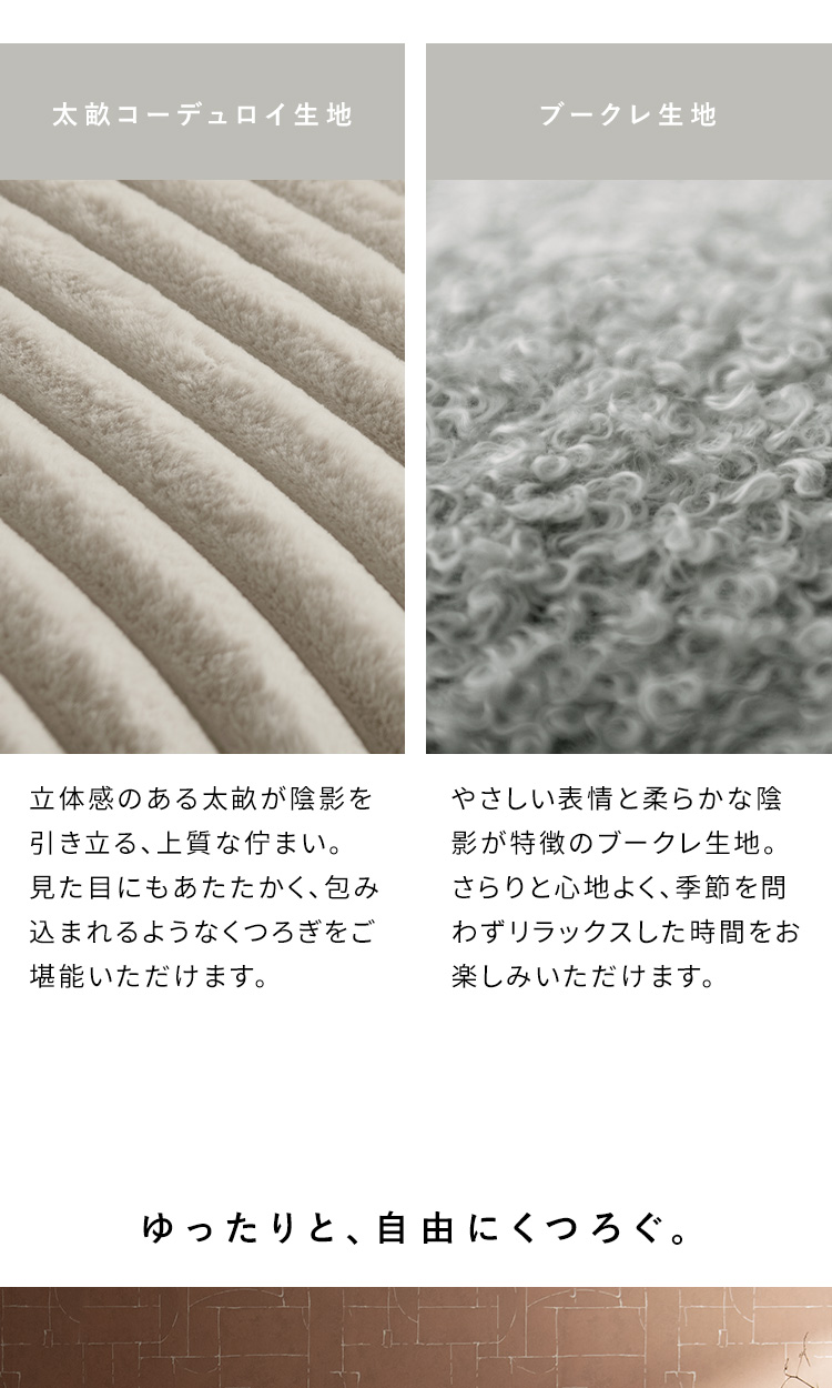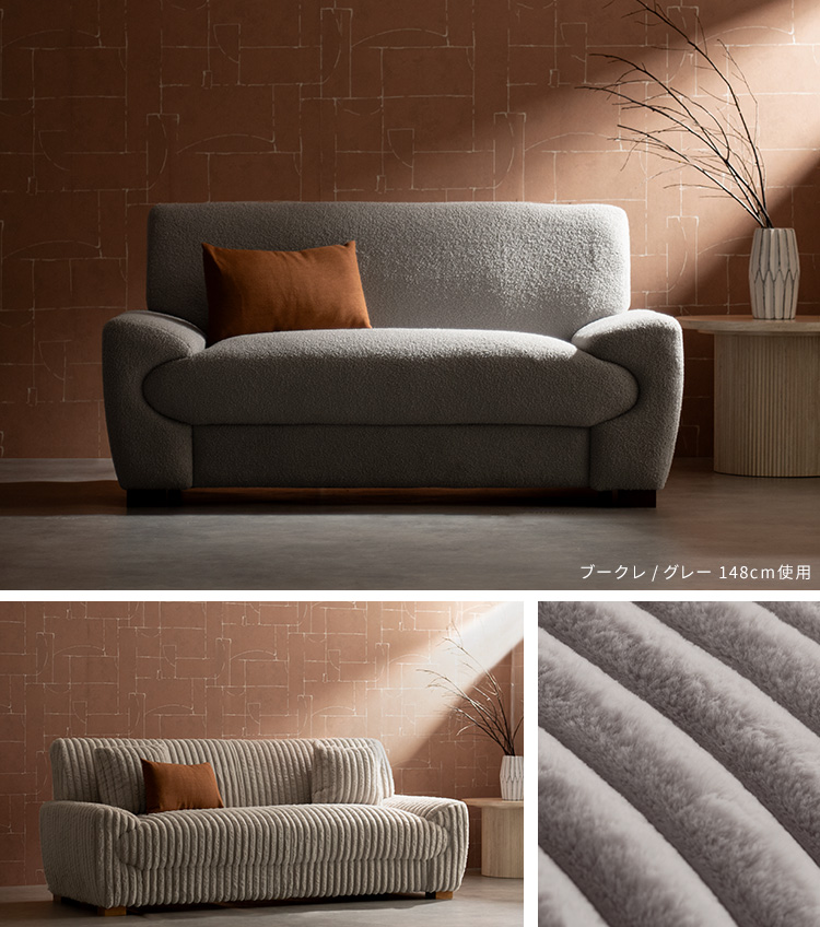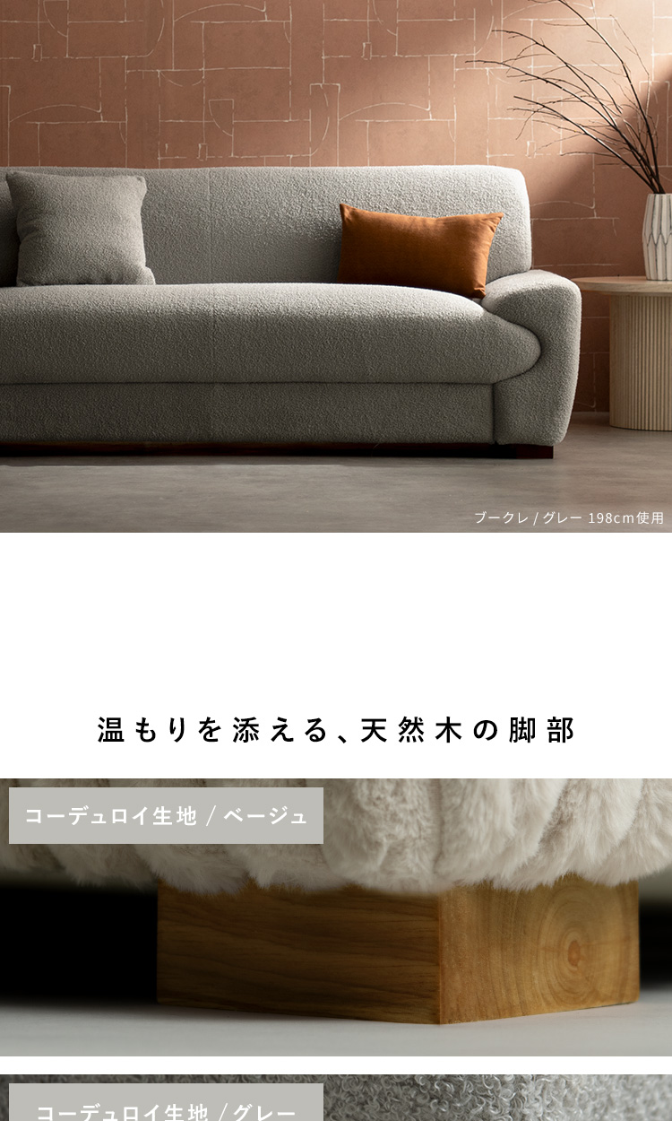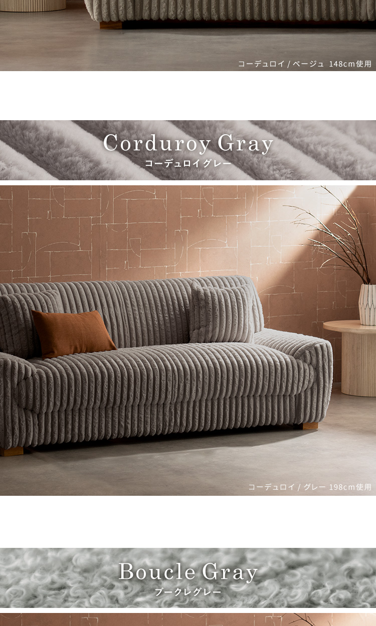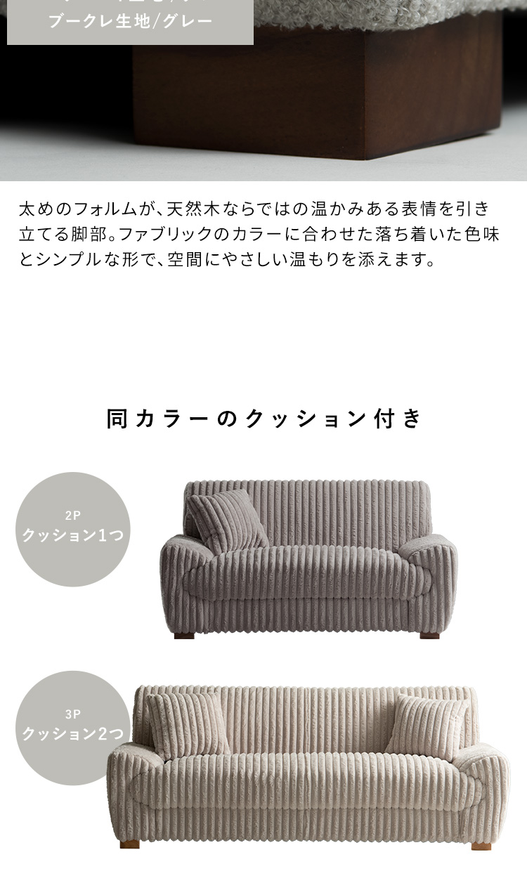 2人掛け ブークレ生地 太畝コーデュロイ生地 クッション付き モダン 天然木 フェザー ポケットコイル ファブリック ベージュ グレー