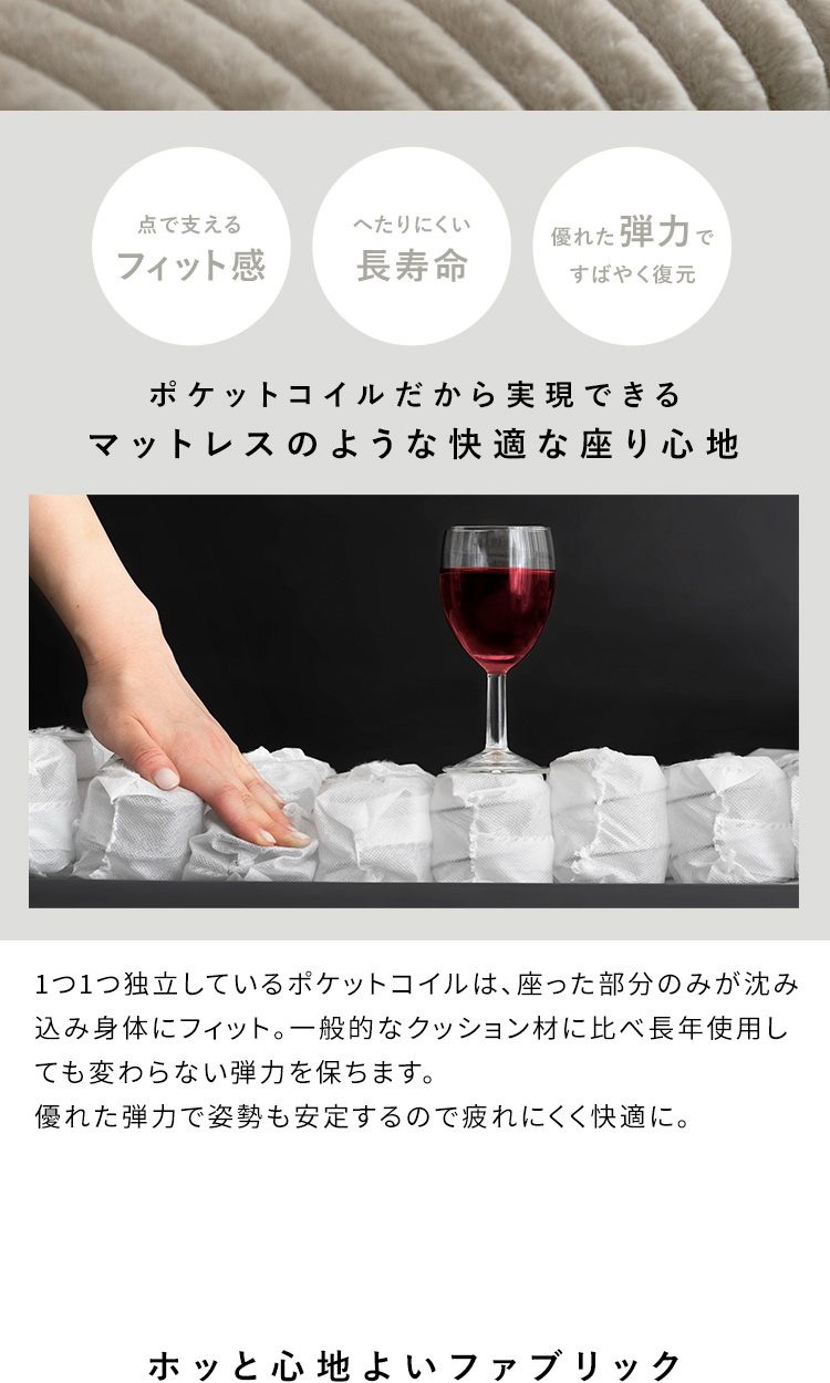 | 材質 | 本体/ウレタンフォーム、ポケットコイル 脚/天然木 張地/ポリエステル |