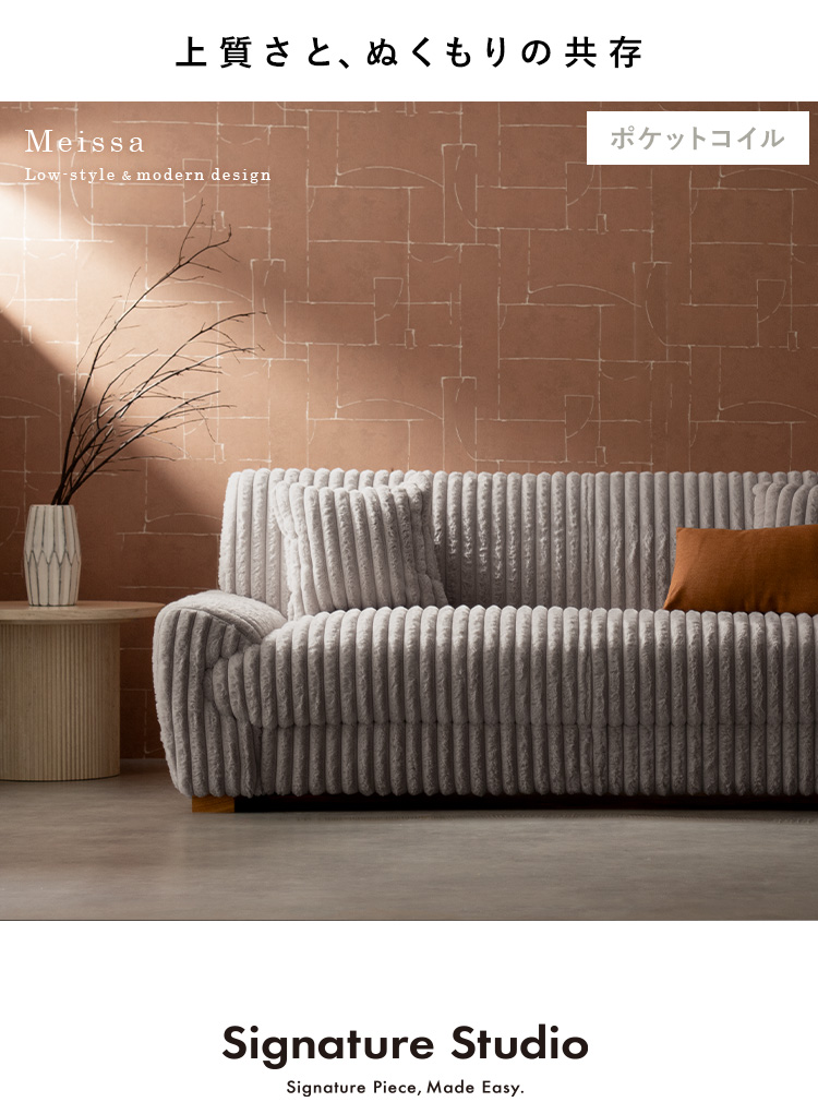 3Pソファ Meissa〔メイサ〕/落ち着いたトーンで上質なくつろぎ感を演出するローソファ『Meissa(メイサ)』。ポケットコイルを使用したマットレスのような弾力が、快適な座り心地を演出します。やわらかで心地よいソファで、日々に上質なくつろぎを。