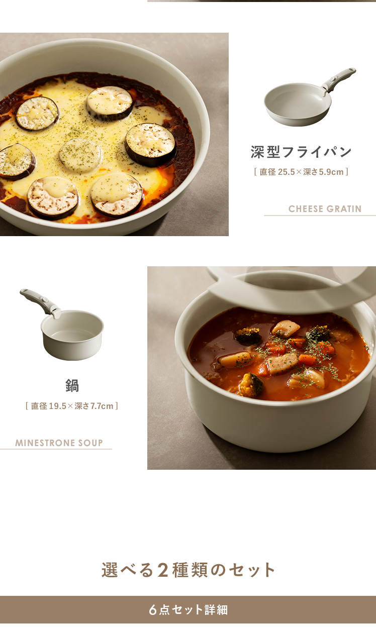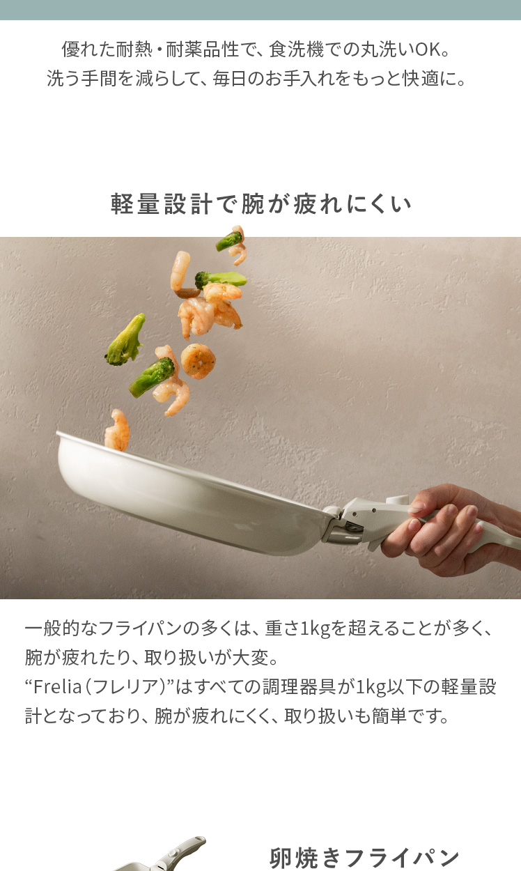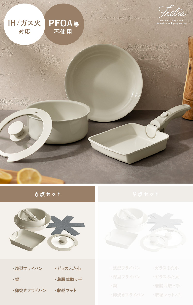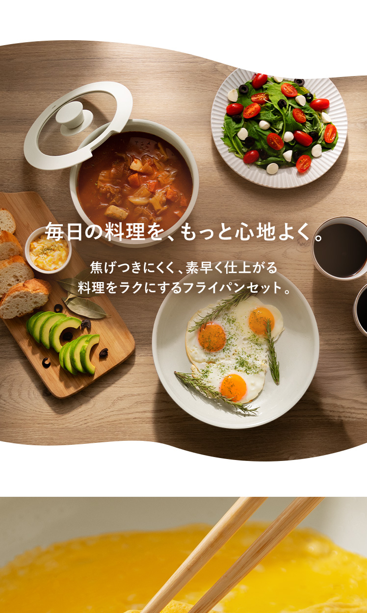フライパンセットFrelia〔フレリア〕6点セット/焦げつきにくく、素早く仕上がる料理をラクにするフライパンセット。