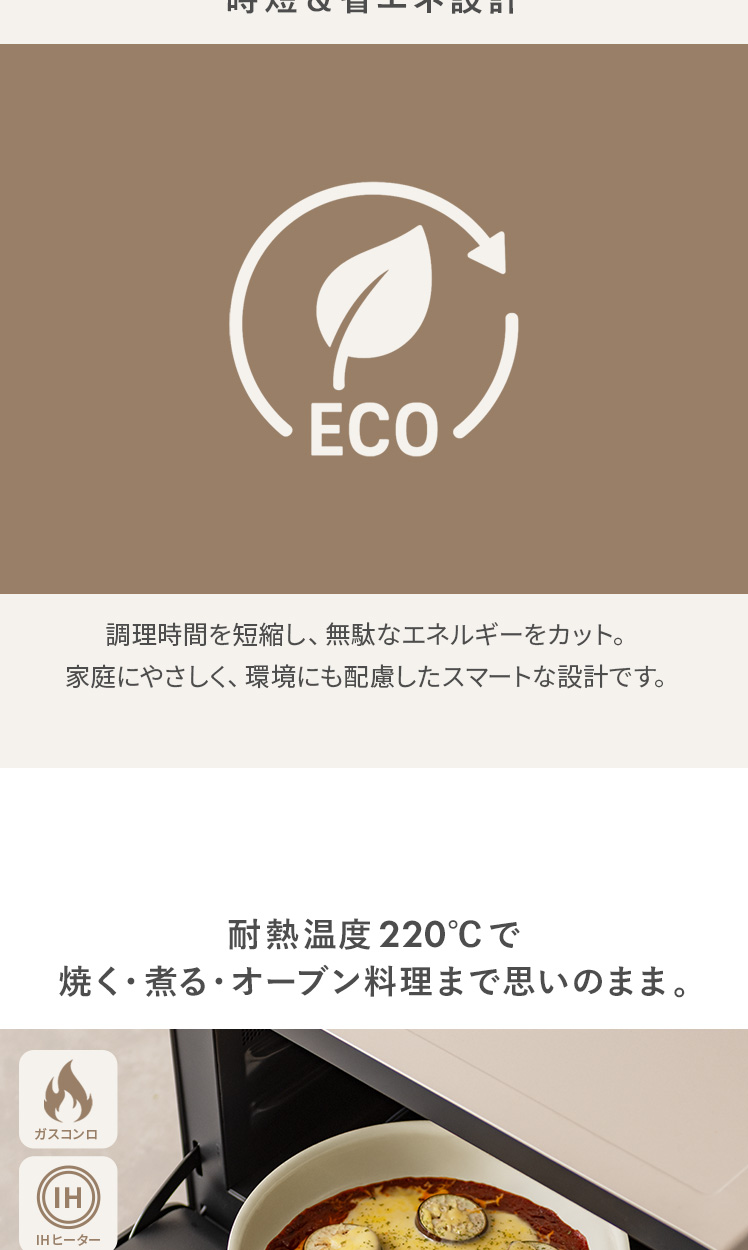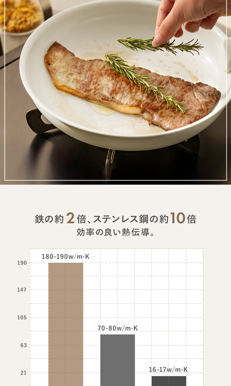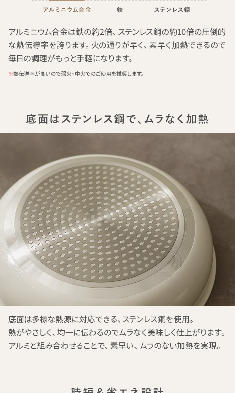 | 素材 | フライパン・鍋/アルミニウム合金(内側表面セラミックコーティング)、ステンレス ガラスふた/シリコン、ガラス |