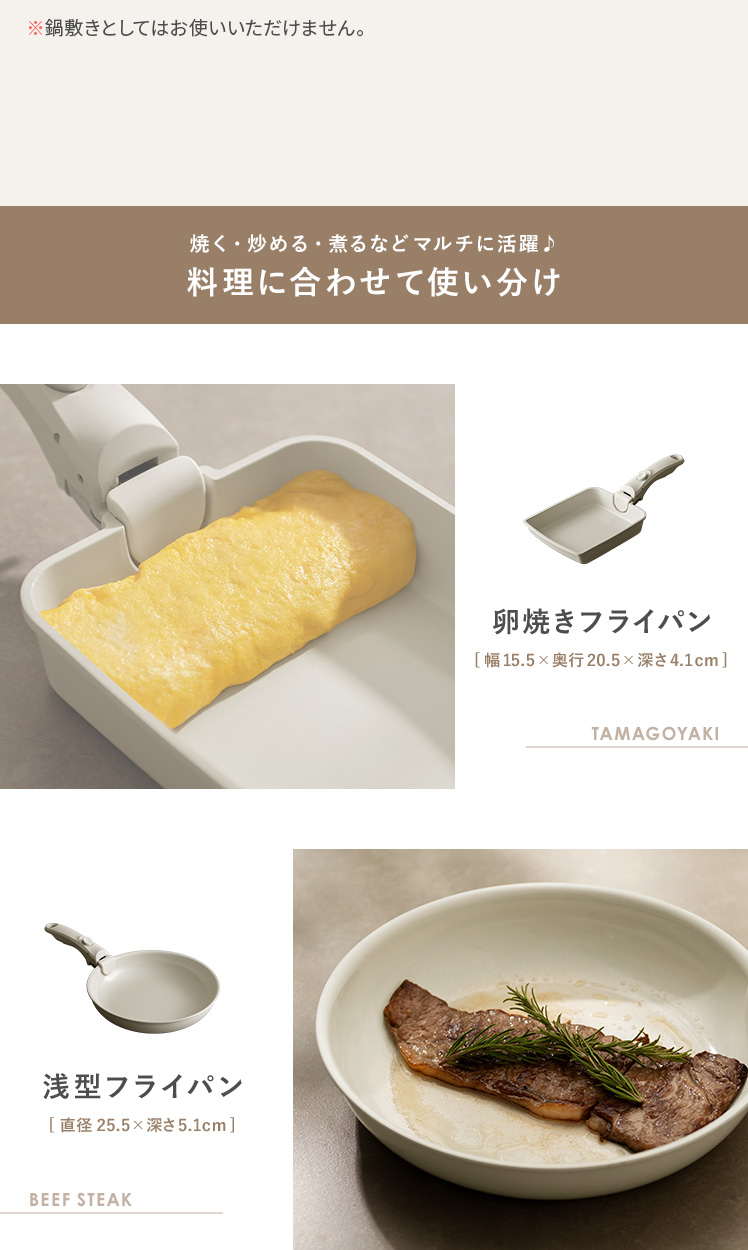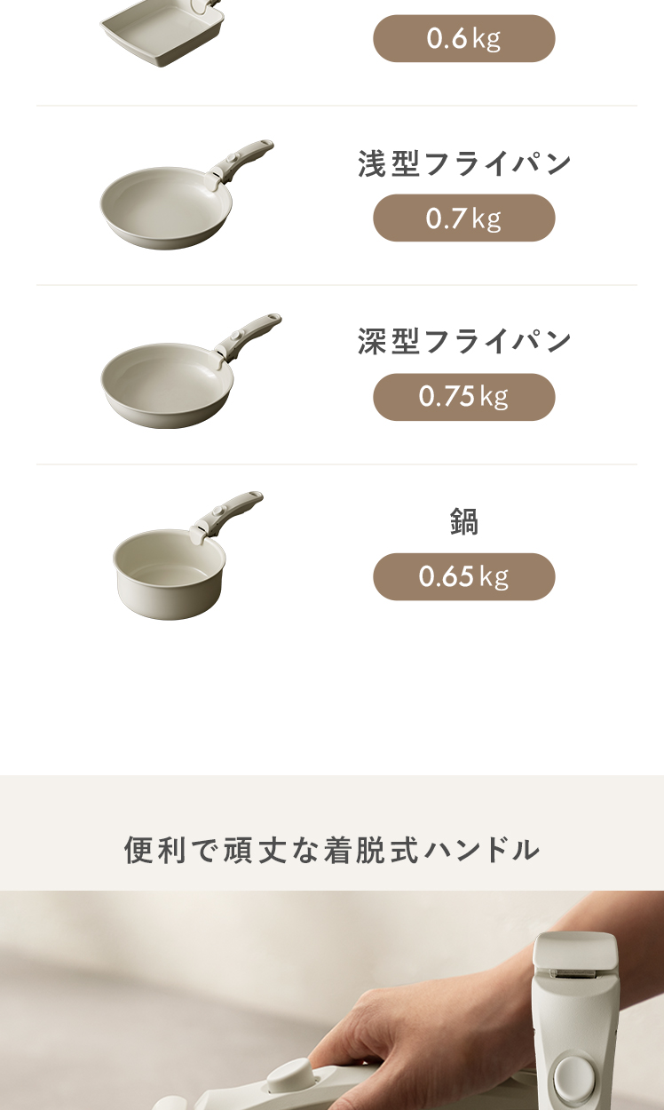 | サイズ(外寸) | 浅型フライパン/約幅25.5×奥行き25.5×高さ5.1cm(約500g) 鍋/約幅19.5×奥行き19.5×高さ7.7cm(約450g) 卵焼きフライパン/約幅15.5×奥行き20.5×高さ4.1cm(約400g) 着脱式取っ手/約幅4.2×奥行き18.8×高さ4.7cm(約200g) ガラスふた小/約幅19.2×奥行き19.2×高さ3.7cm(約300g) 収納マット/約幅30×奥行き30×高さ0.2cm |