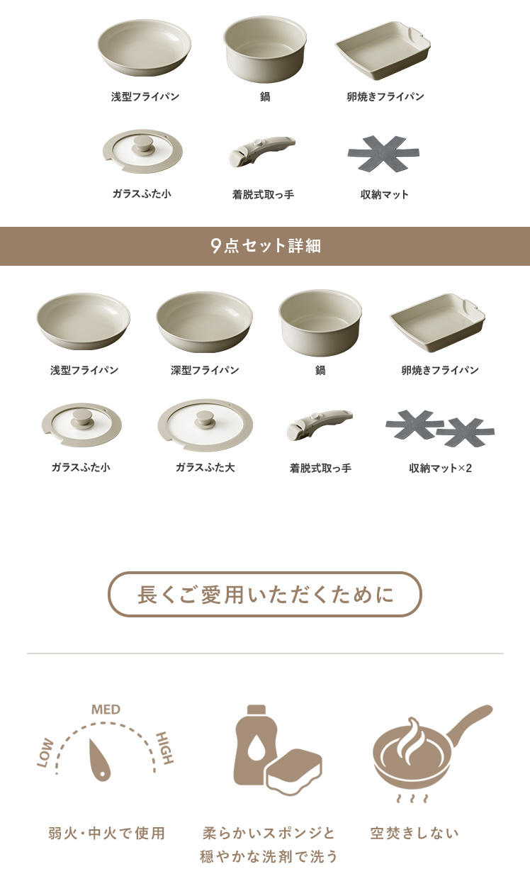 | セット内容 | 浅型フライパン、鍋、卵焼きフライパン、着脱式取っ手、ガラスふた小、収納マット |