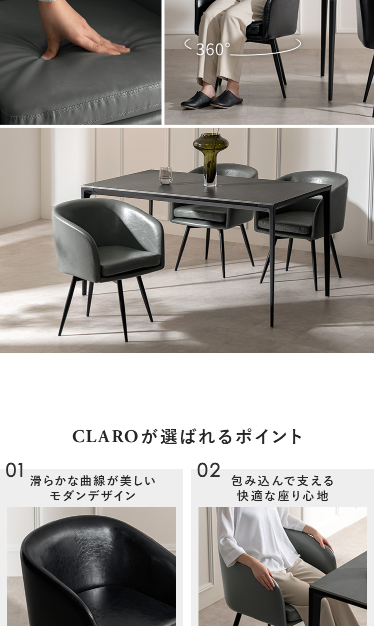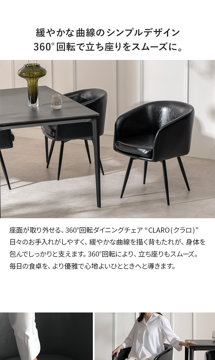 ダイニングチェアCLARO〔クラロ〕1脚単品販売/座面が取り外せる、360°回転ダイニングチェア“CLARO(クラロ)”日々のお手入れがしやすく、緩やかな曲線を描く背もたれが、身体を包んでしっかりと支えます。360°回転により、立ち座りもスムーズ。毎日の食卓を、より優雅で心地よいひとときへと導きます。