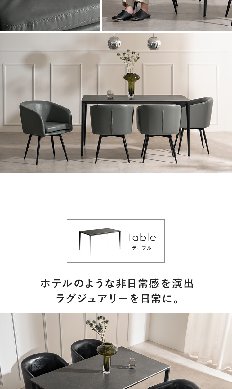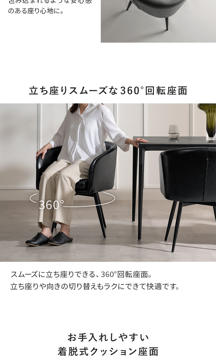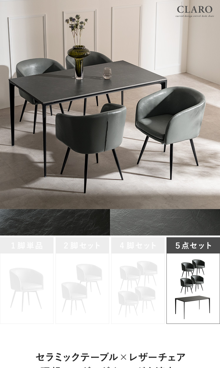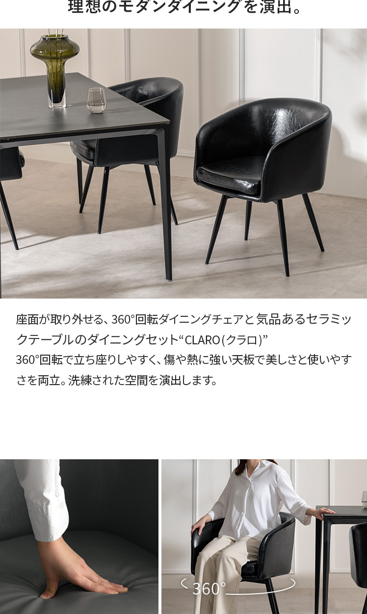 ダイニングチェアCLARO〔クラロ〕ダイニング5点セット/座面が取り外せる、360°回転ダイニングチェア“CLARO(クラロ)”日々のお手入れがしやすく、緩やかな曲線を描く背もたれが、身体を包んでしっかりと支えます。360°回転により、立ち座りもスムーズ。毎日の食卓を、より優雅で心地よいひとときへと導きます。