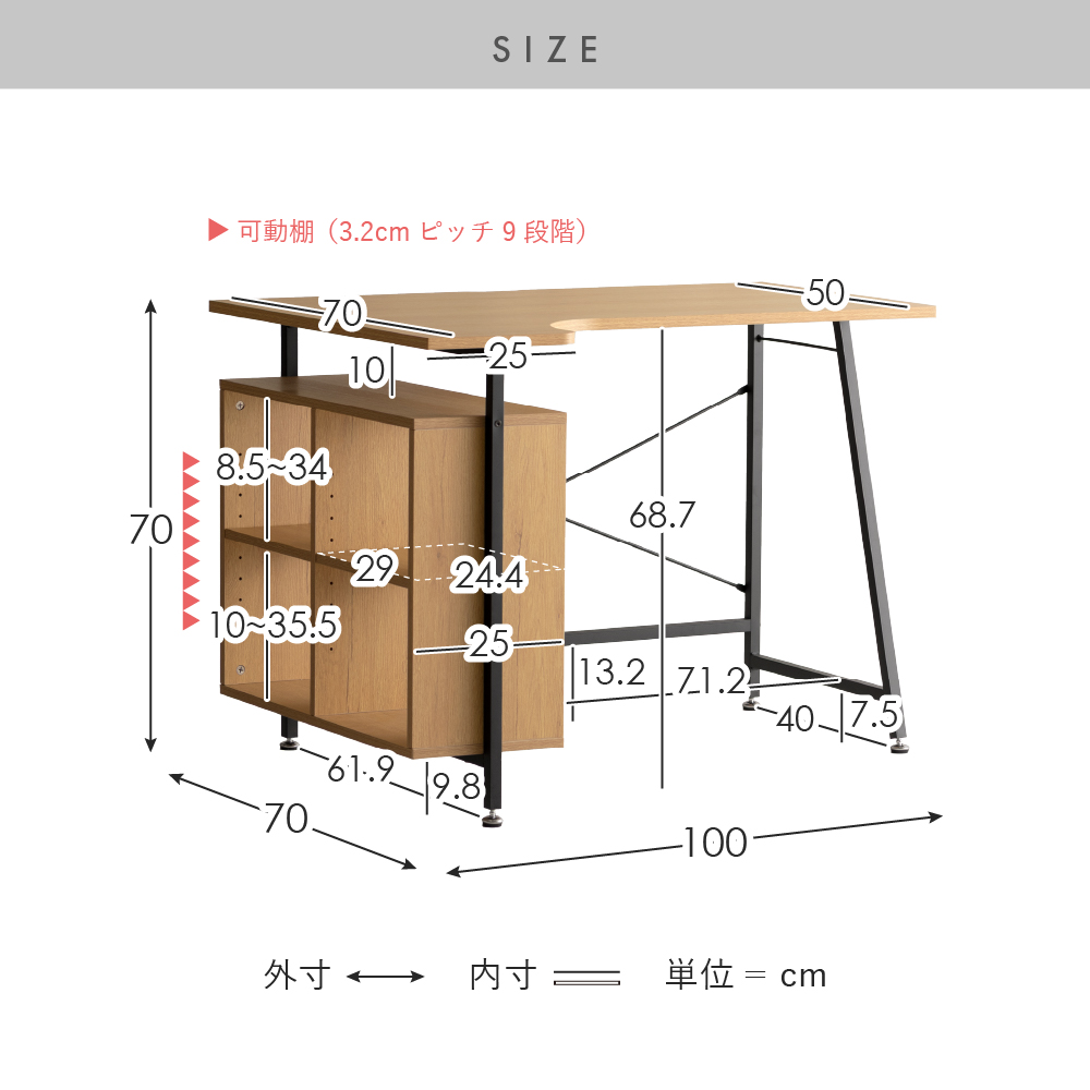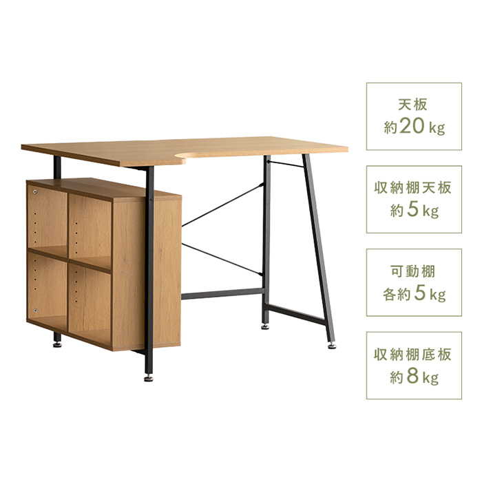 耐荷重 | 天板/20kg、収納棚天板/5kg、可動棚/各5kg、棚下段/各8kg |