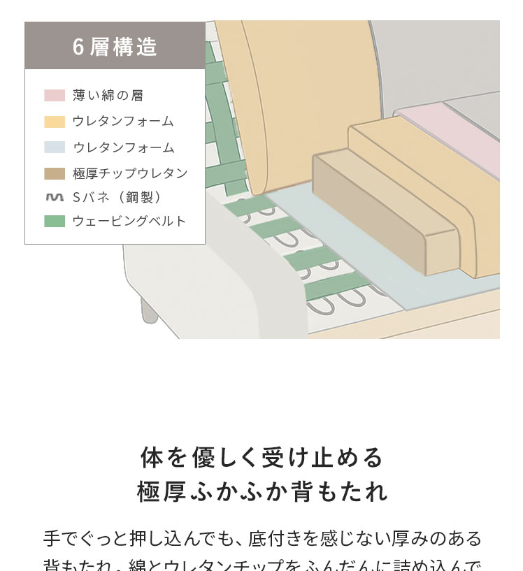 | 中材 | 鋼製バネ、ウレタン、ウェービングベルト、ウレタンフォーム |