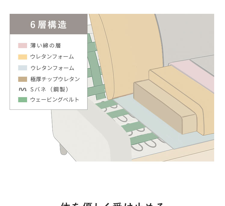 | 中材 | 鋼製バネ、ウレタン、ウェービングベルト、ウレタンフォーム |